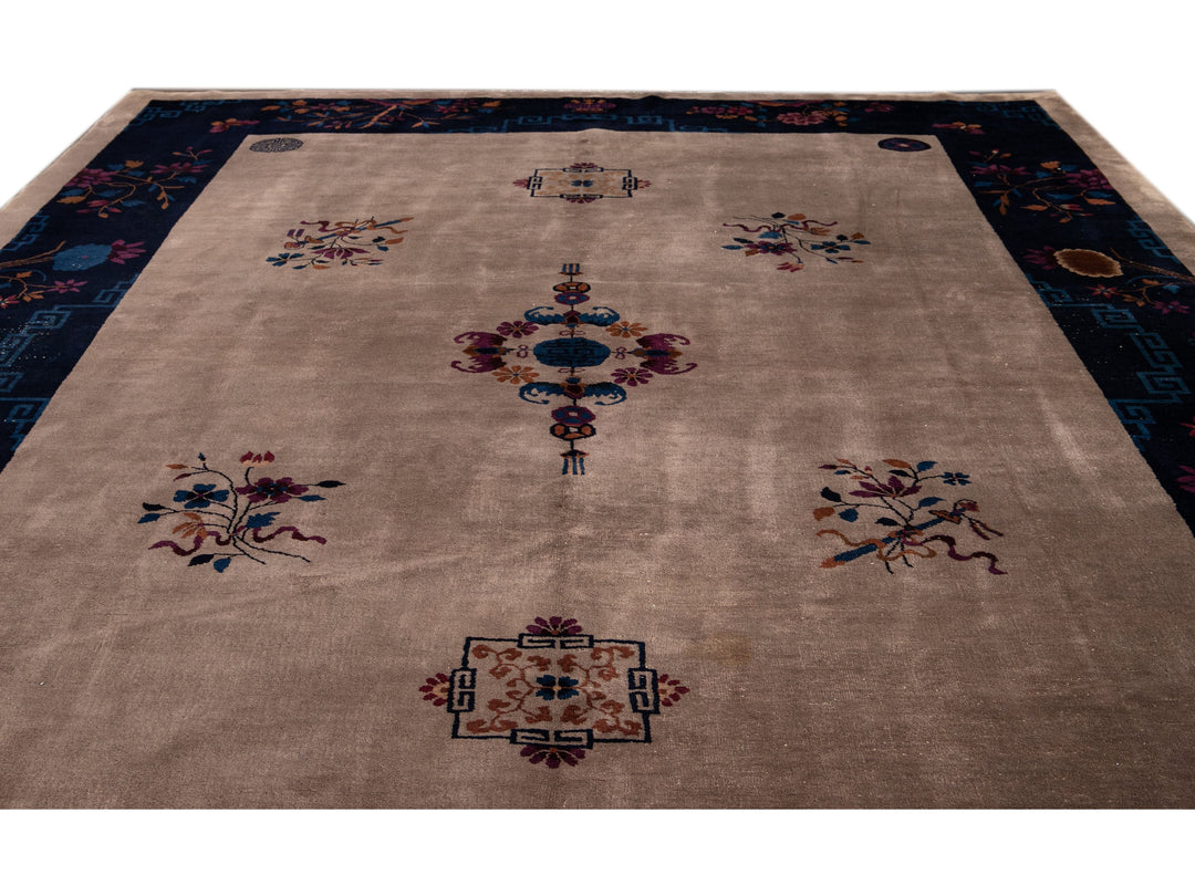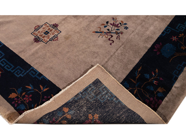 Beautiful antique Peking Chinese hand-knotted wool rug with a brown field. This Chinese rug has a blue frame, multi-color accents in a gorgeous all-over Chinese medallion floral design.