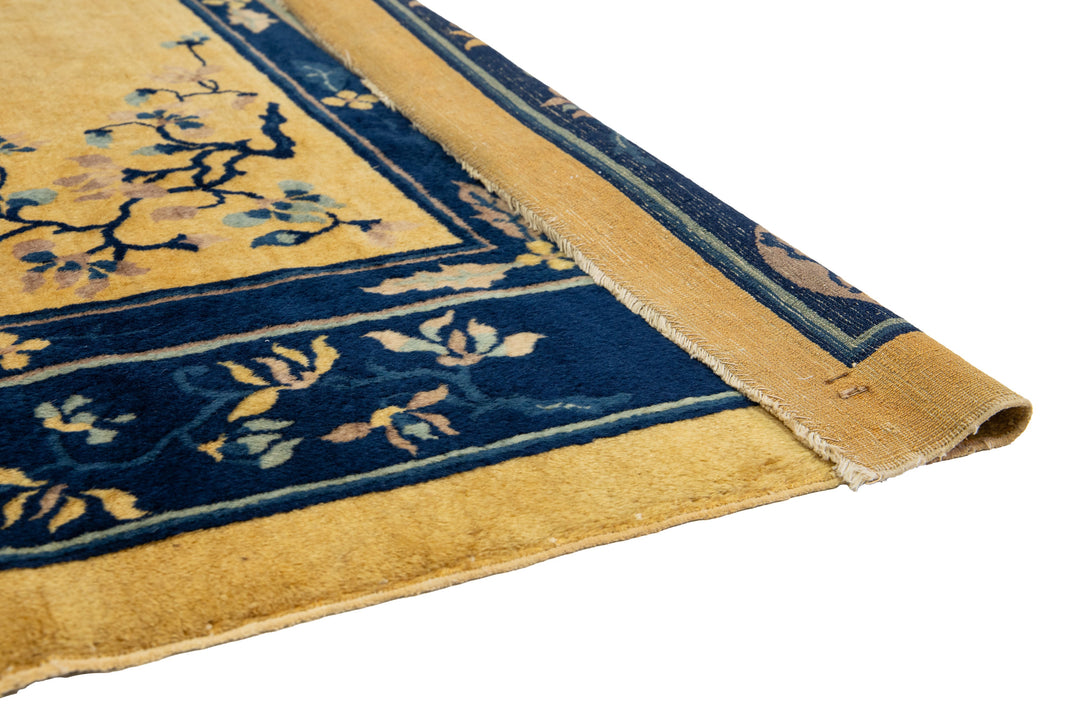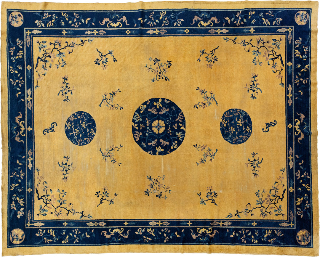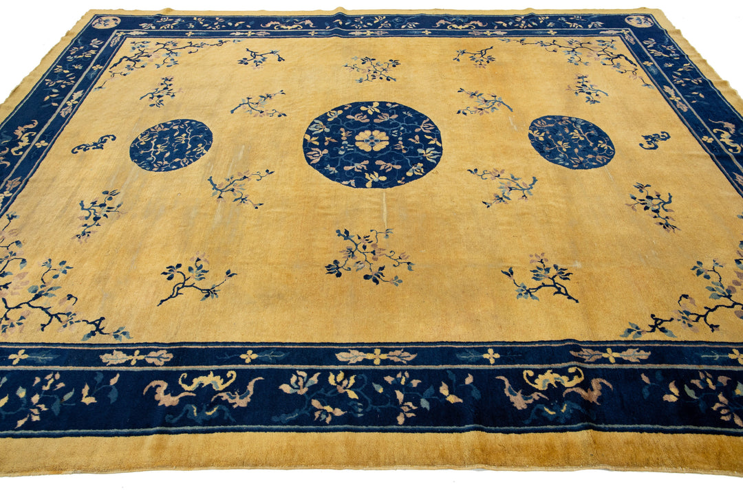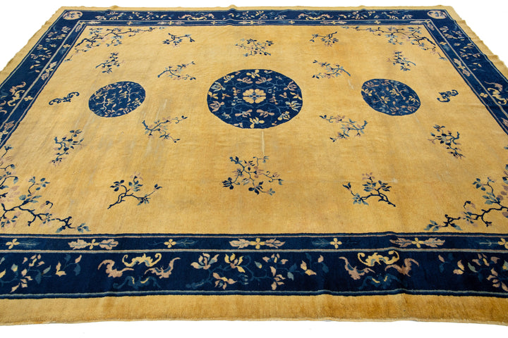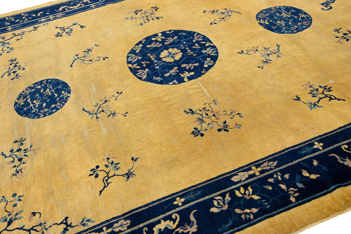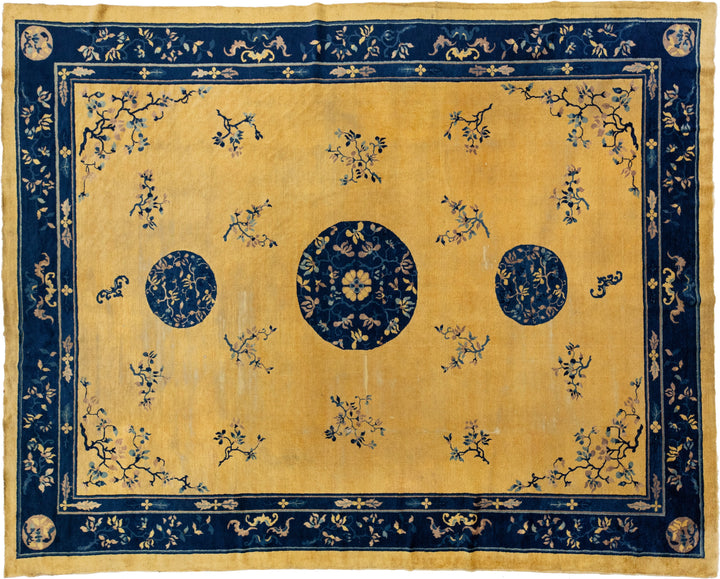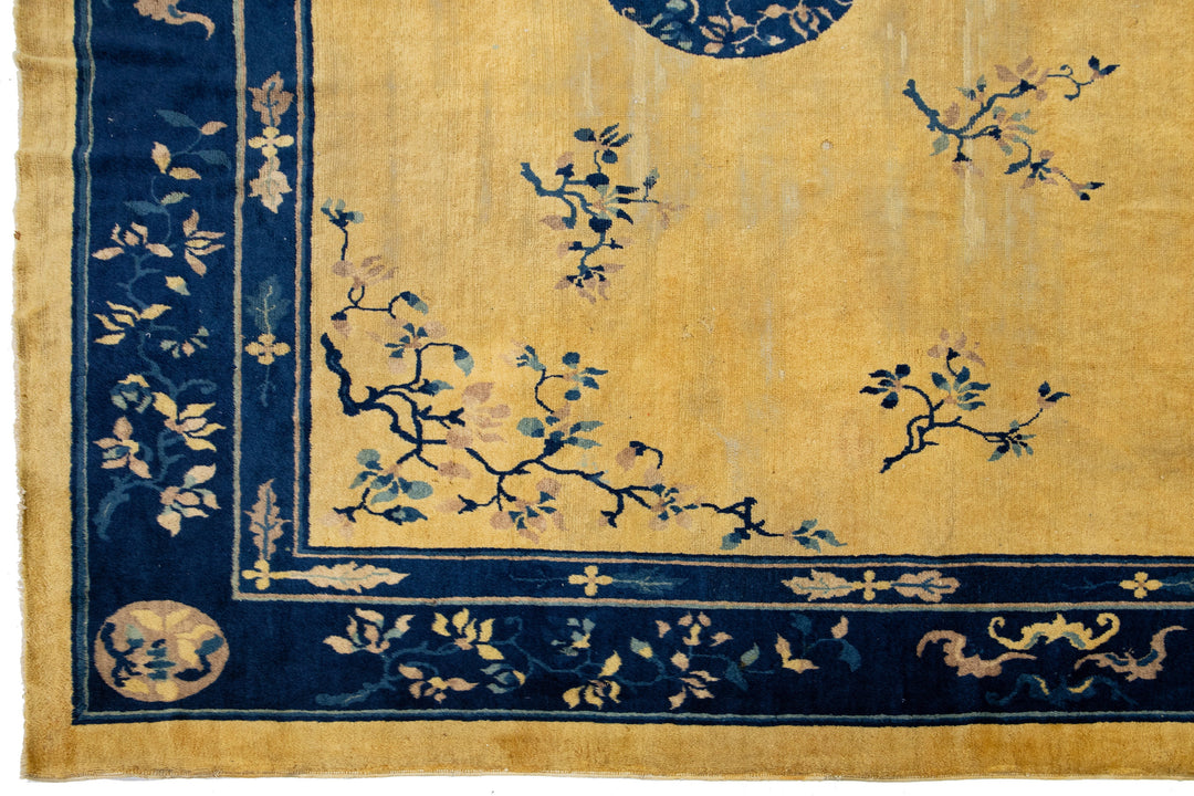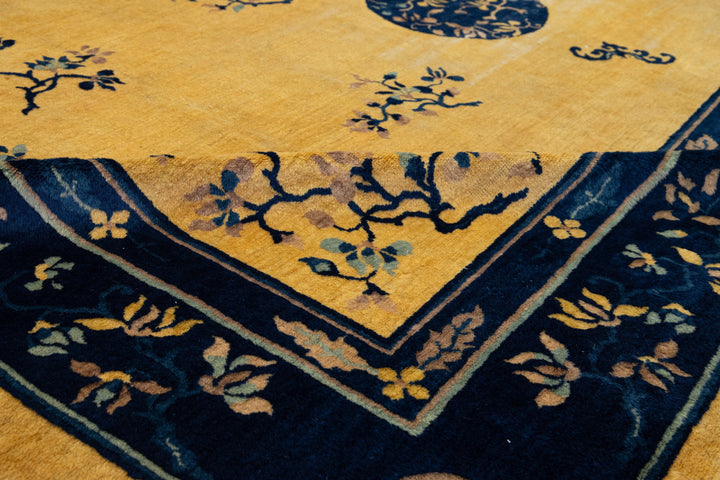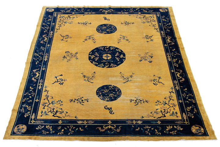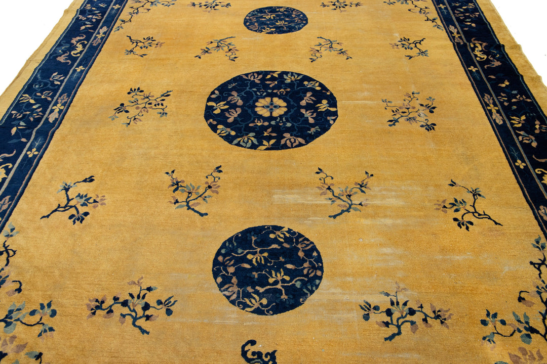 This elegant antique Peking Chinese wool rug features a goldenrod field with a decorative border and navy blue accents, showcasing a stunning classic Chinese motif. This rug measures 9'1'' x 11'5''.