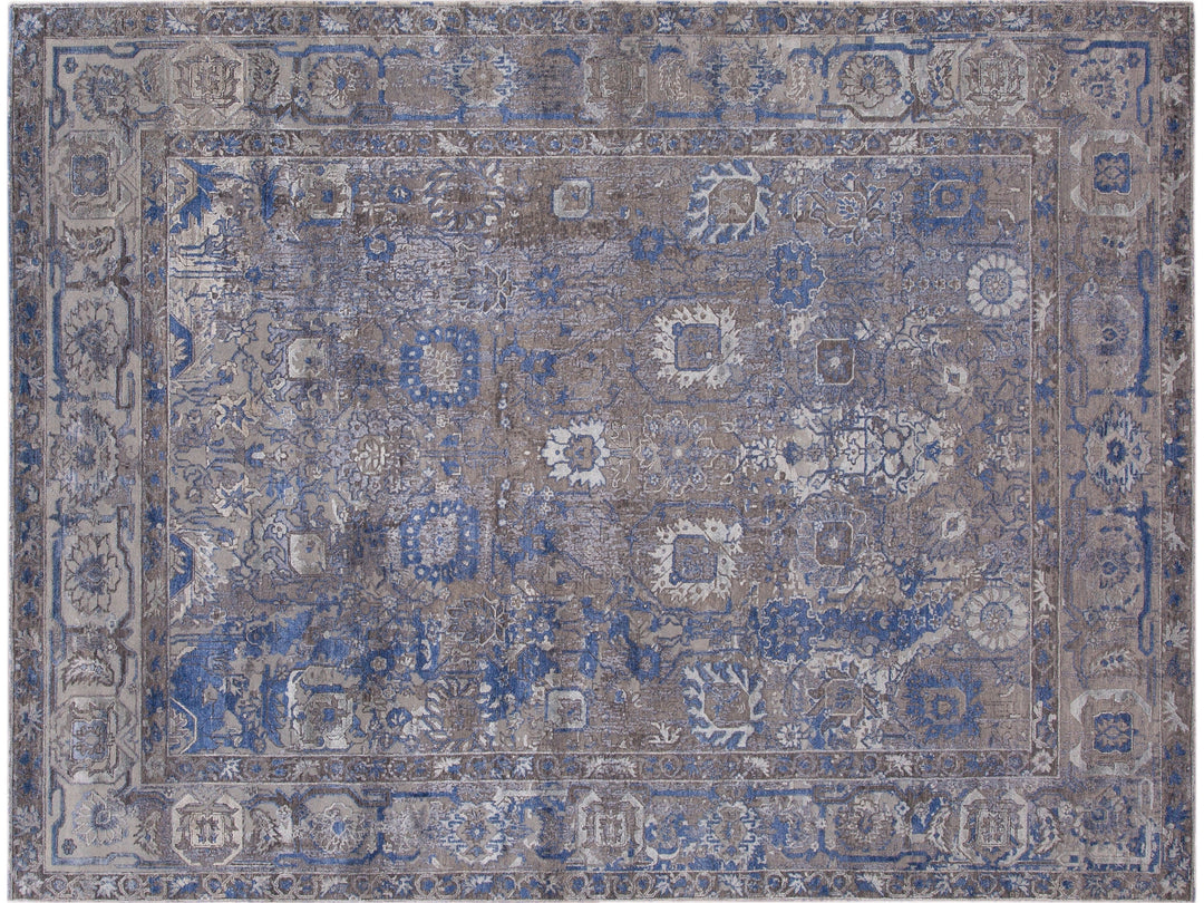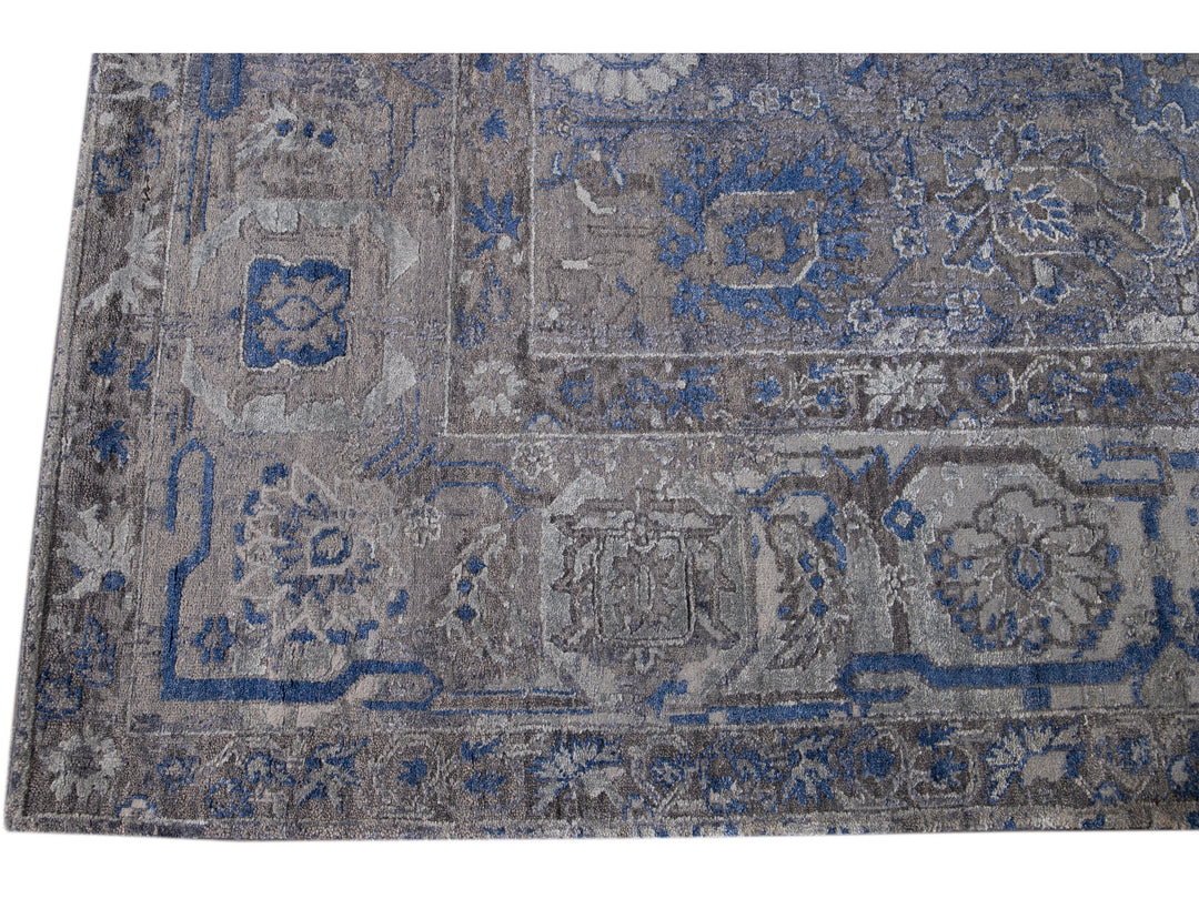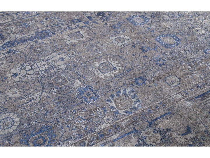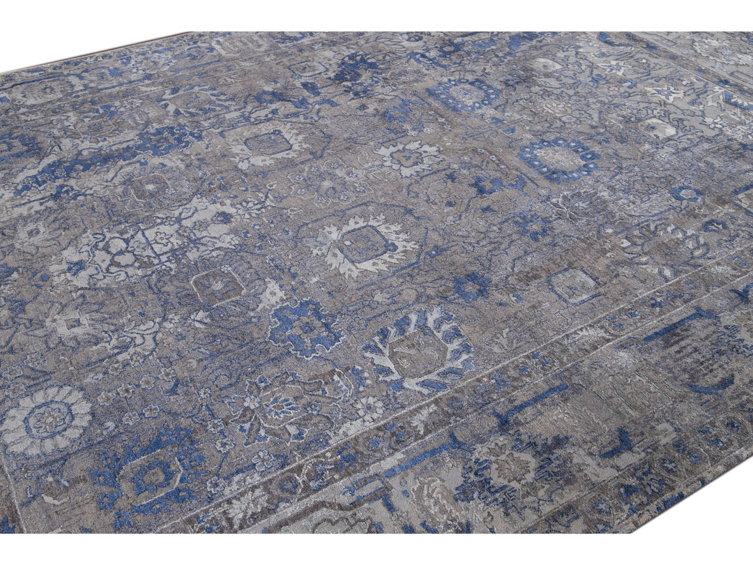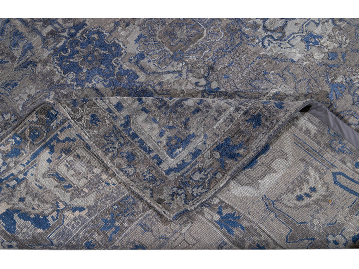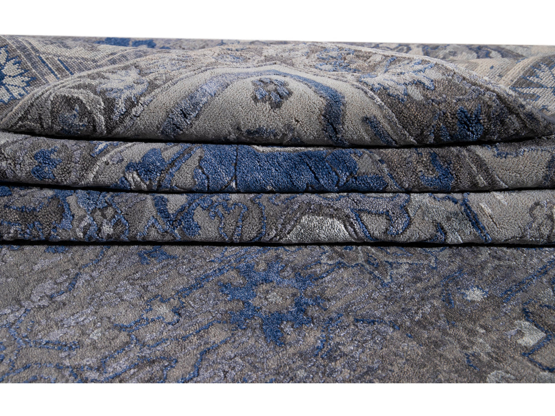 This exquisite rug features a refined combination of wool and silk, highlighting a mesmerizing abstract pattern embellished with graceful hues of blue and silver, artfully encompassing a captivating gray backdrop.