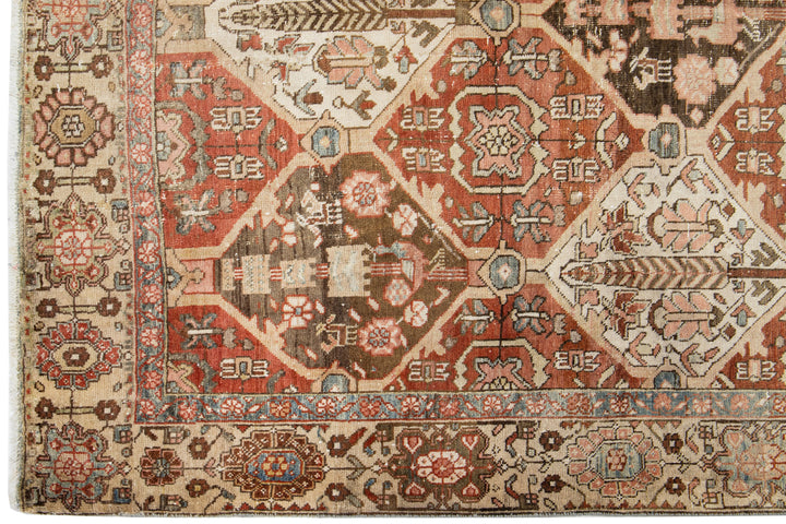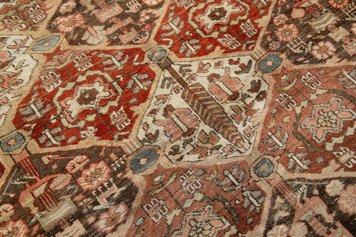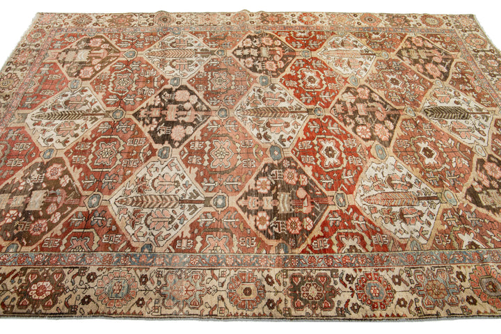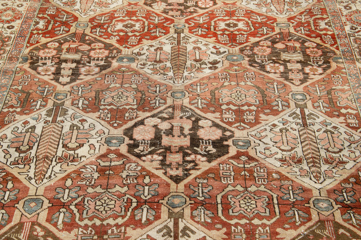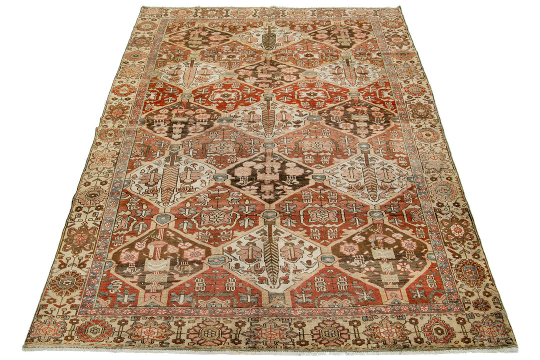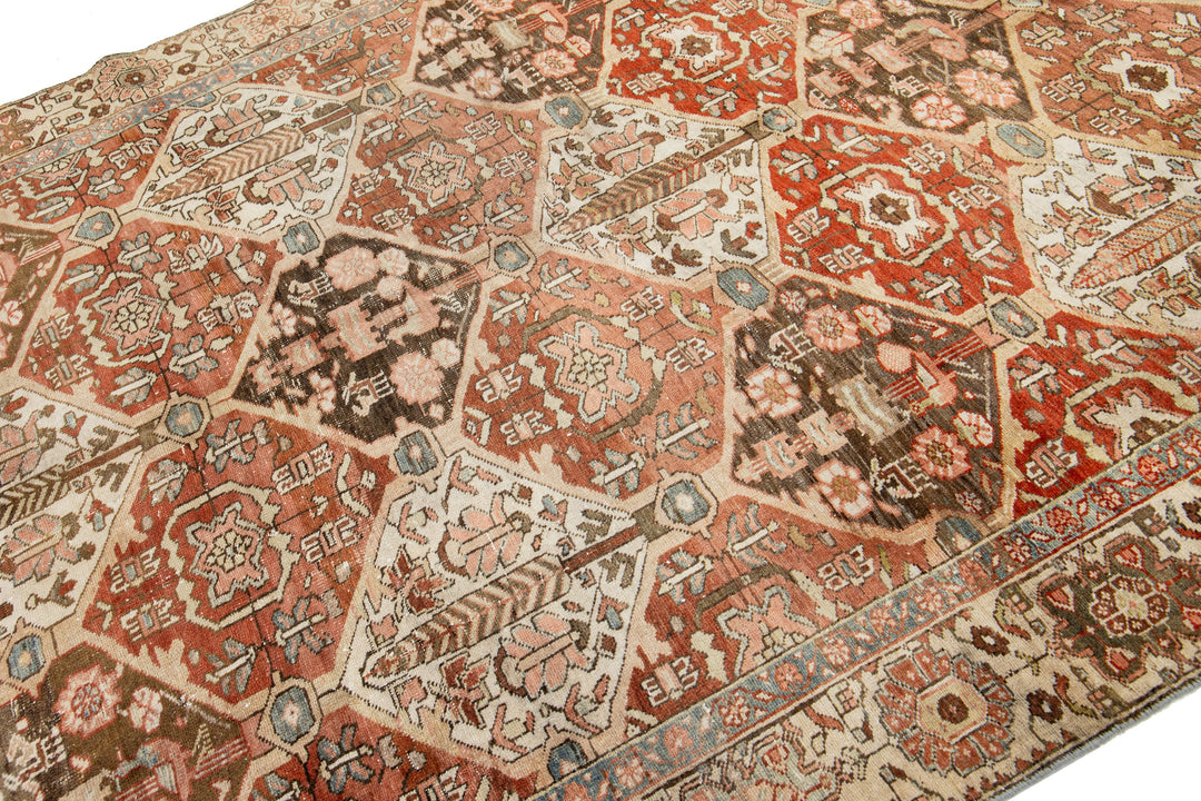 This beautiful antique Bakhtiari hand-knotted wool rug features a field of red-rust color. It showcases a classic Persian design with blue, beige, and peach floral colors. This rug measures 6'5" x 9'7".