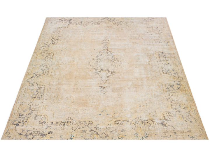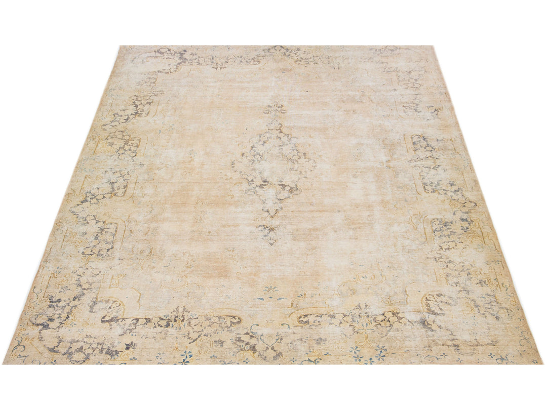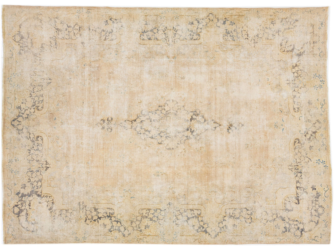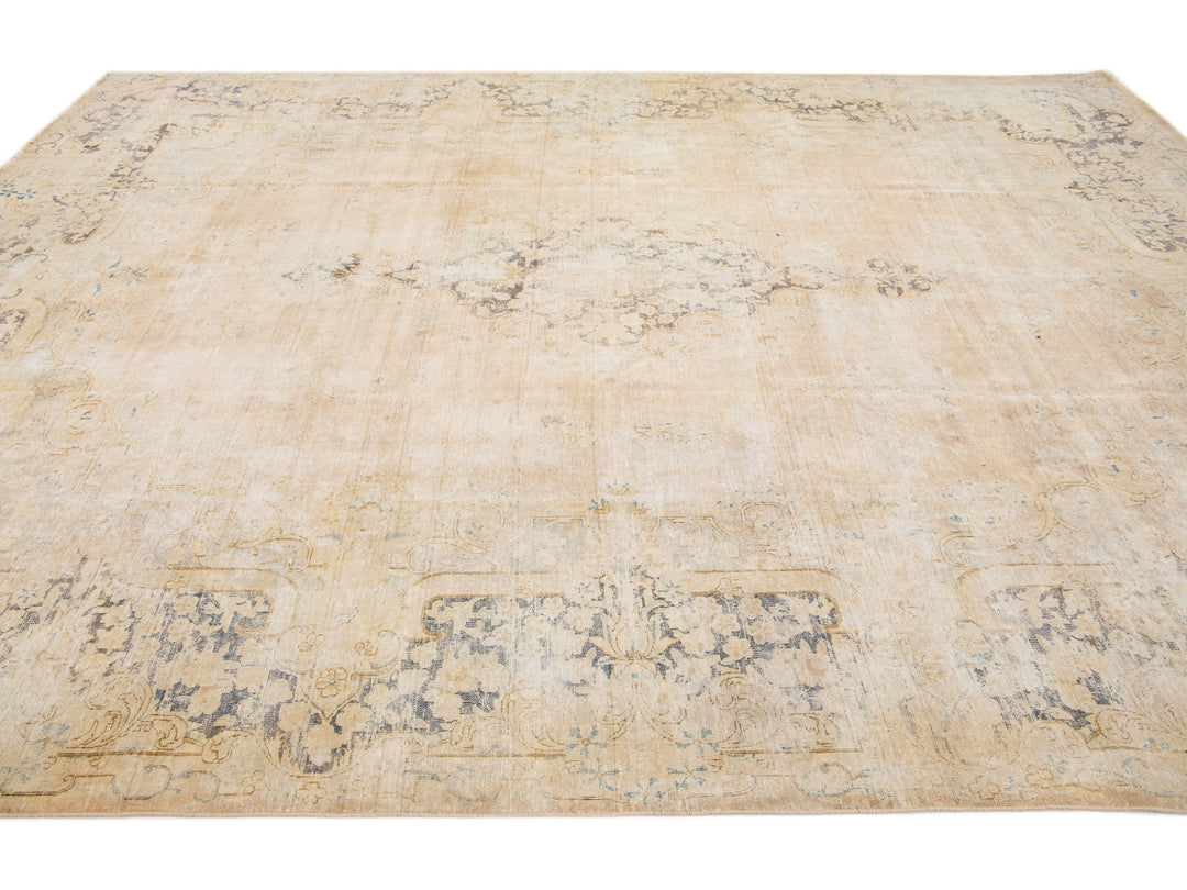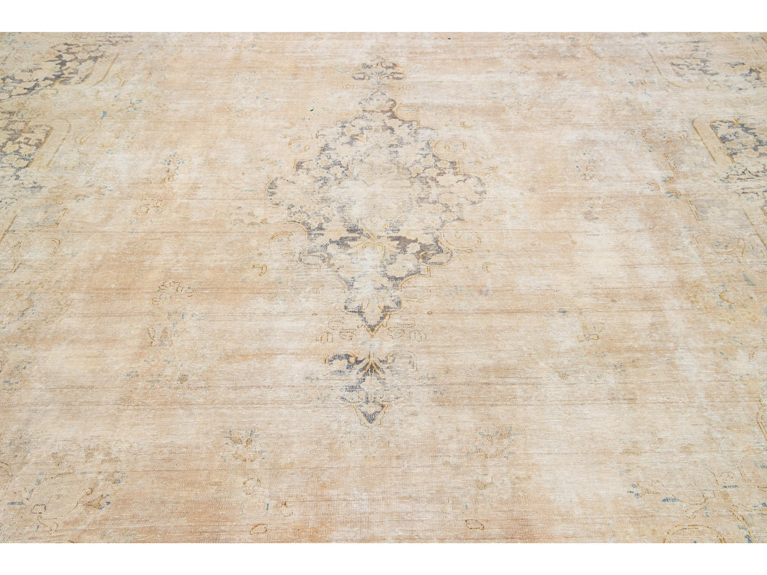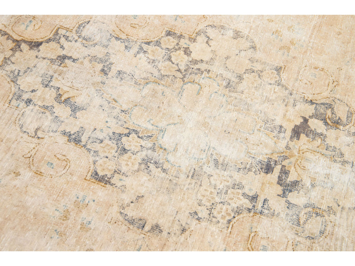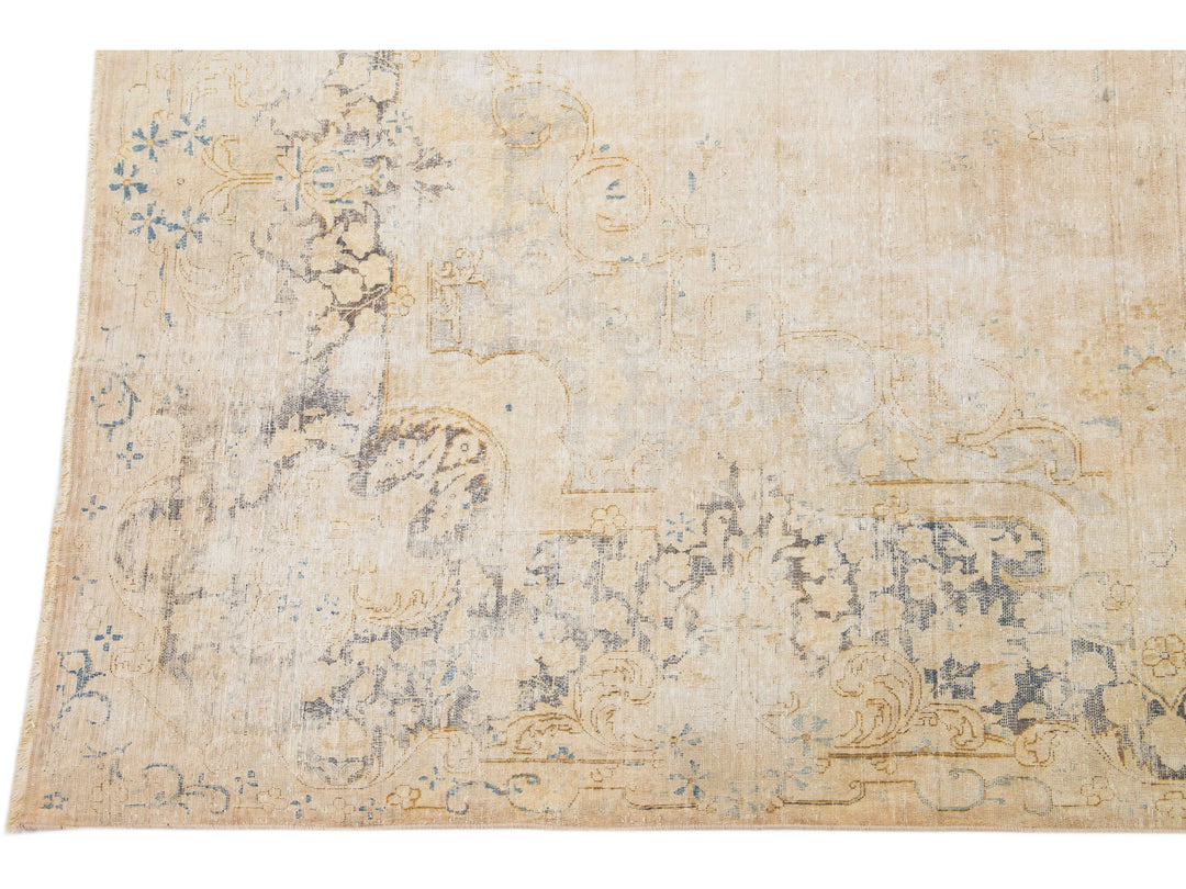 Beautiful antique Kerman hand-knotted wool rug with a beige field. This Persian rug has gray accents in a gorgeous medallion floral pattern.