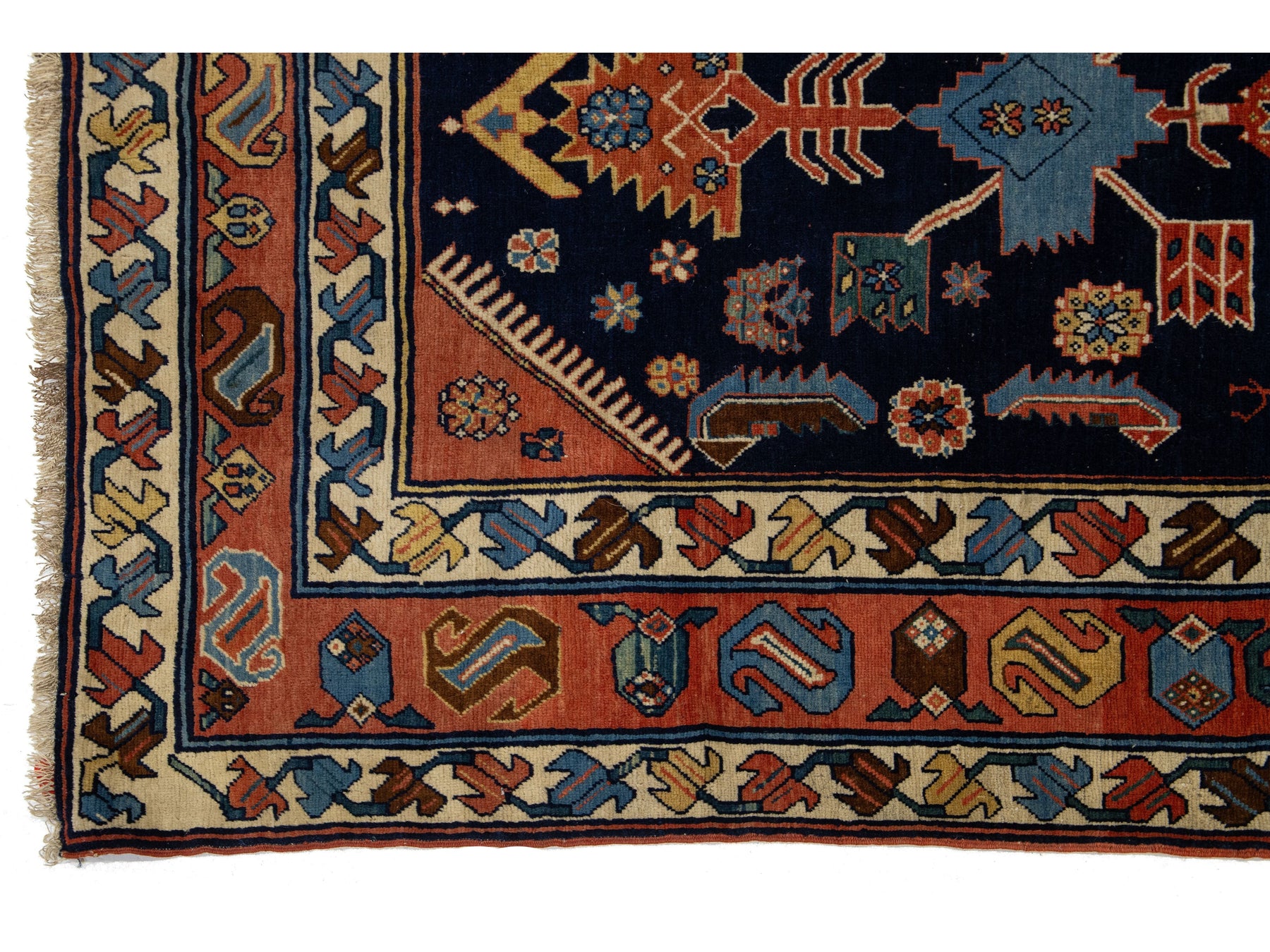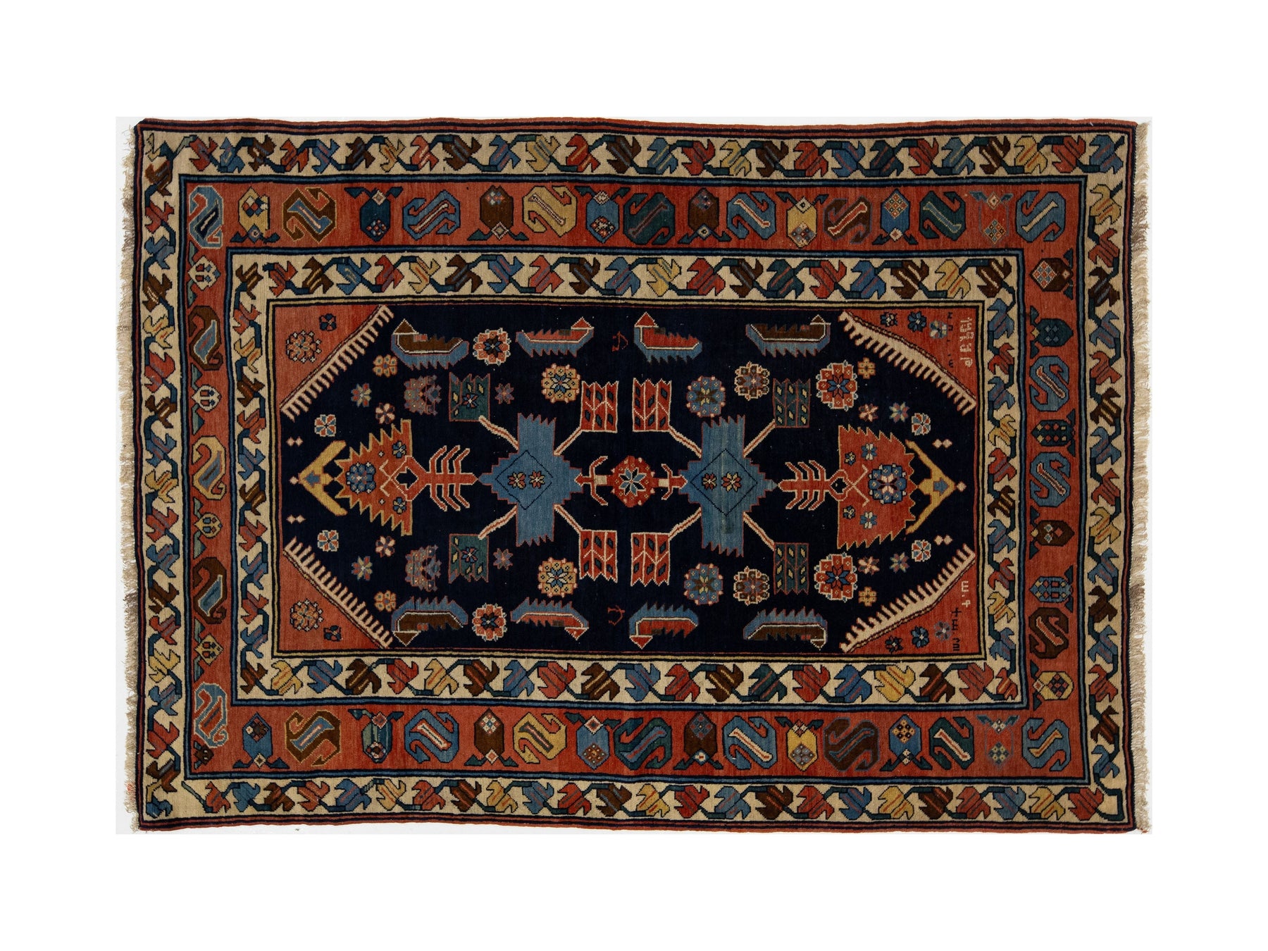An antique Persian Hamadan wool rug, hand-knotted, featuring a geometric design displayed on a blue field. This rug measures 4'5" x 6'8".