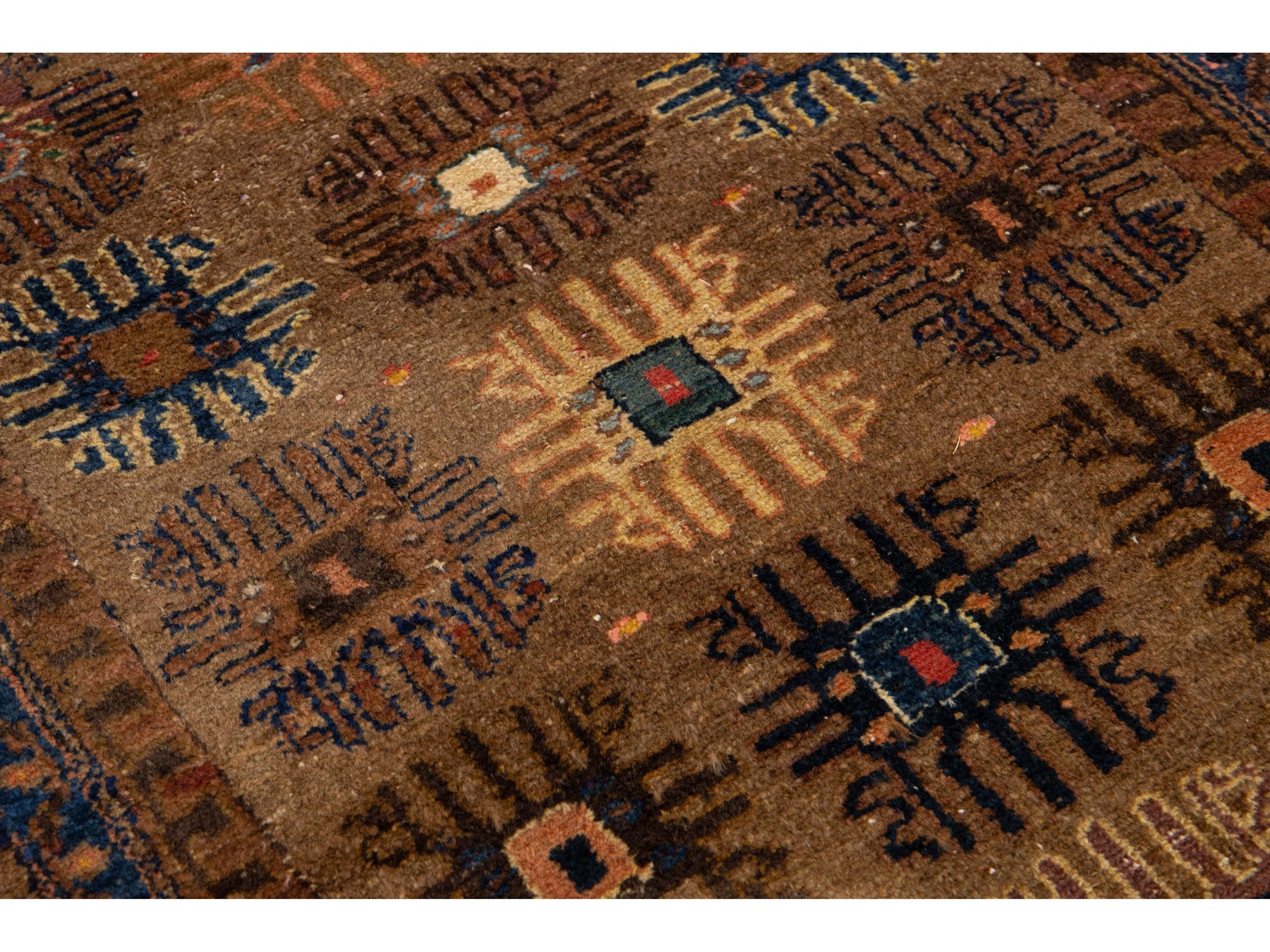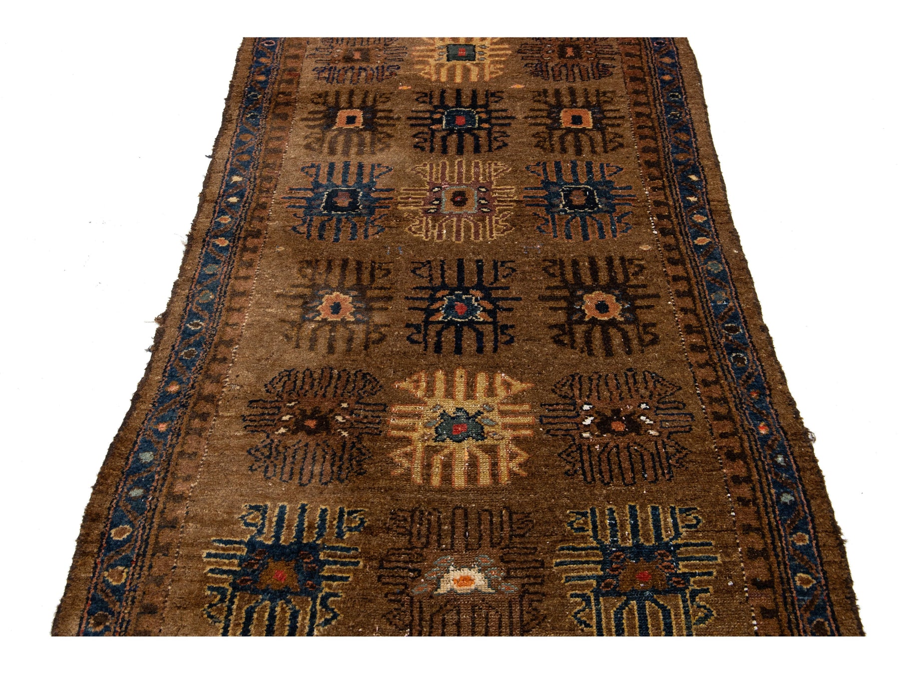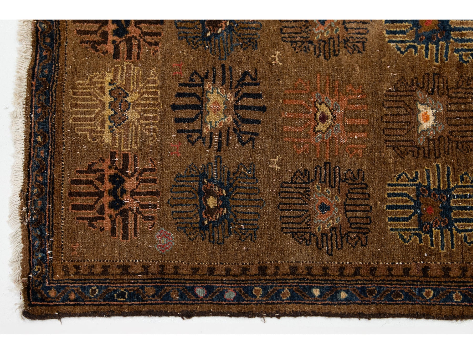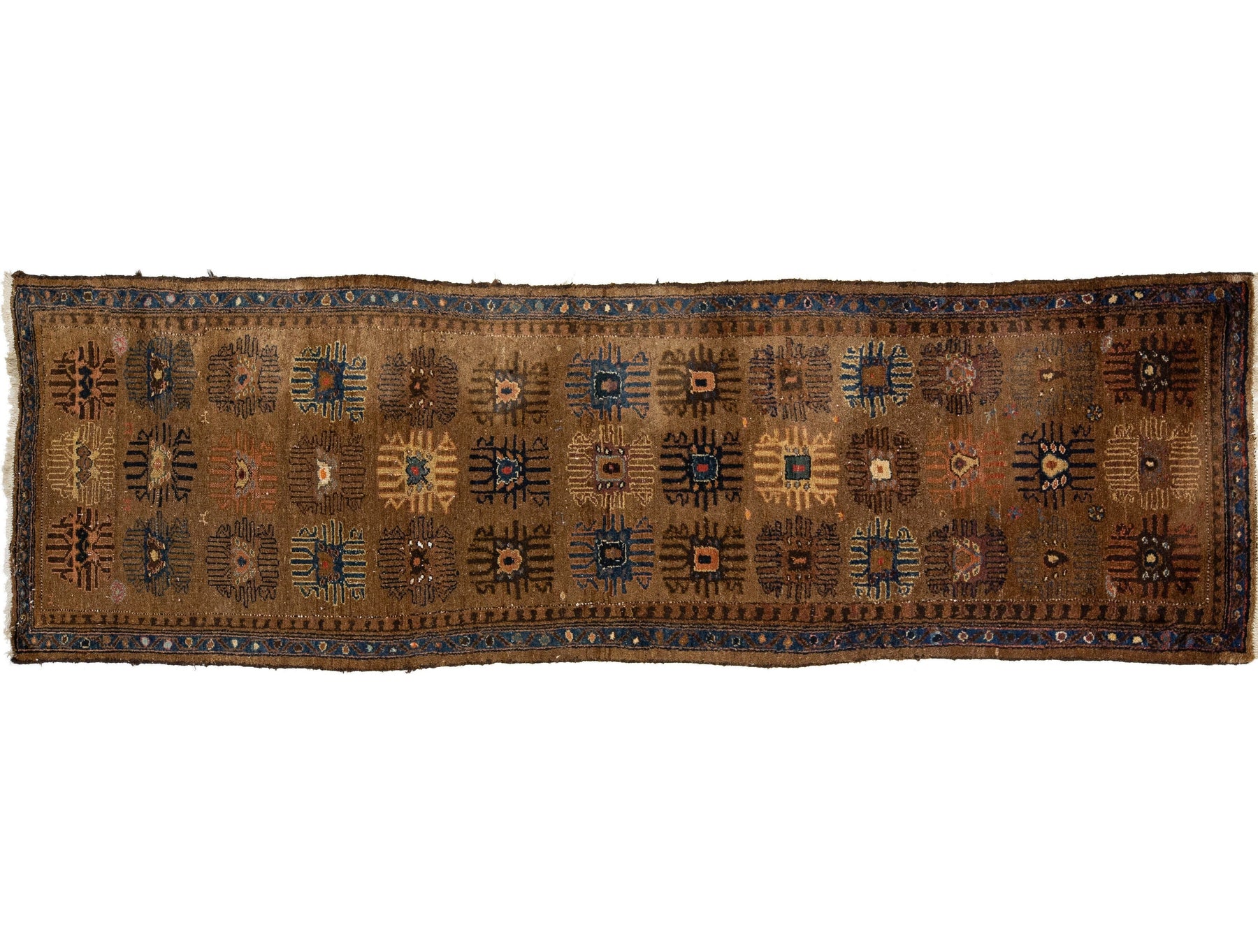 An antique Persian Hamadan wool runner rug, hand-knotted, featuring a geometric design displayed on a brown field. This rug measures 3'5" x 11'2".