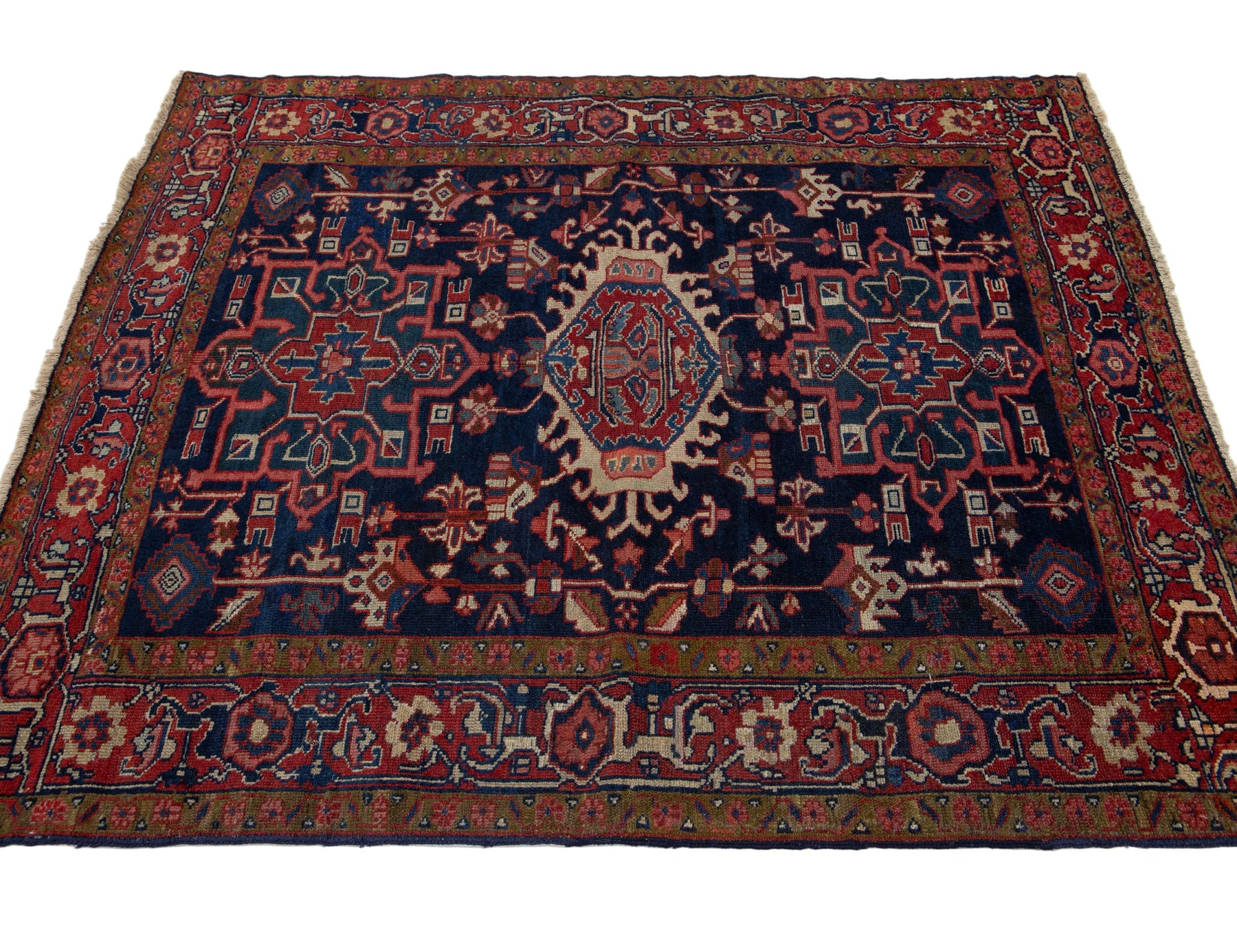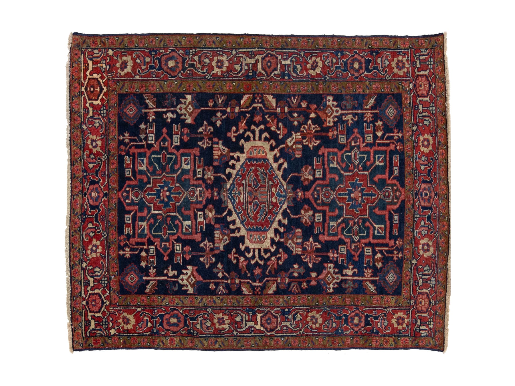 An antique Persian Heriz wool rug, hand-knotted, featuring a geometric design displayed on a blue field. This rug measures 4'3" x 5'2".