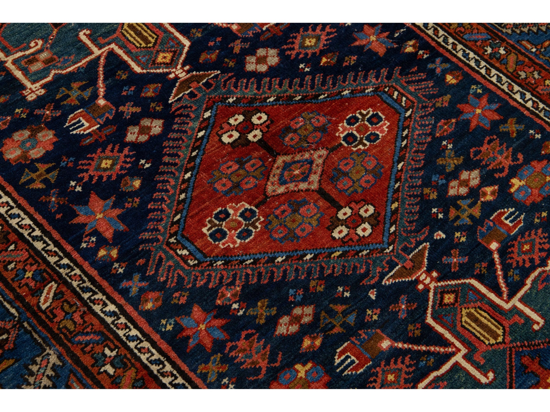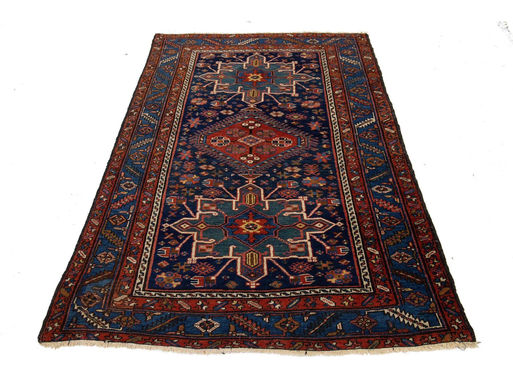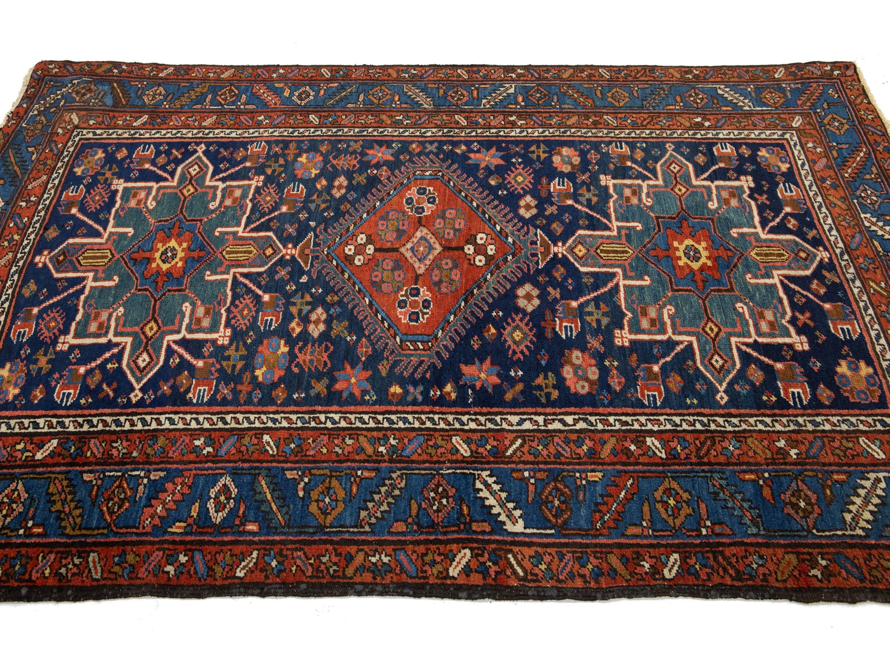 An antique Persian Heriz wool rug, hand-knotted, featuring a geometric design displayed on a blue field. This rug measures 4'6" x 6'6".