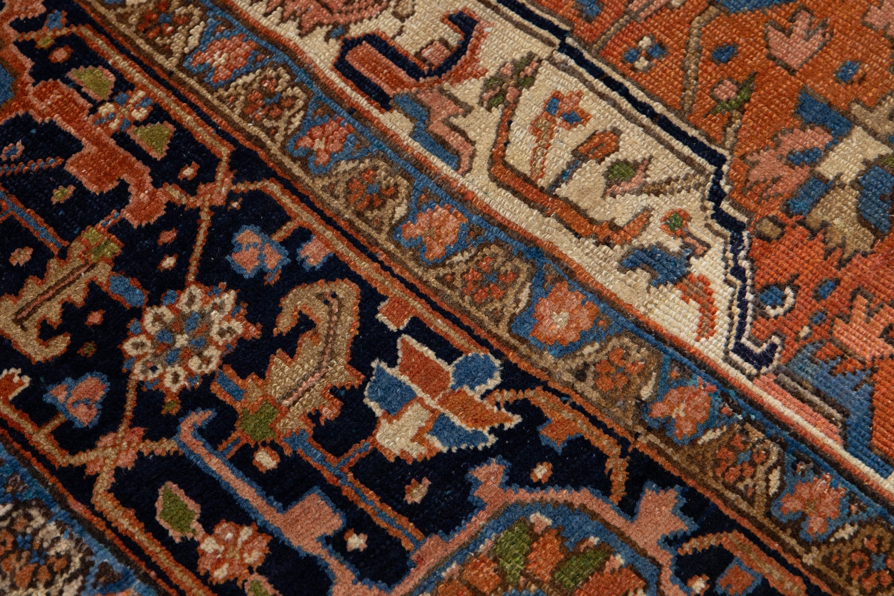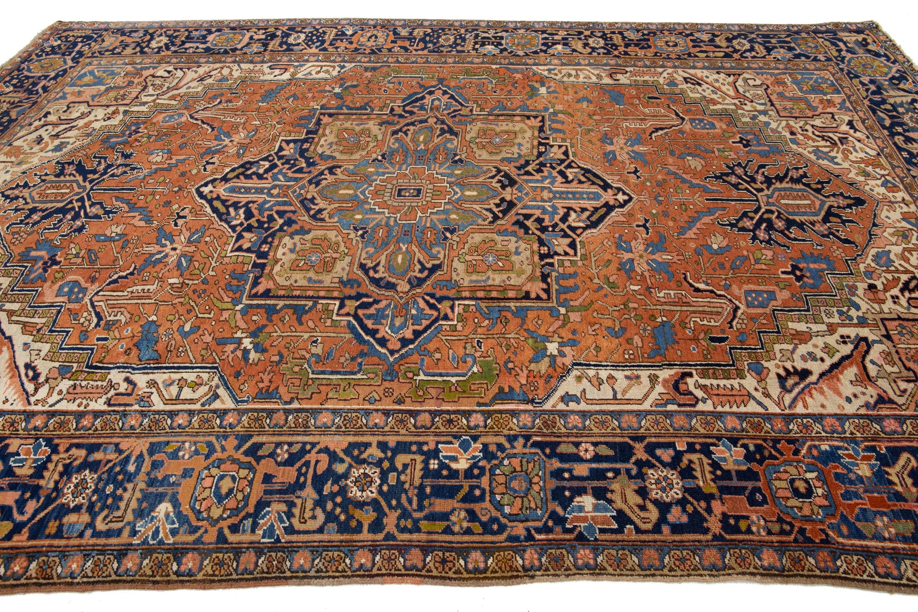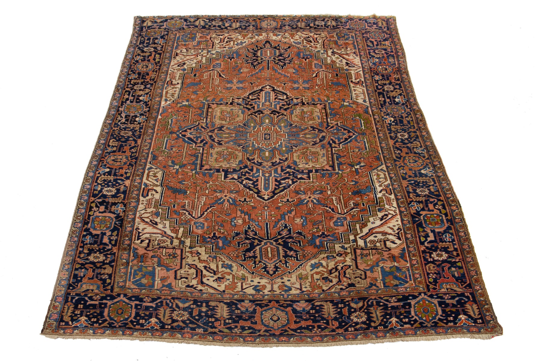 An antique Persian Heriz wool rug, hand-knotted, featuring a medallion design displayed on a red-rust field. This rug measures 8'1" x 11'8".