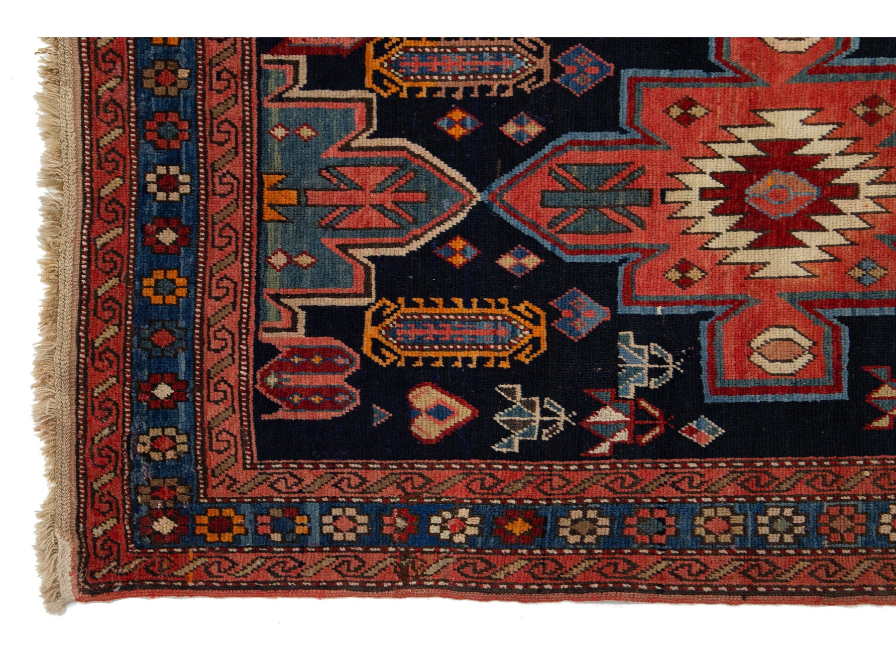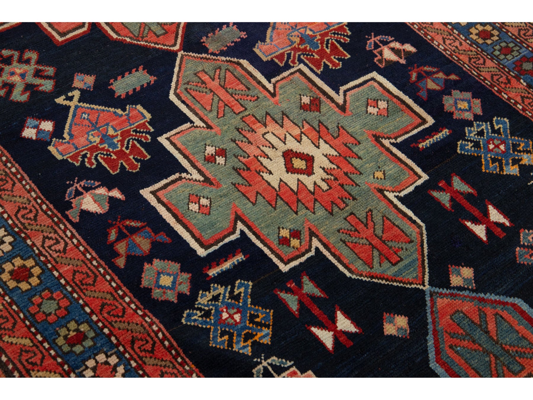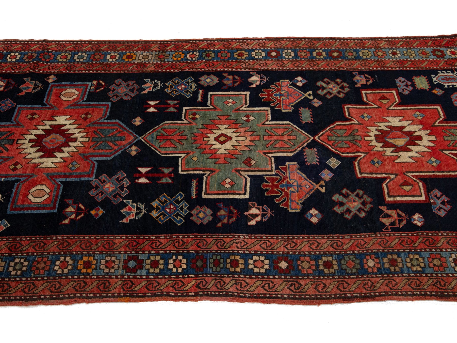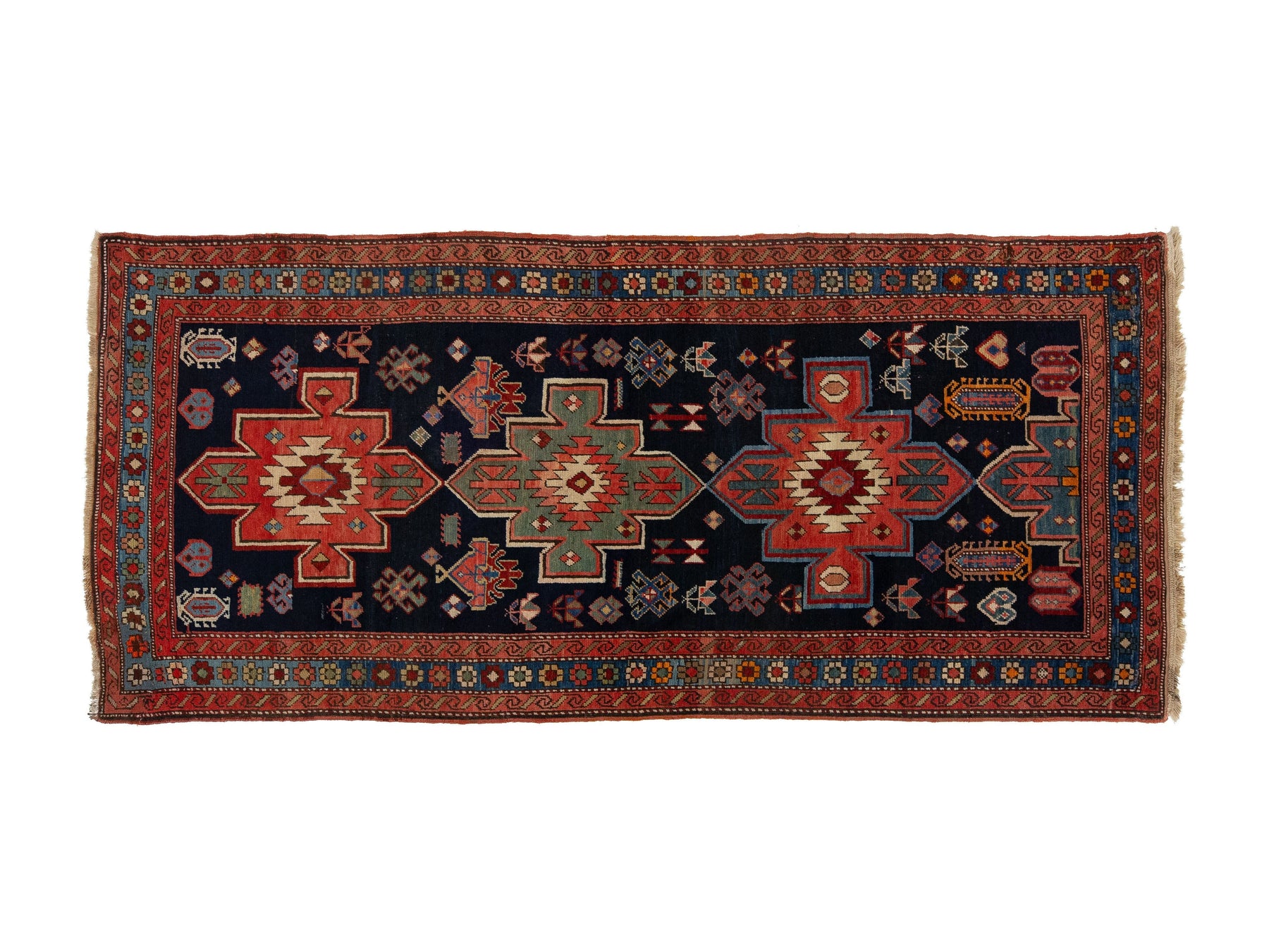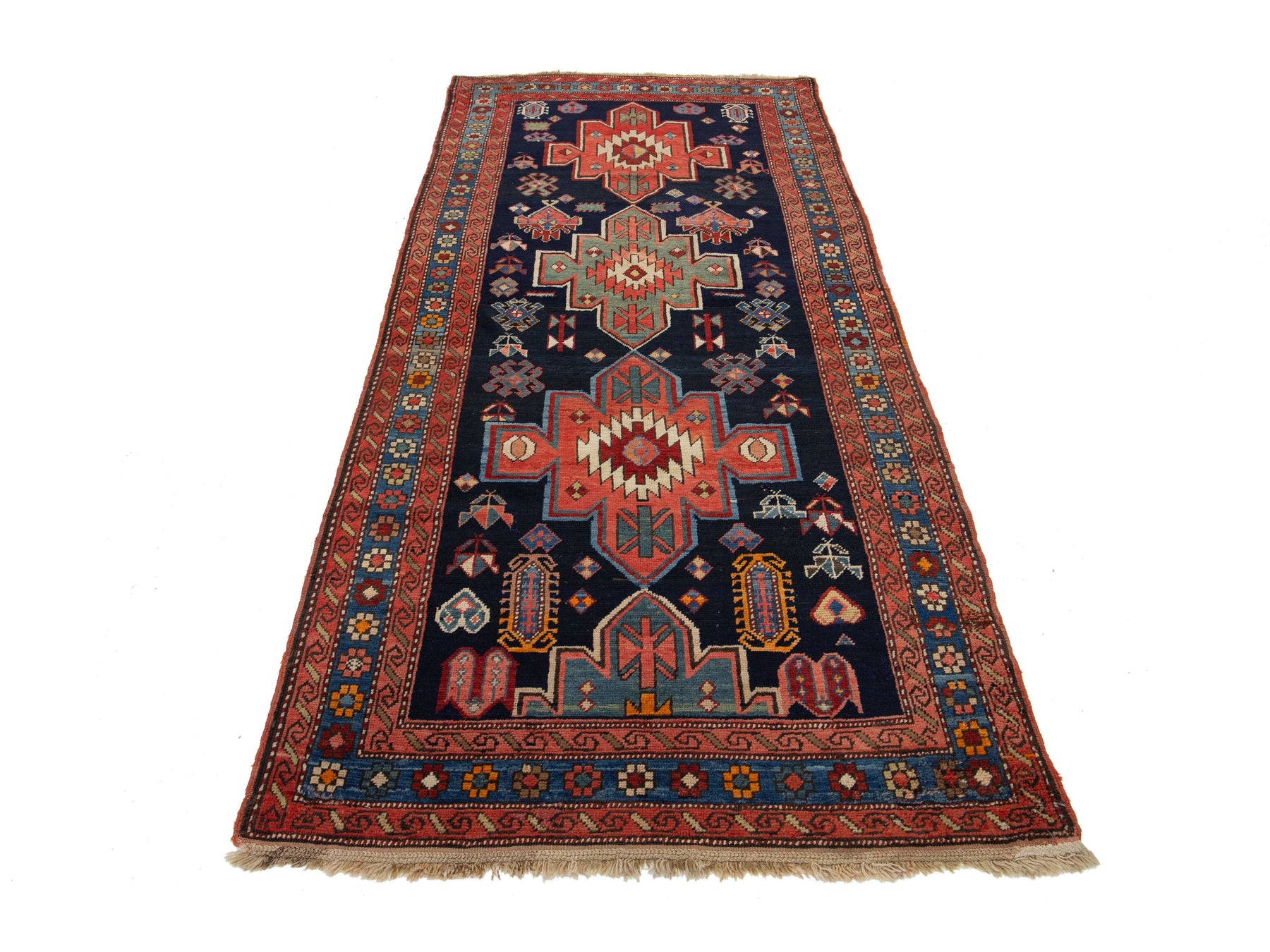 An antique Persian Kurd wool runner rug, hand-knotted, featuring a geometric design displayed on a blue field. This rug measures 3'11" x 8'10".