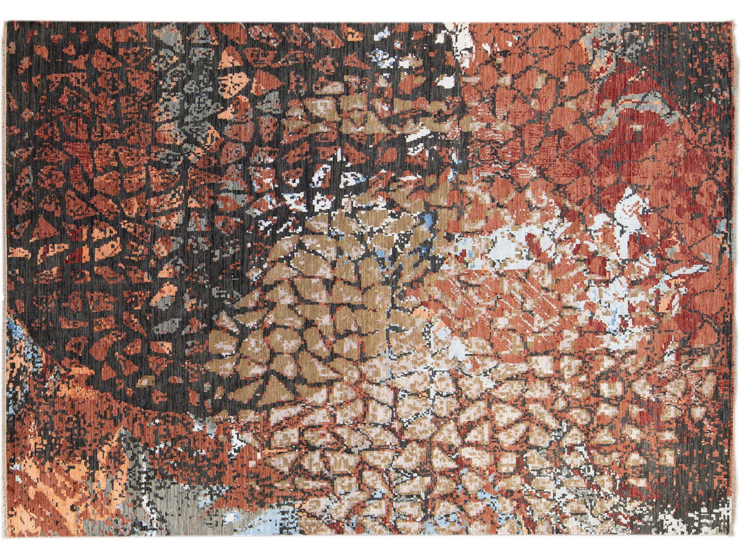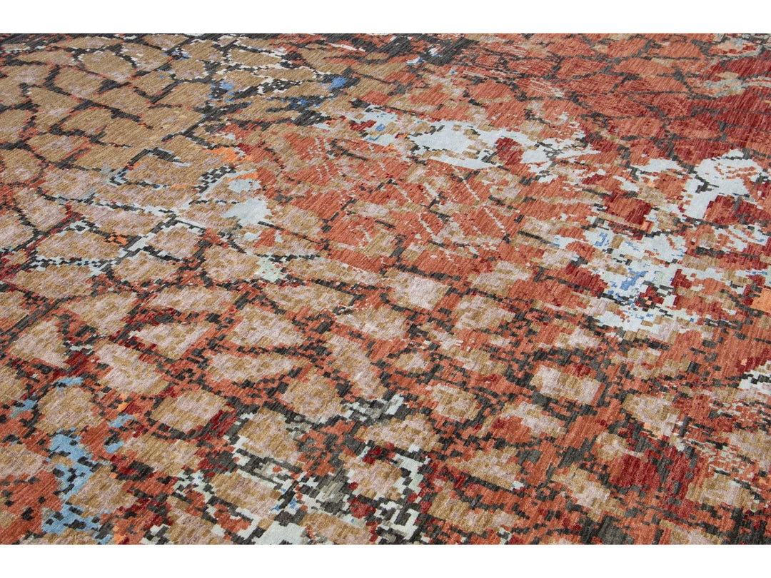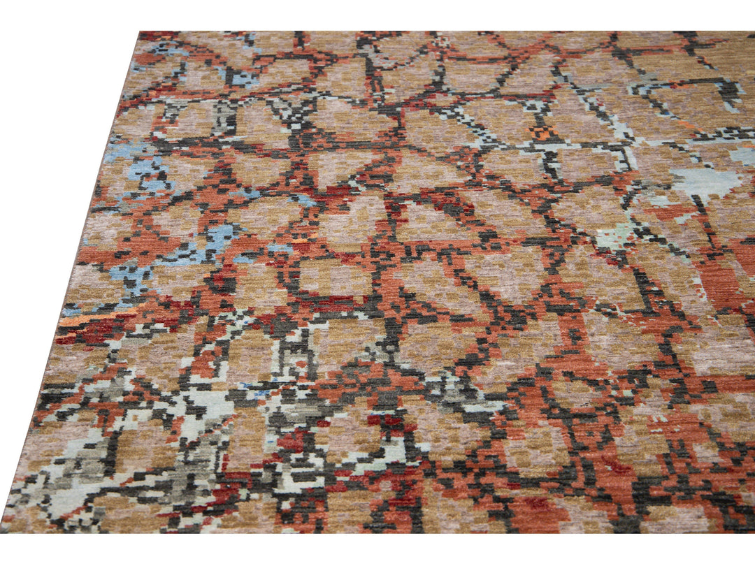 Beautiful modern hand-knotted wool and silk rug with orange, blue, gray, and tan field. This Modern rug has a gorgeous all-over geometric abstract design. This rug is constructed of premium materials and expert craftsmanship for a luxurious look and feel. It's the perfect way to add a vibrant and sophisticated touch to any interior.