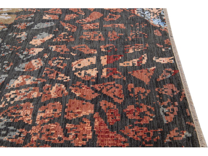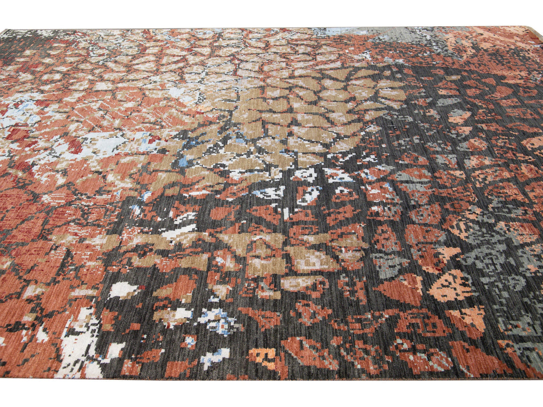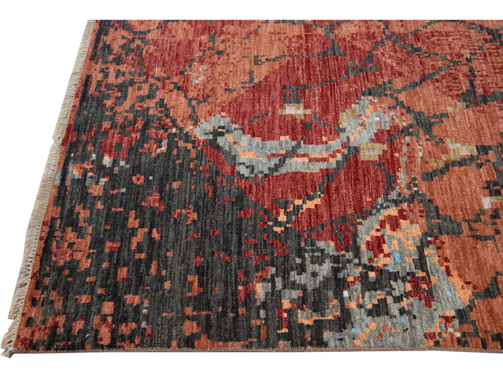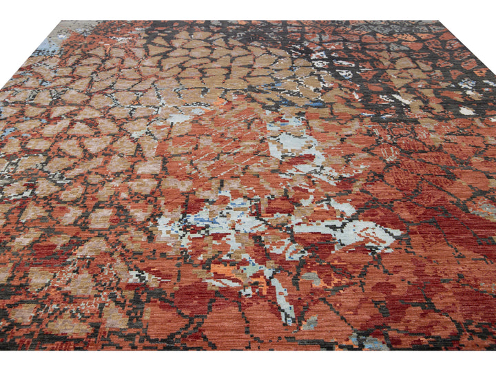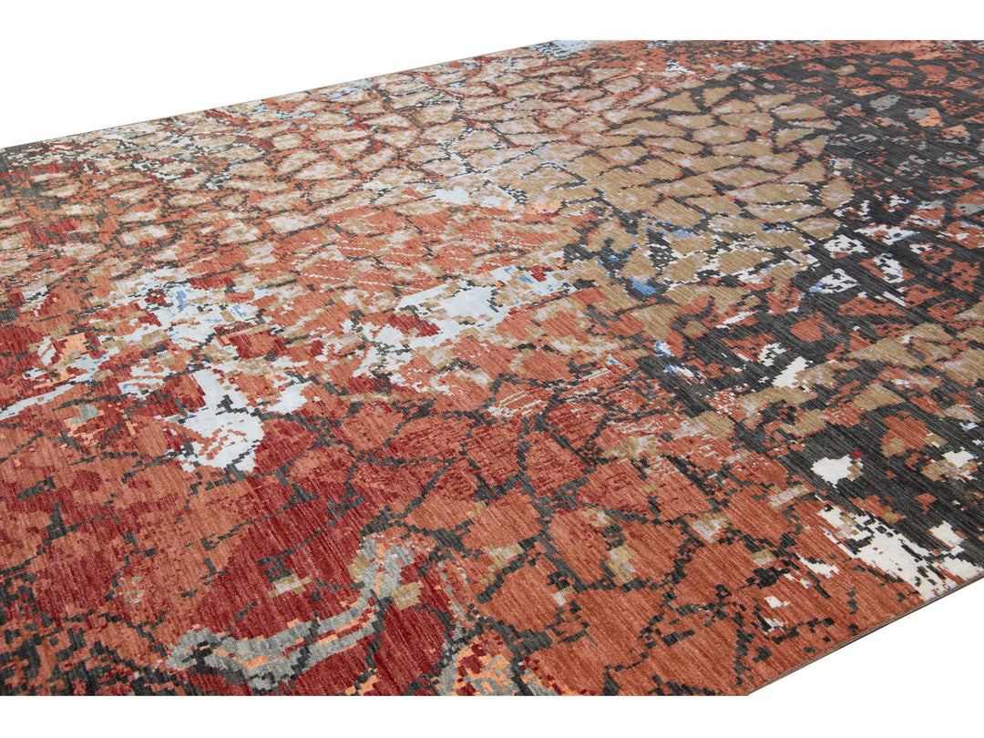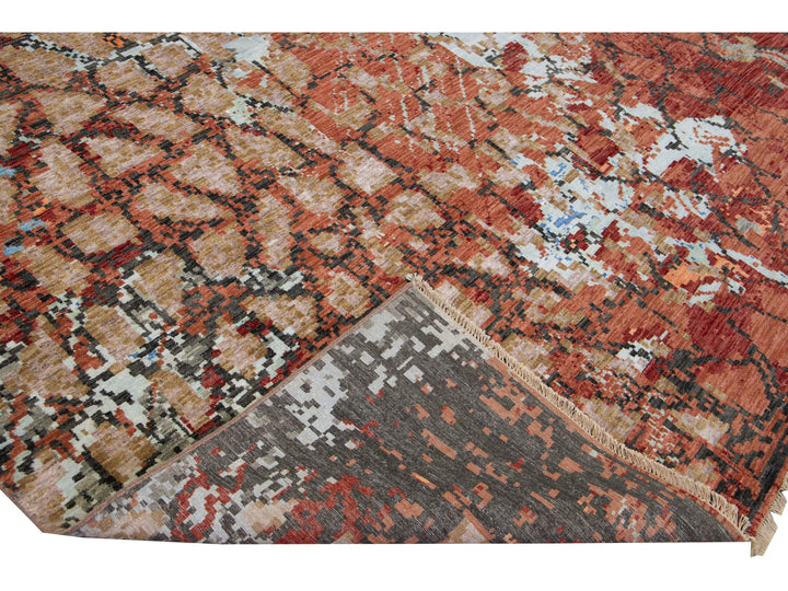 Modern Orange and Gray Handmade Geometric Abstract Wool and Silk Rug