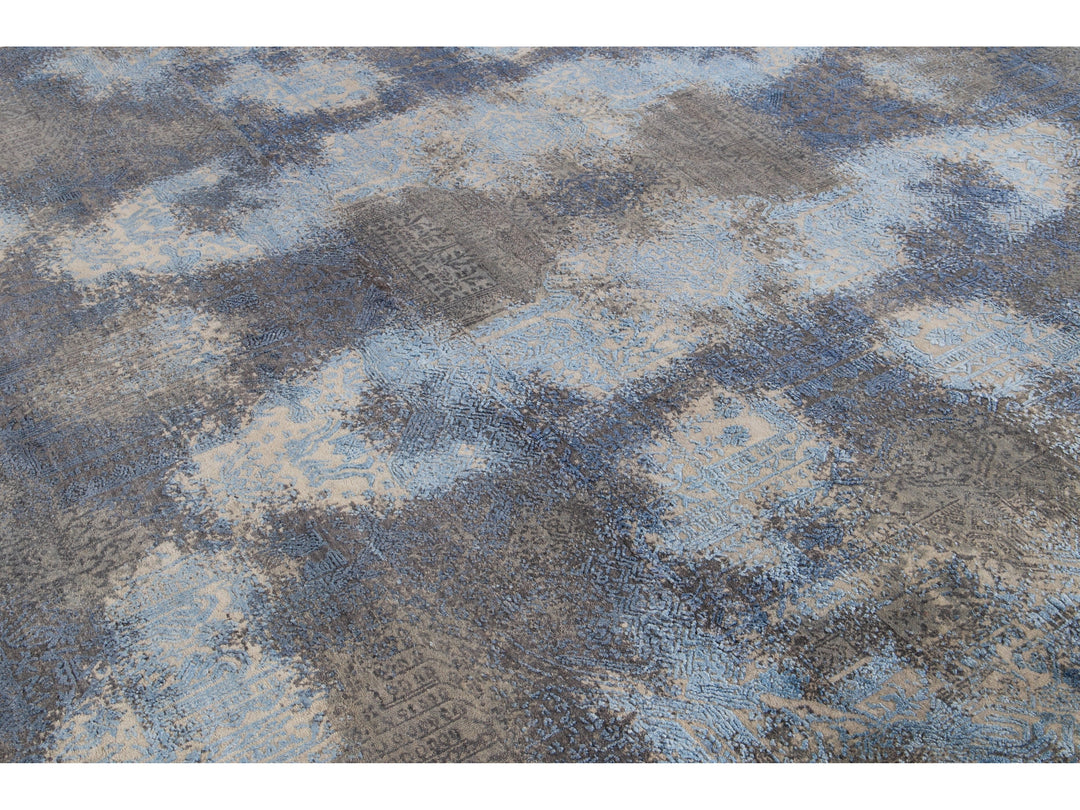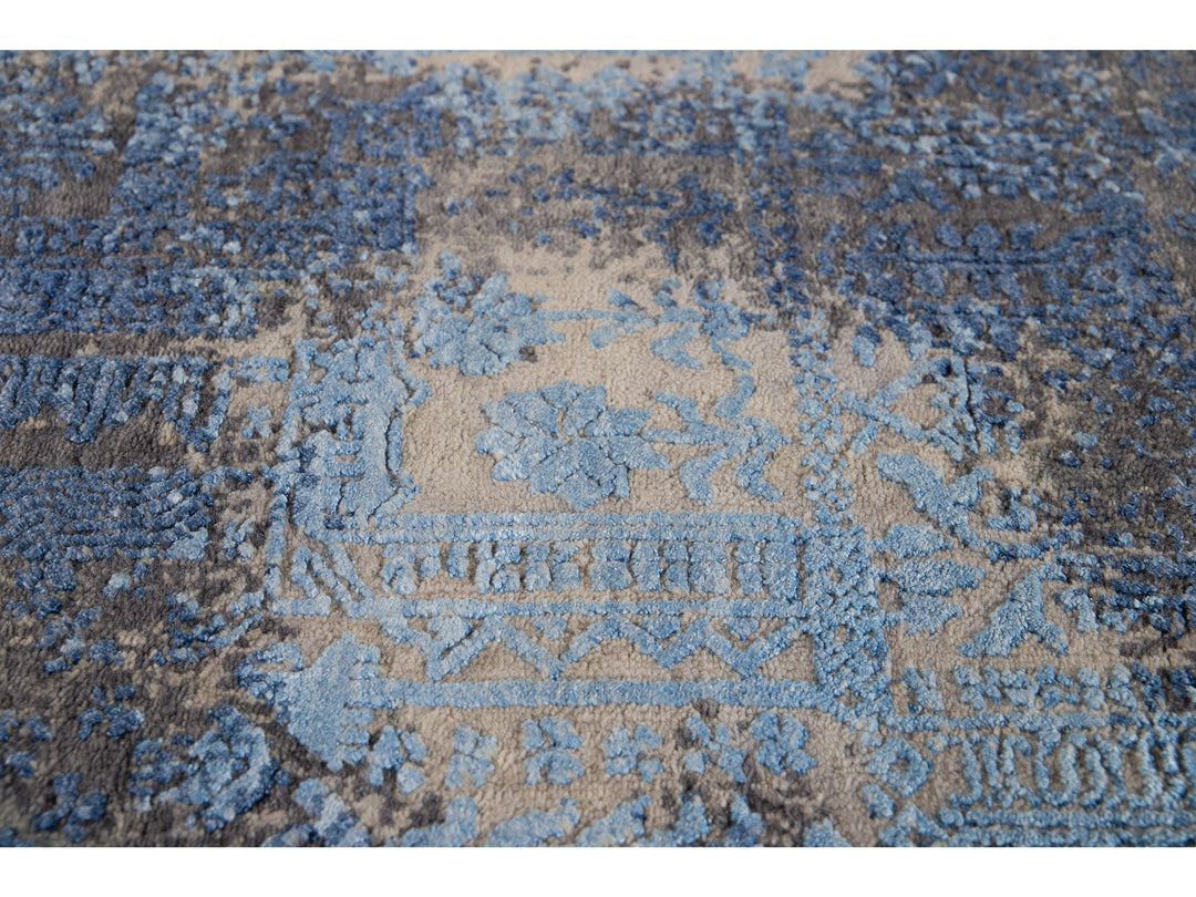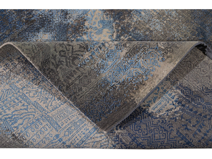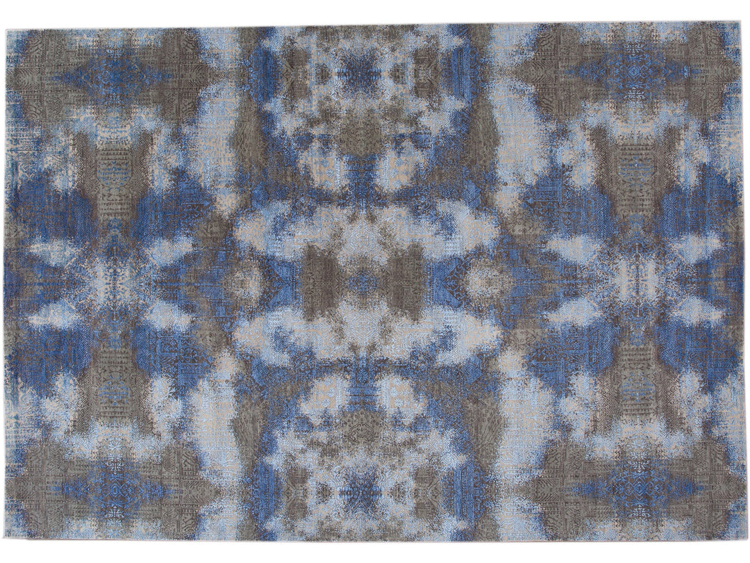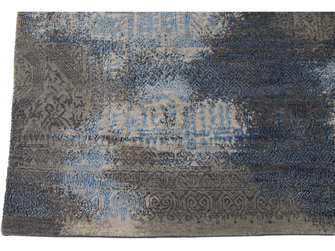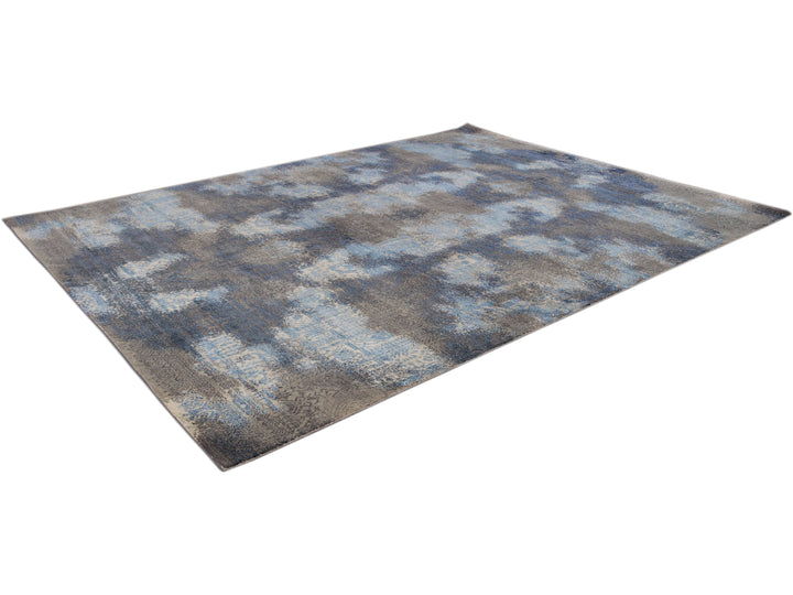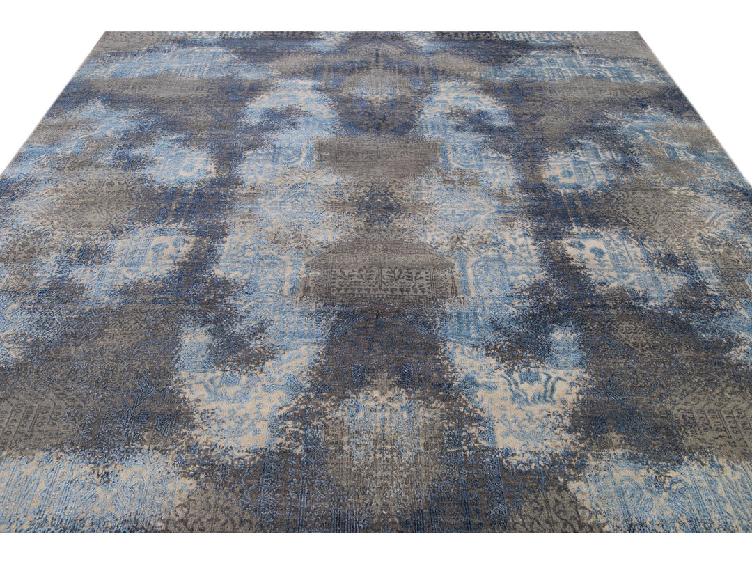 This sophisticated wool and silk rug showcases a captivating abstract design adorned with elegant shades of gray and blue, beautifully encompassing alluring beige undertones.