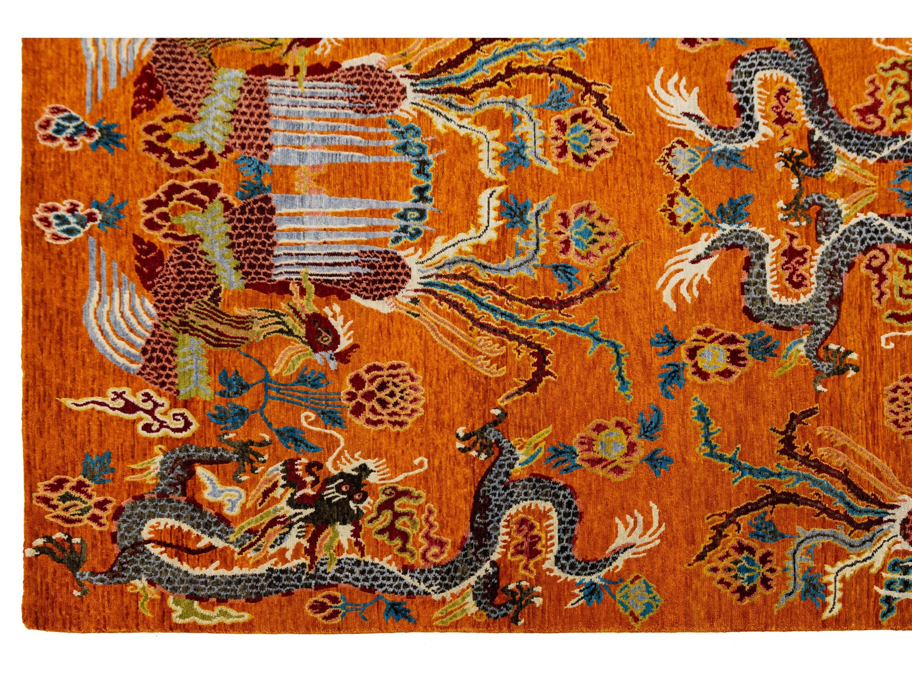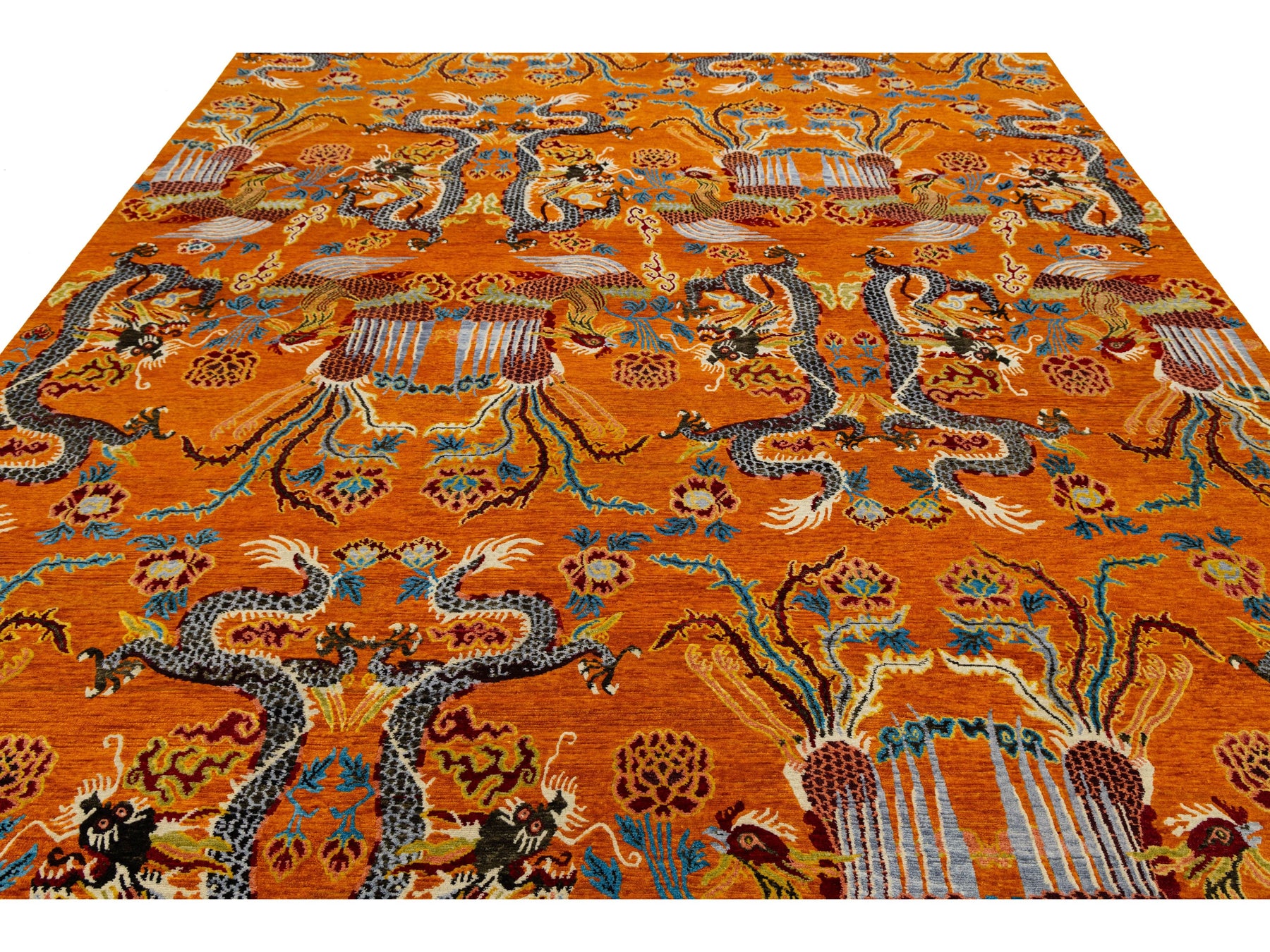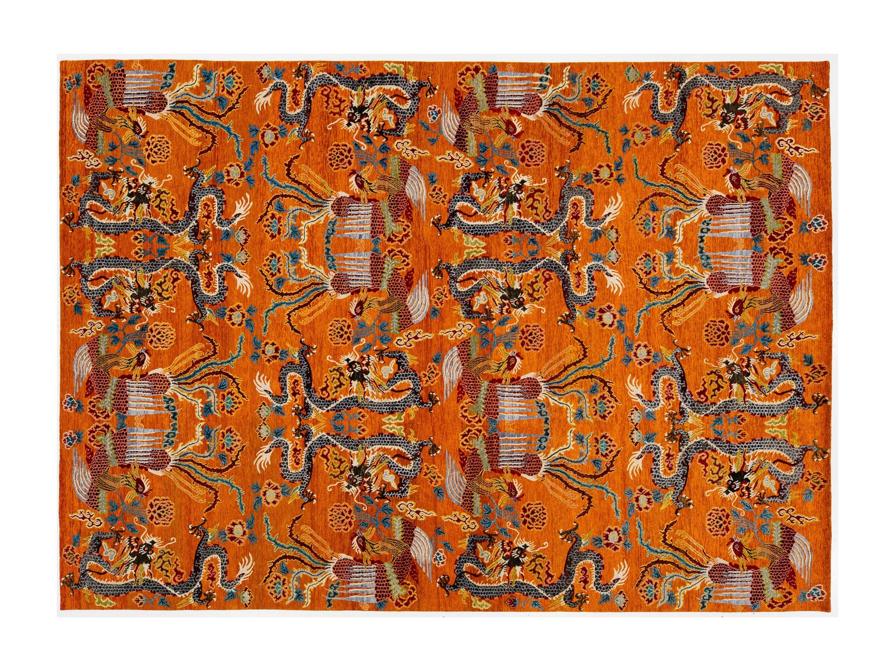 This stunning piece reimagines traditional Himalayan iconography through a bold, contemporary lens. Hand-knotted from premium Tibetan wool, the rug features a repeating motif of Imperial Dragons and Phoenixes, symbolizing power, grace, and harmony. The high-contrast palette of fiery orange, deep charcoal, and soft azure makes it a brilliant focal point for modern or eclectic interiors. This rug measures: 9'2" x 12'11".