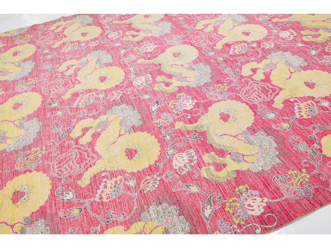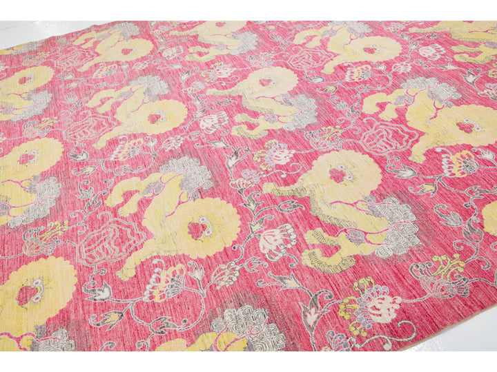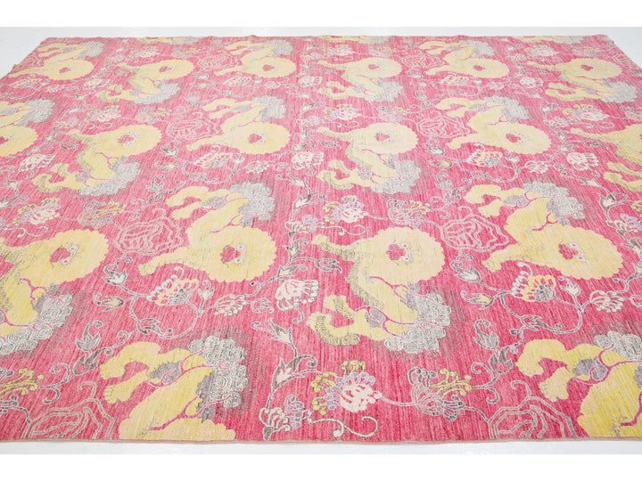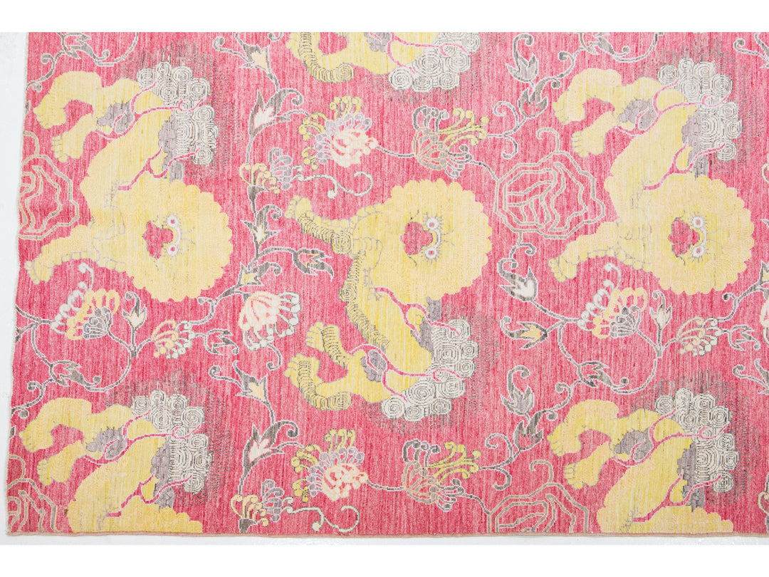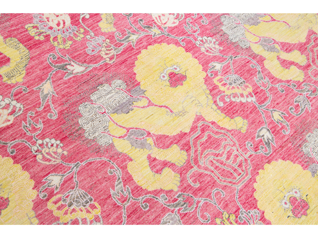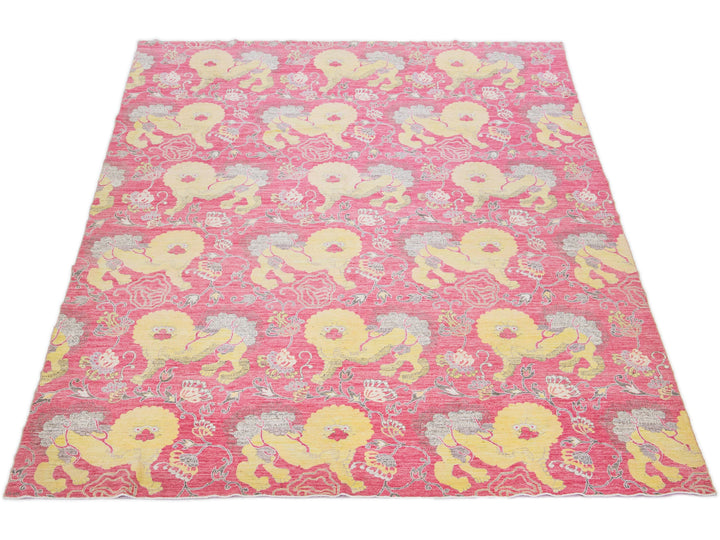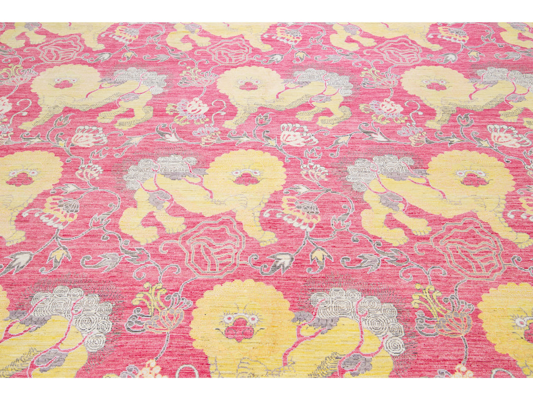 This hand-knotted wool rug showcases an exquisite Modern Art Deco design with a rich pink field accentuated by broad yellow and gray hues. The intricate Chinese-style foo dogs are beautifully depicted throughout the rug, embellished with eye-catching accent colors that lend a playful flair.