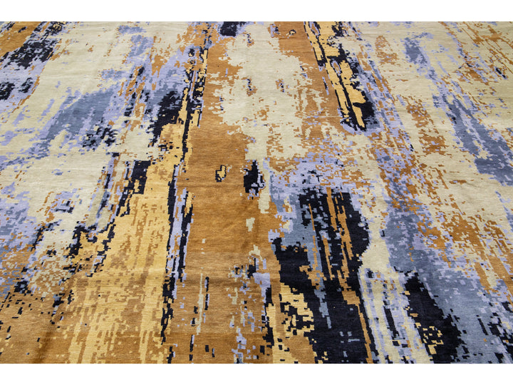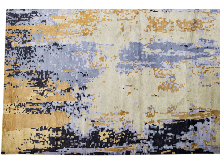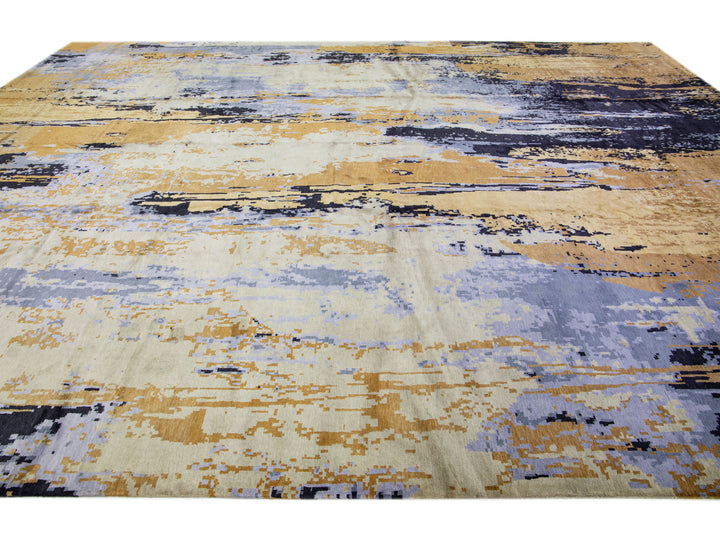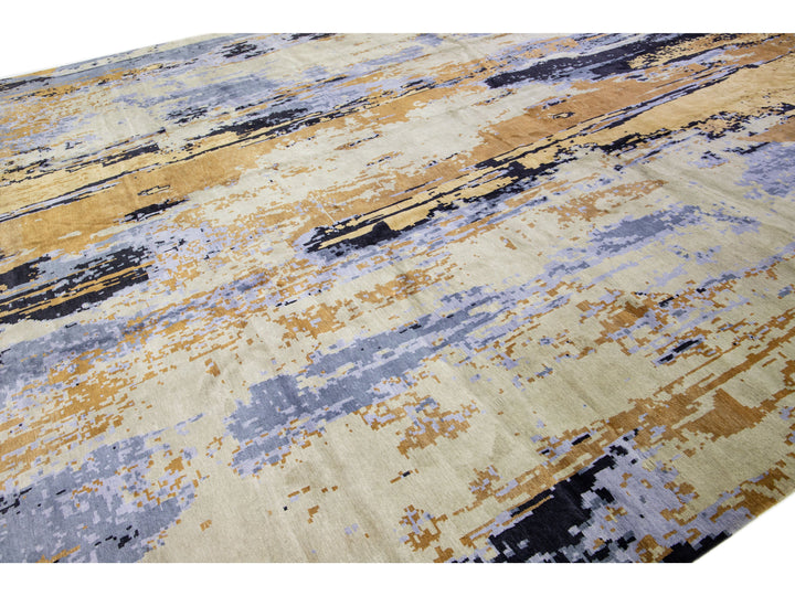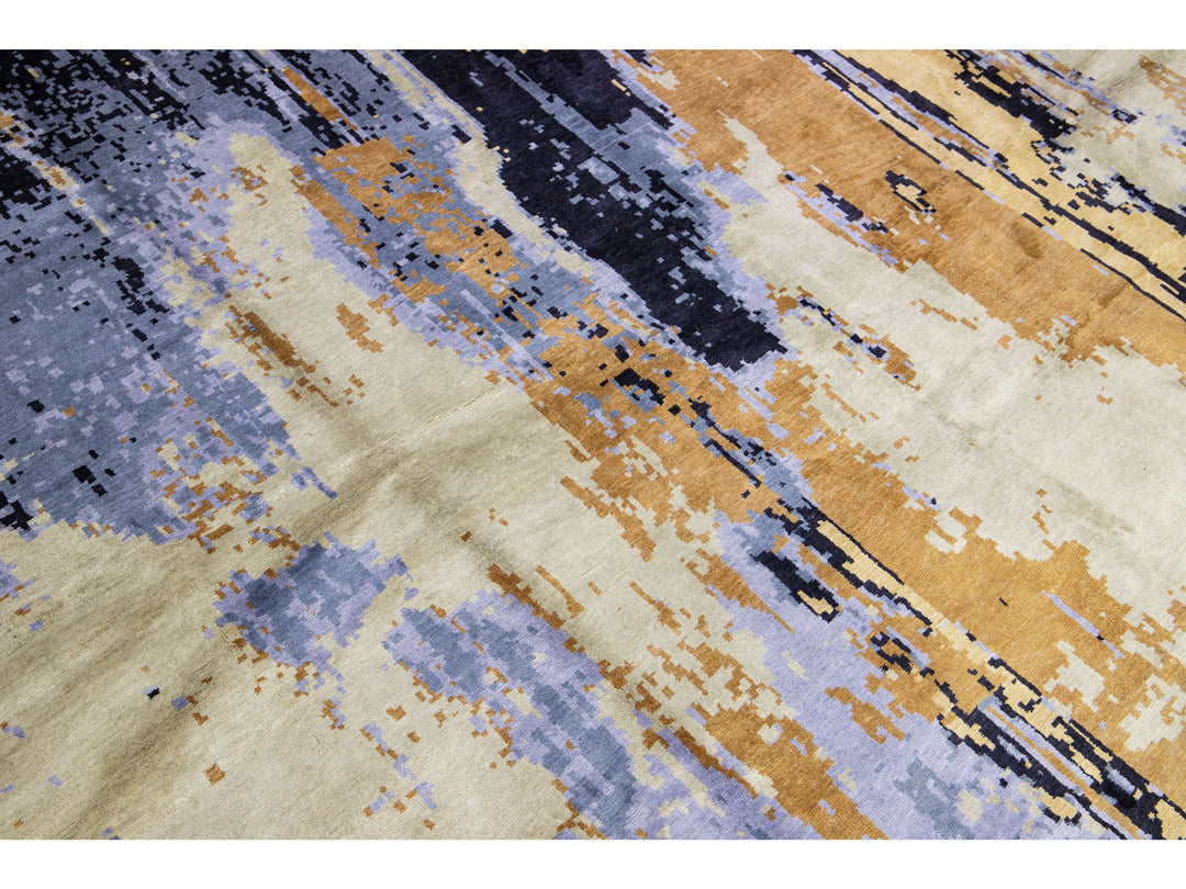 A contemporary wool and silk rug is presented here that showcases an abstract beige field as its central element. The rug features a comprehensive pattern with gold, gray, and black accents, which characterizes the epitome of 21st-century modernism.
