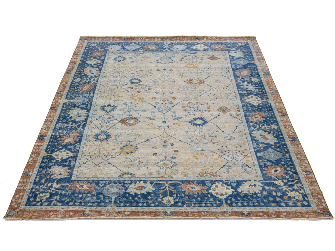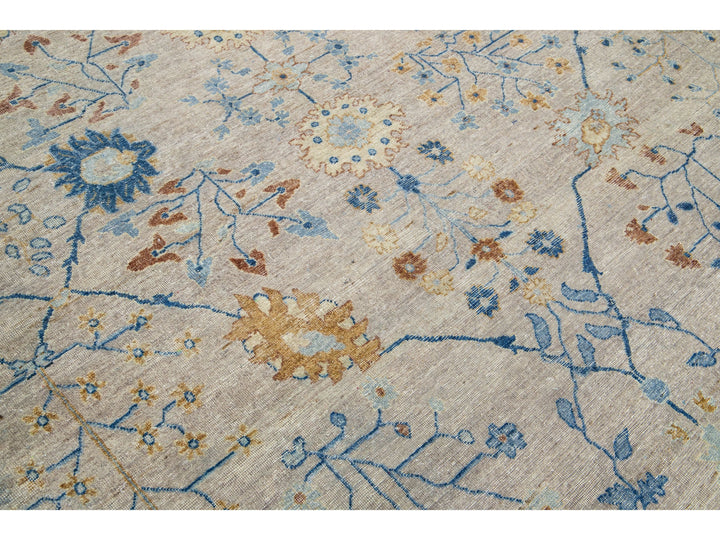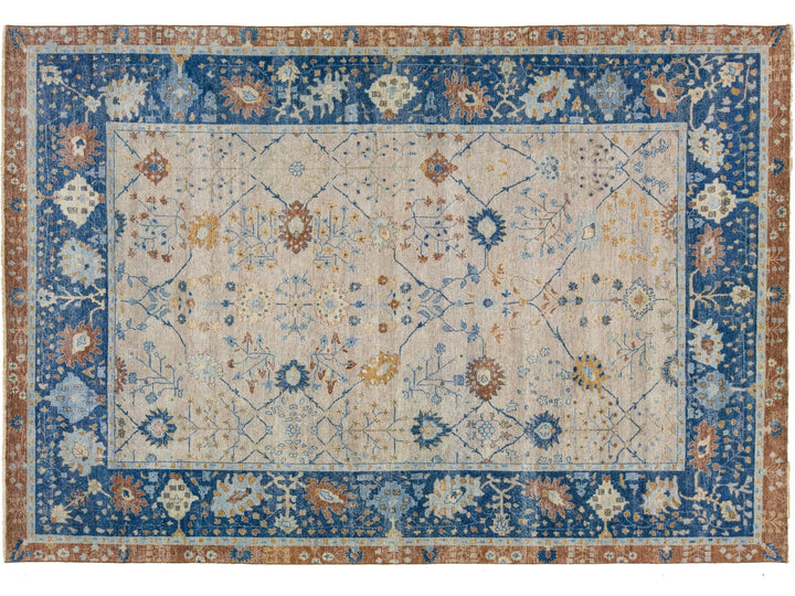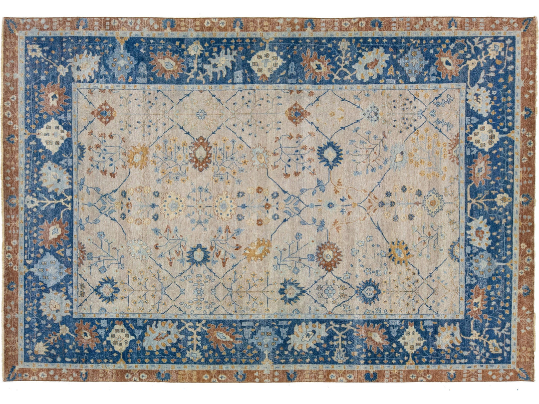 Modern Indian Artisan Wool Rug is an antique rug reimaging with an elegant way to inject a striking antique aesthetic into a space. This line of rugs is decidedly unique and reimagines what an antique rug look can be. Every single piece from our Artisan line is painstakingly woven by hand. This custom rug features a gorgeous all-over floral design in a beige color field with blue and brown accents. This rug measures 9'11" x 14'6".