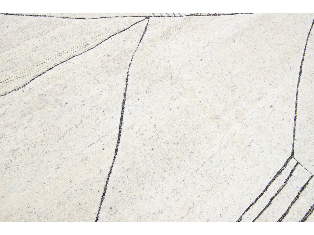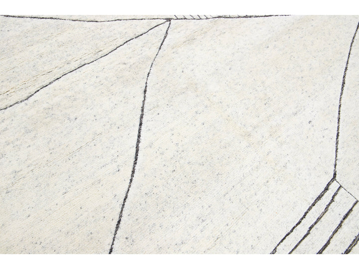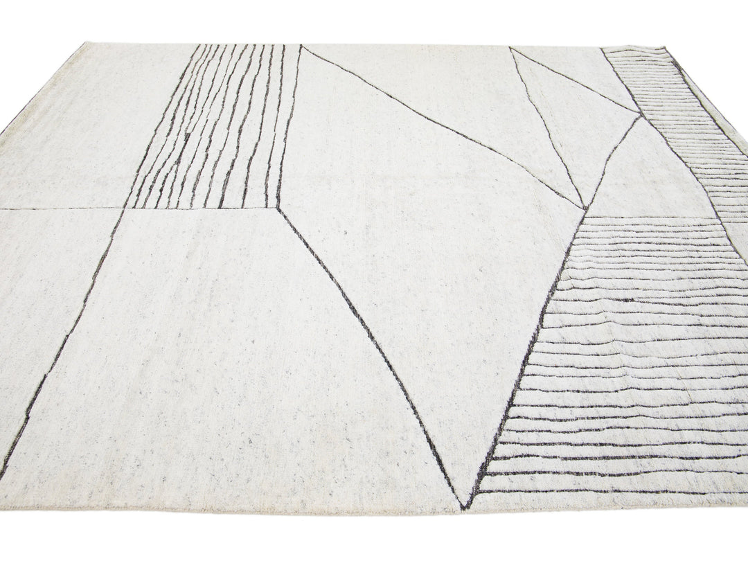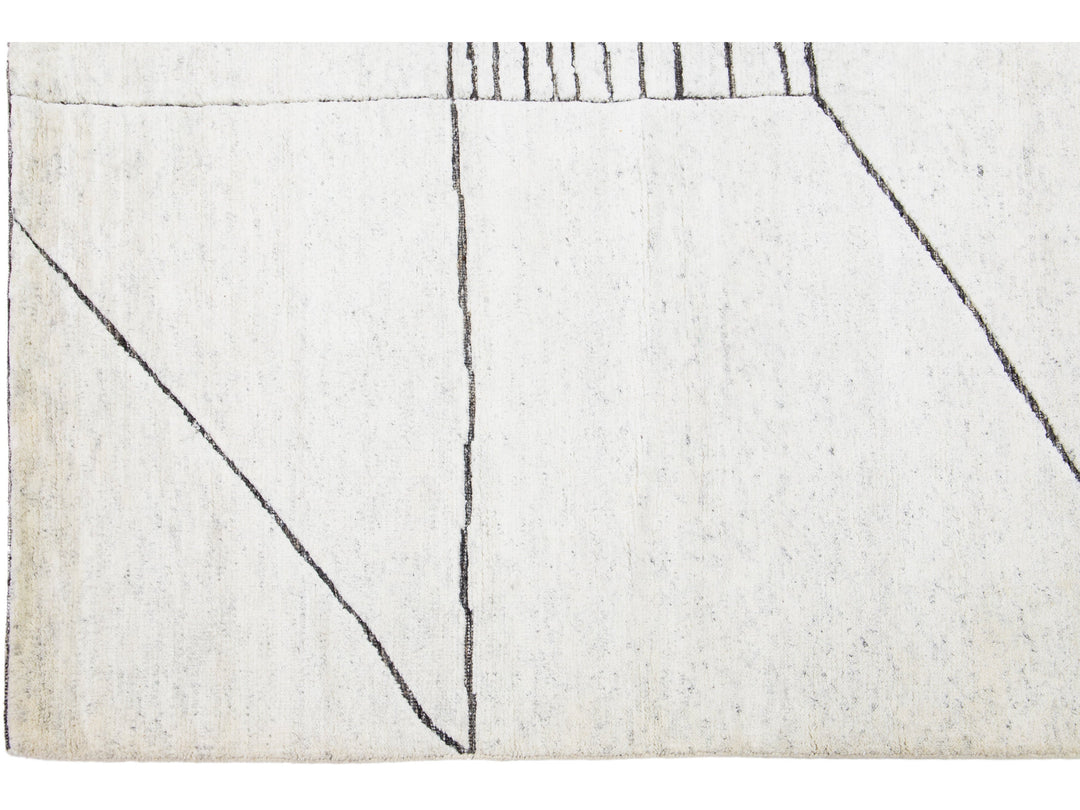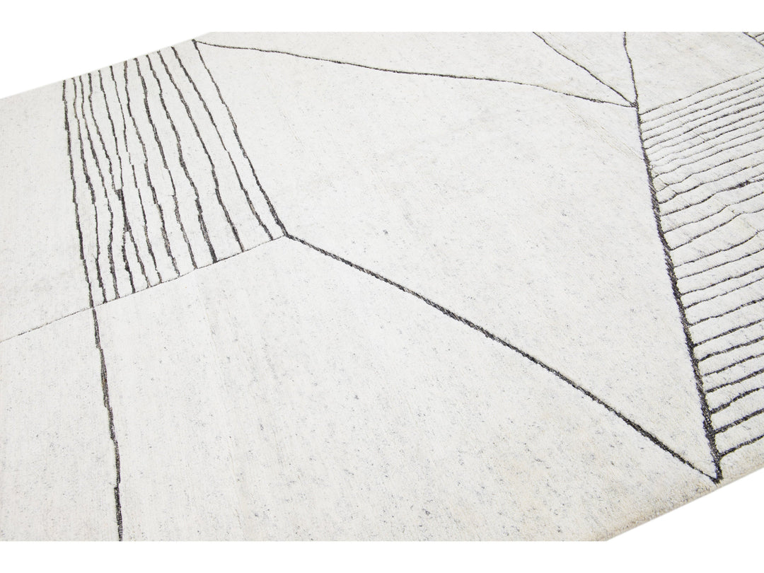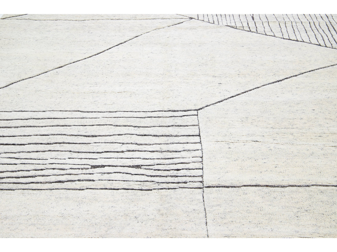 Exquisitely crafted by hand, this modern Moroccan rug features a luxuriously intricate geometric design in the most elegant of ivories. The lavish wool fibers add a soft texture and undeniable glamour to any space, bringing a splash of sophistication to your home.