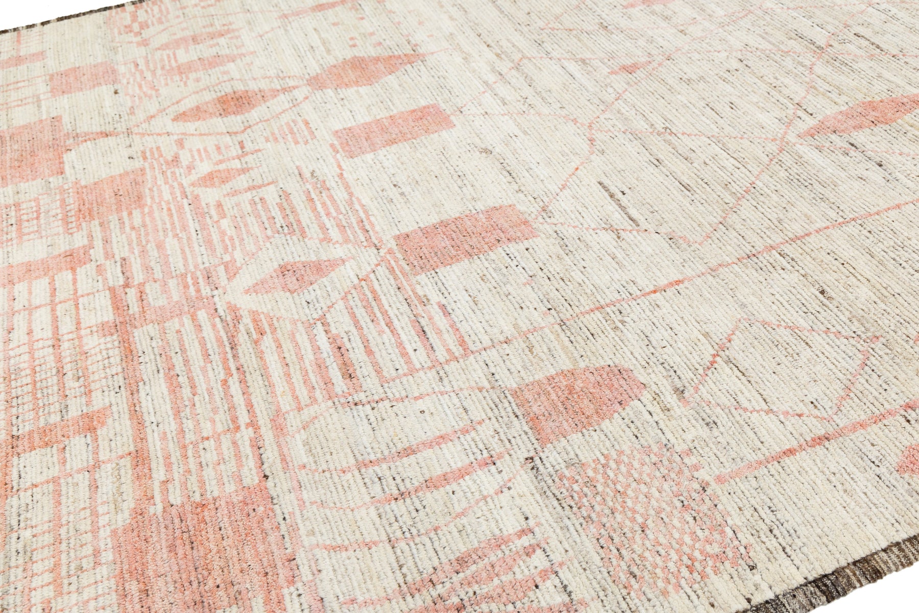 This modern Moroccan-style wool rug showcases a playful mix of abstract geometric motifs in soft pink and red tones over a light beige field. Handwoven with artisanal texture, its whimsical yet refined design adds warmth and character to contemporary, boho, or eclectic interiors. This rug measures 9' x 12'2".