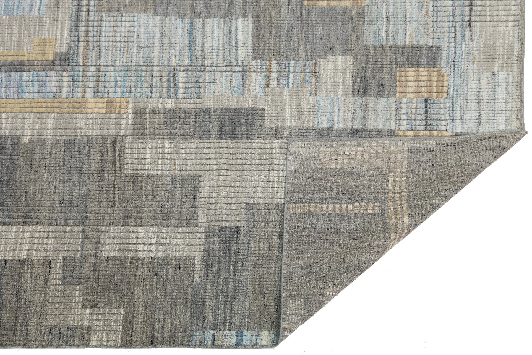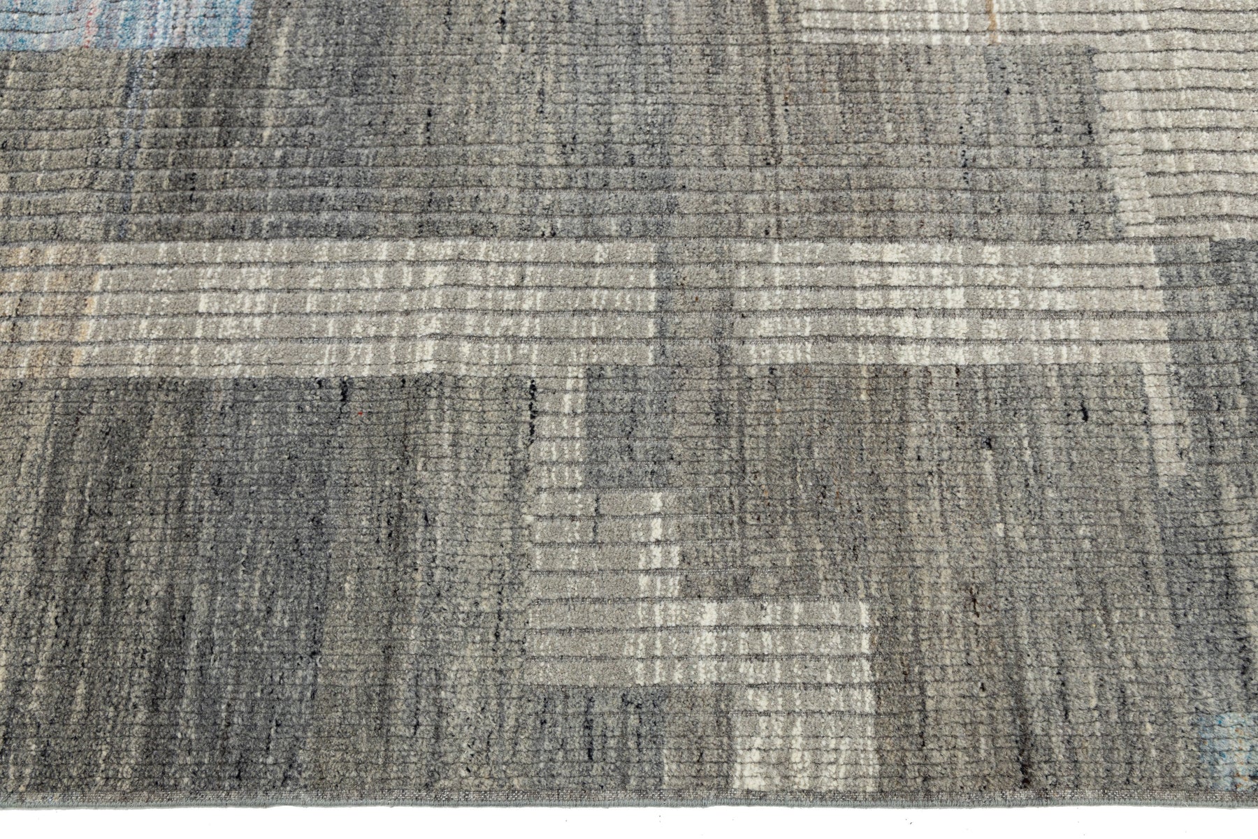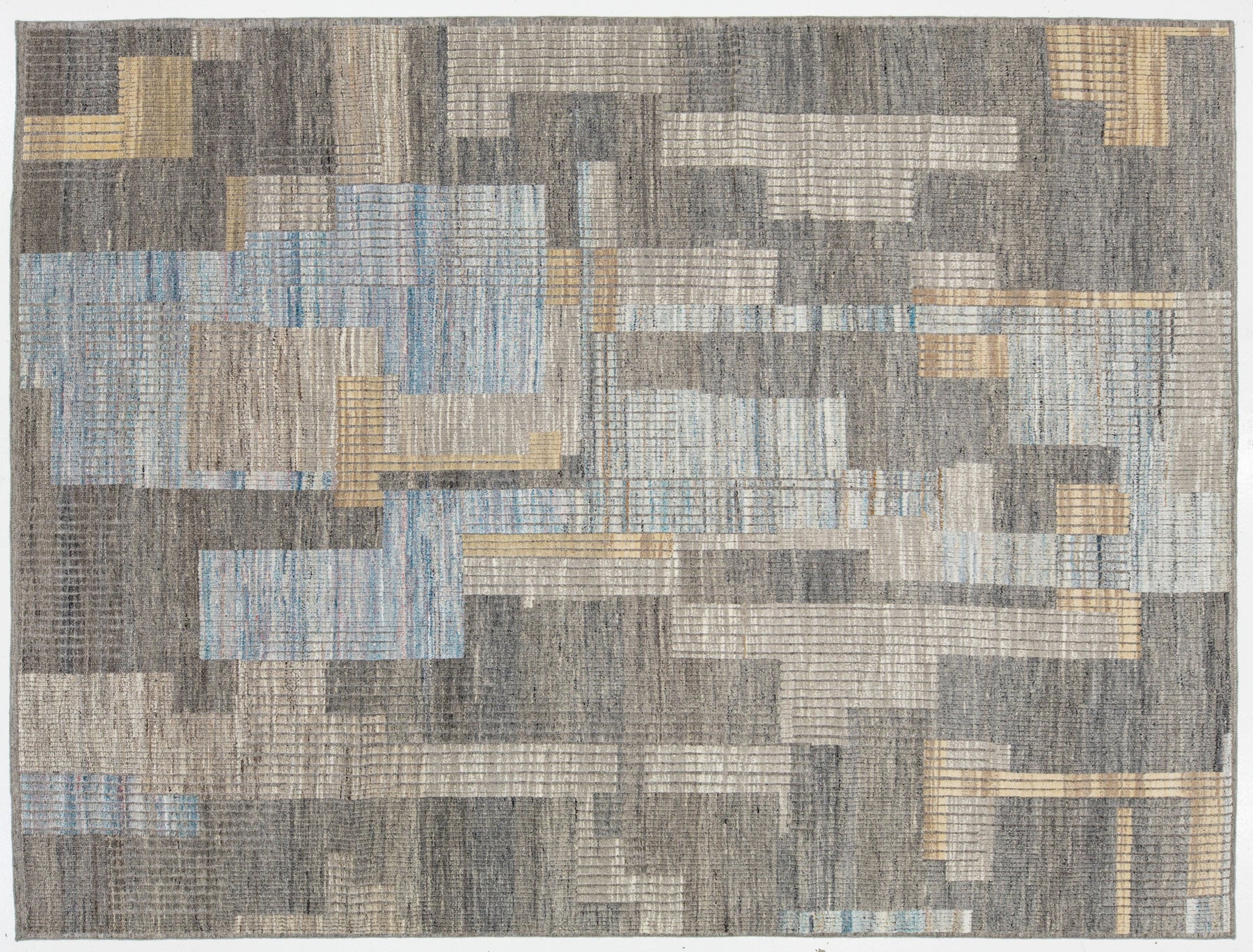 Contemporary Moroccan-style wool rug featuring a pixelated grid of overlapping rectangles in muted tones of blue, gray, beige, and cream. The abstract composition and vertical texture lines lend depth and sophistication, ideal for modern interiors seeking a refined, artisanal statement piece This rug measures 9'2" x 12'1".