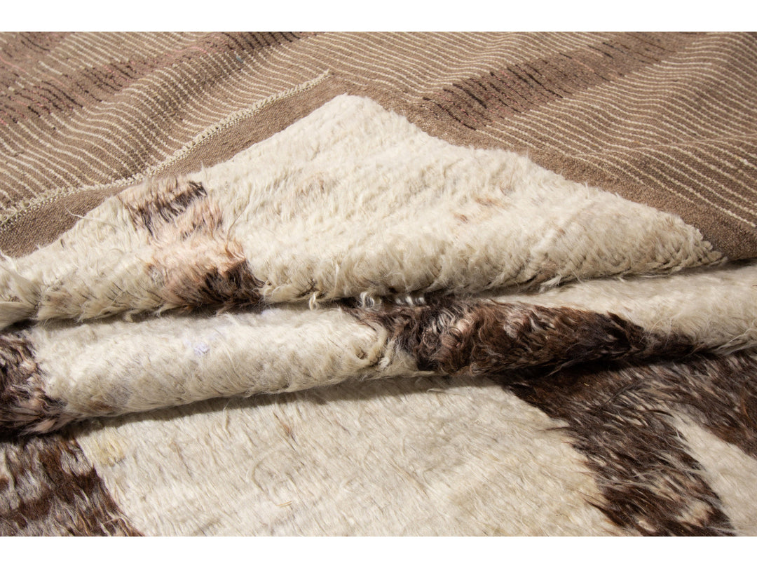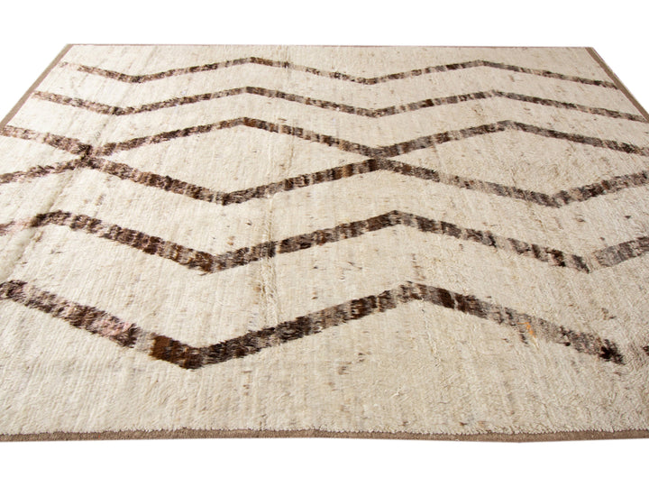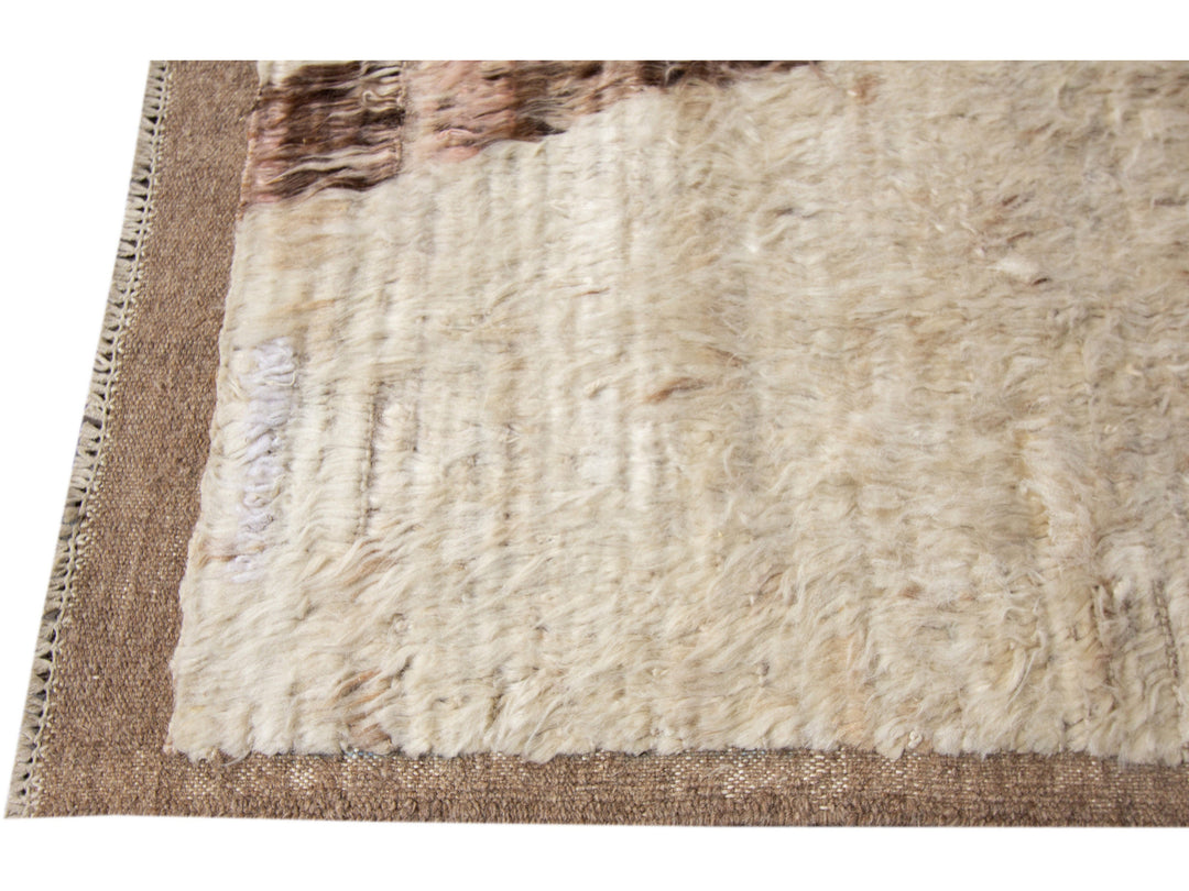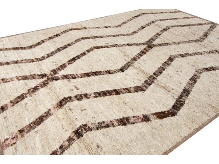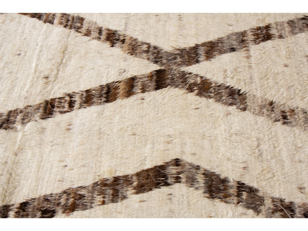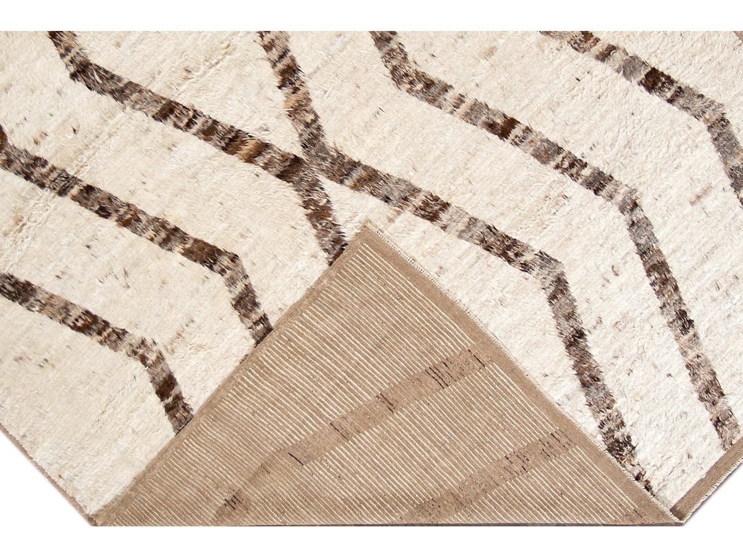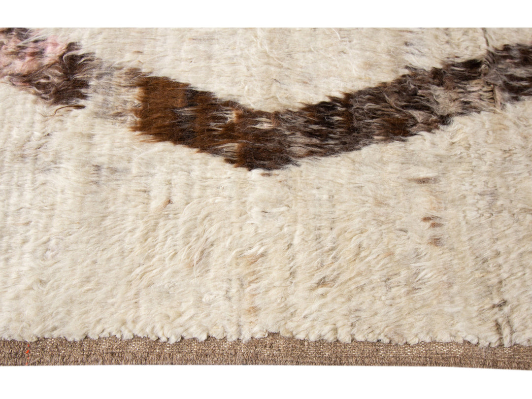 The mesmerizing Moroccan pattern showcased on this hand-knotted wool rug exudes a contemporary allure, blending an elegant brown hue with a captivating beige background. Its visually stunning Tribal design creates a captivating contrast, perfectly complementing any interior.