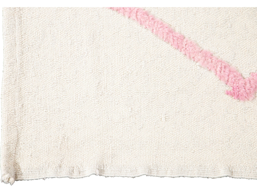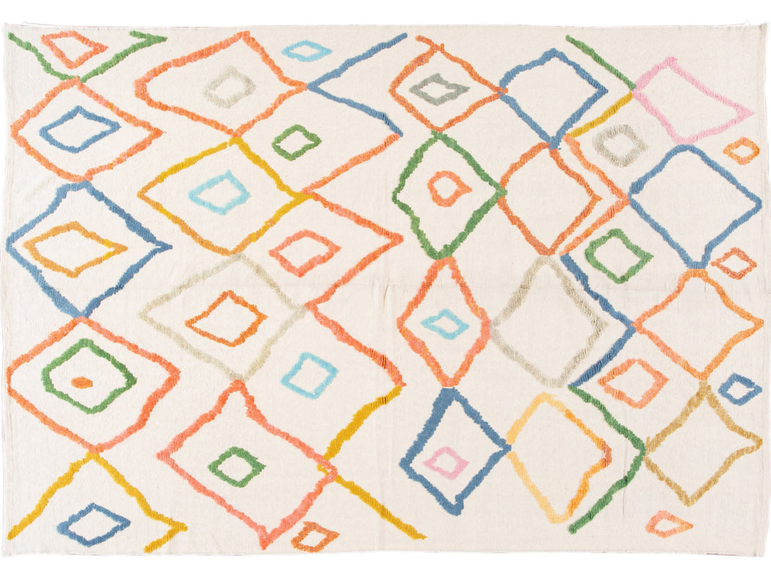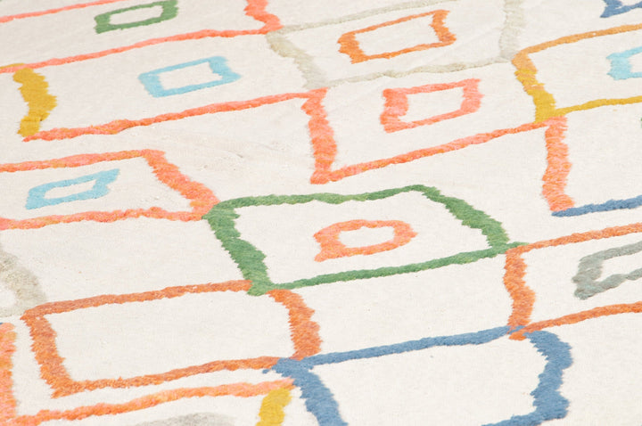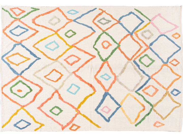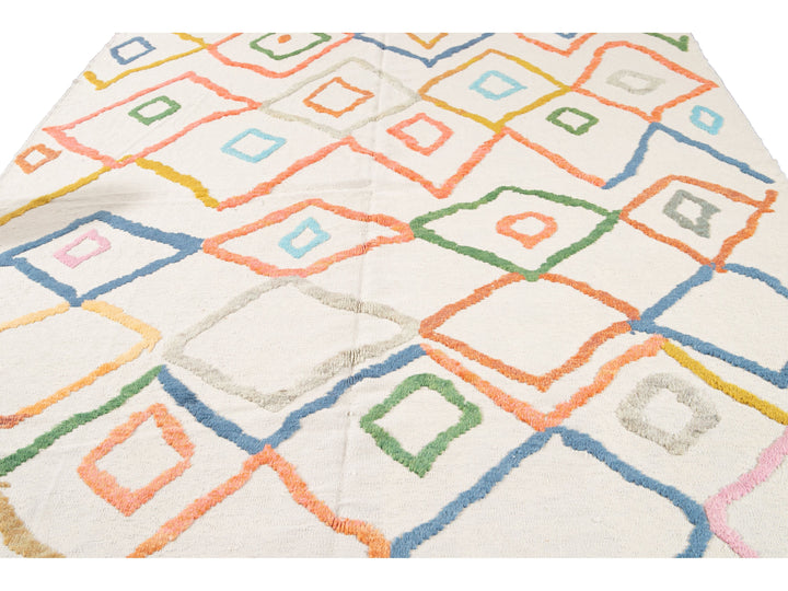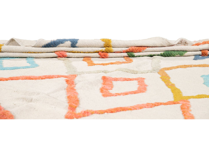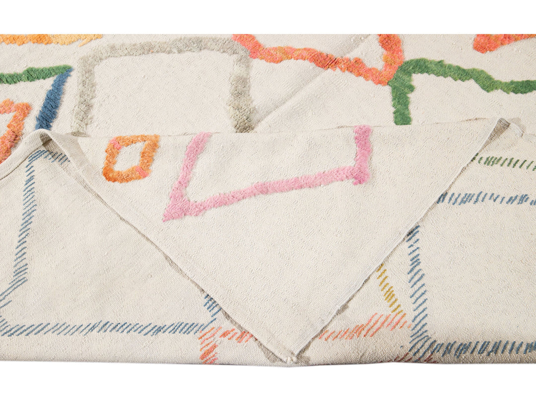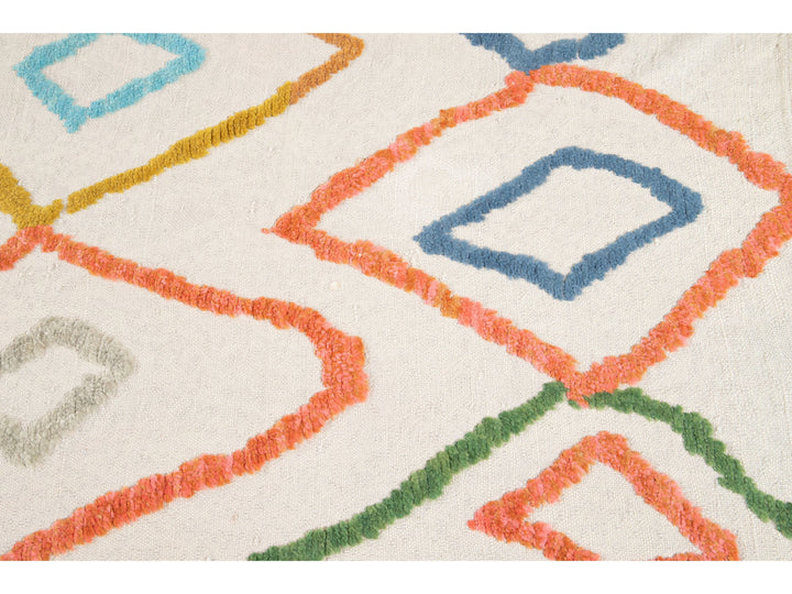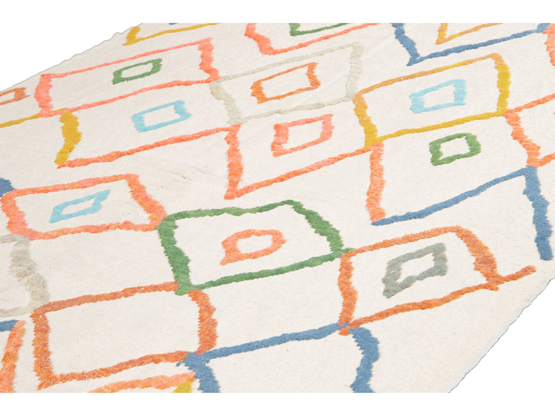 The mesmerizing Moroccan pattern showcased on this hand-knotted wool rug exudes a contemporary allure in multicolor hues with a captivating ivory background. Its visually stunning Tribal design creates a captivating contrast, perfectly complementing any interior.