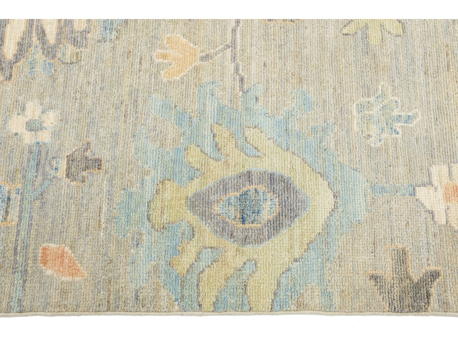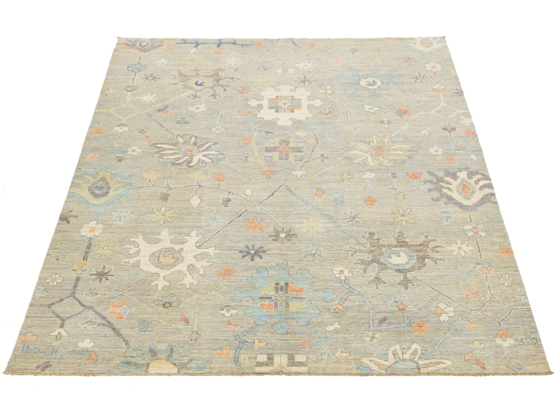 Hand-knotted modern Oushak style wool rug featuring a serene palette of beige, blue, and terracotta. Inspired by traditional Turkish designs, its stylized floral and geometric motifs offer timeless elegance with a contemporary twist. Ideal for refined interiors seeking warmth, texture, and artisanal charm. This rug measures 8'1" x 10'1".
