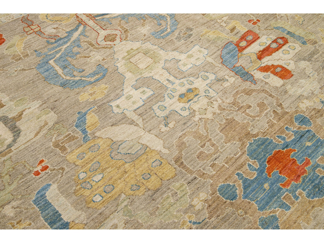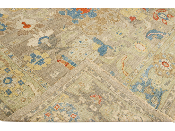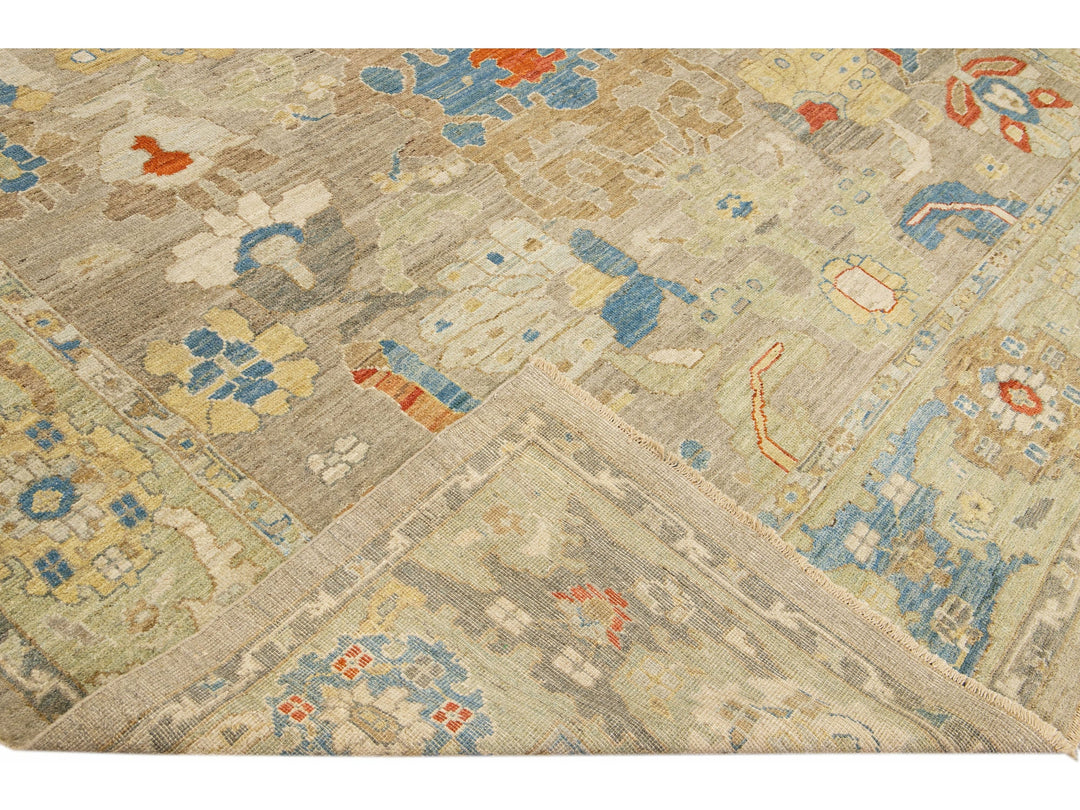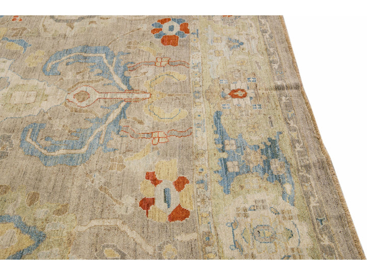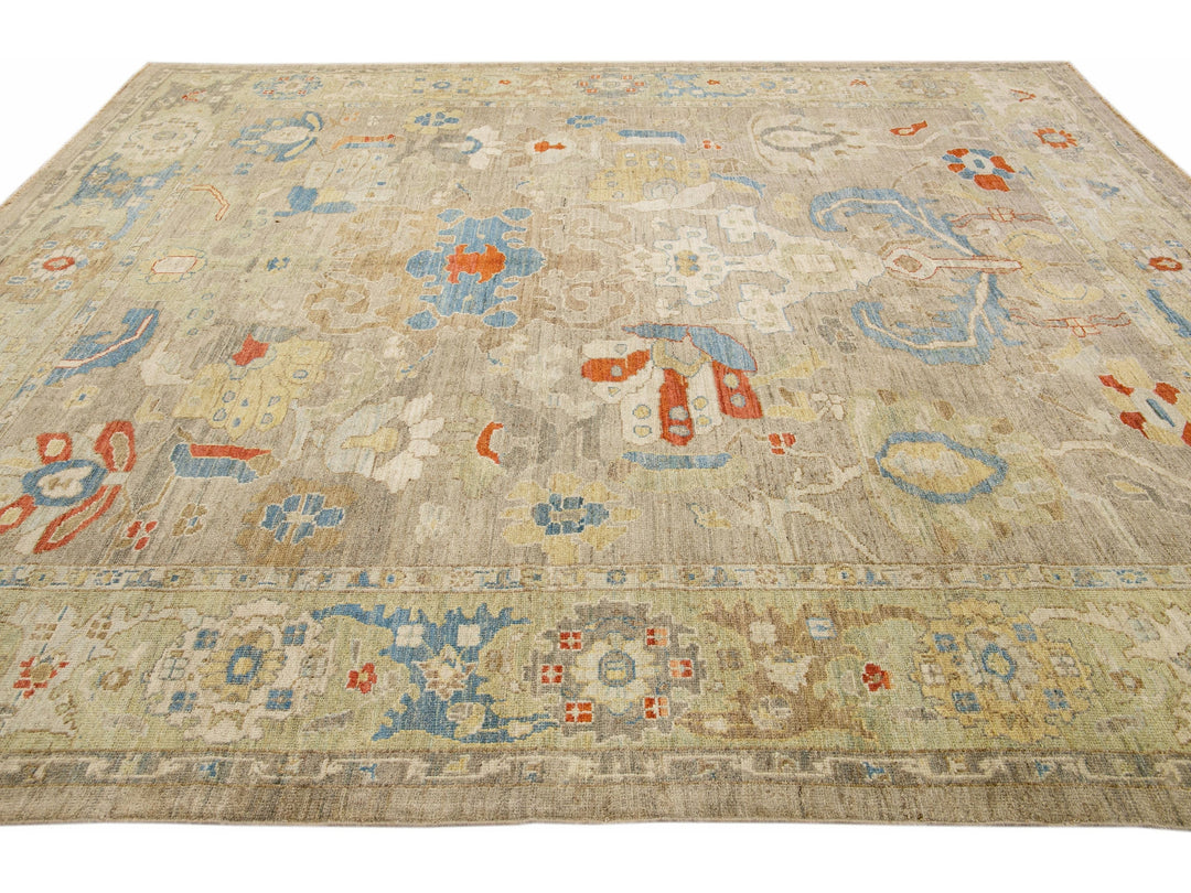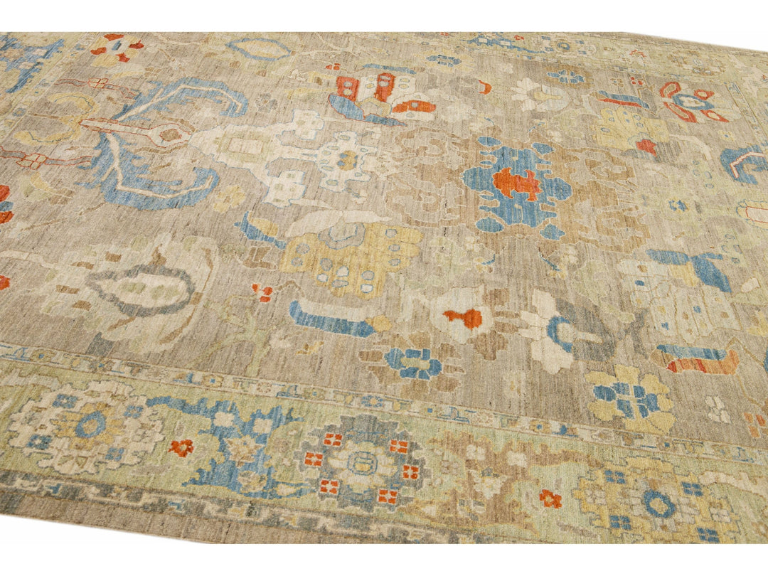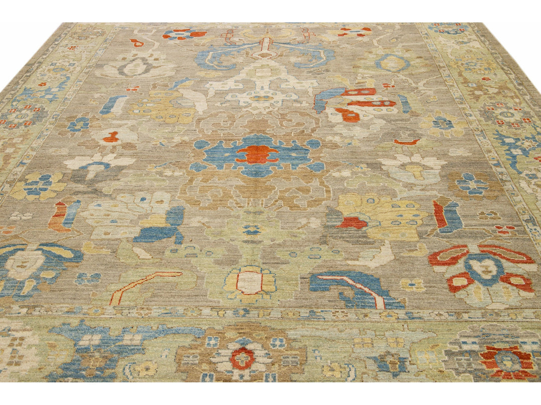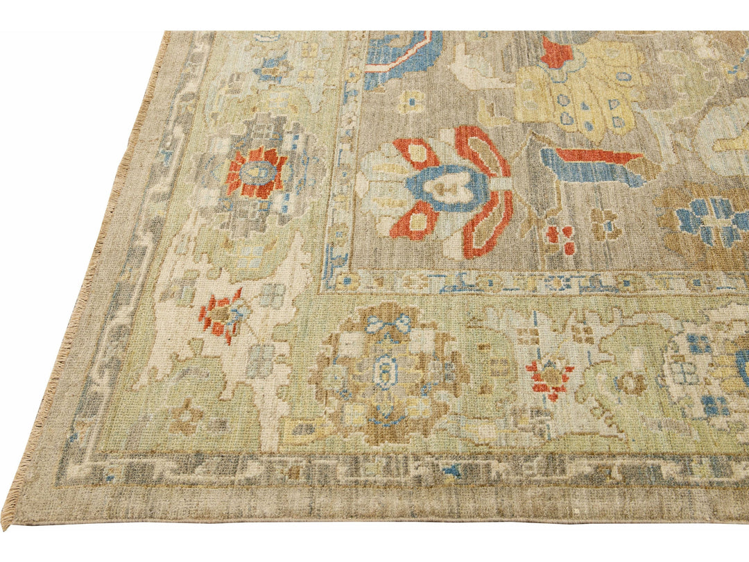 This stunning, hand-knotted Sultanabad rug features a modern design with a light brown base. The Persian rug is bordered with a green frame and embellished with many colors that form an attractive floral pattern.