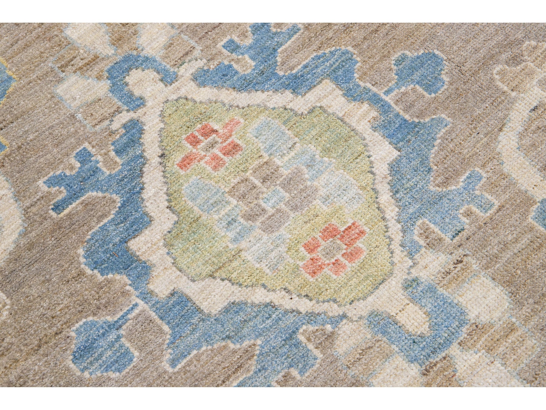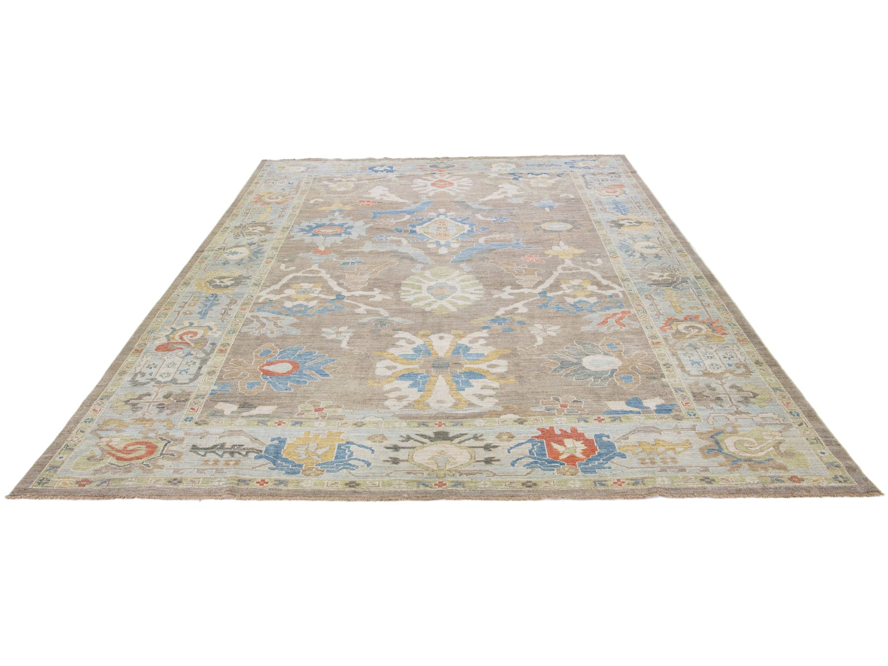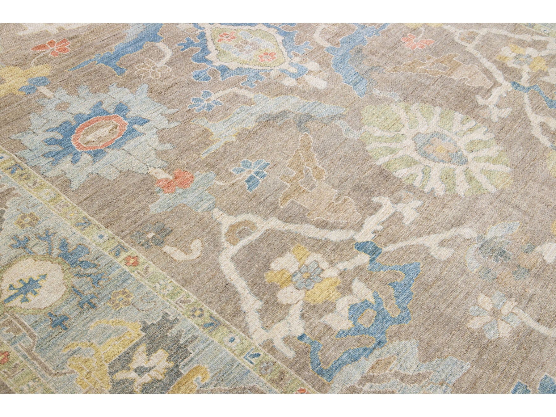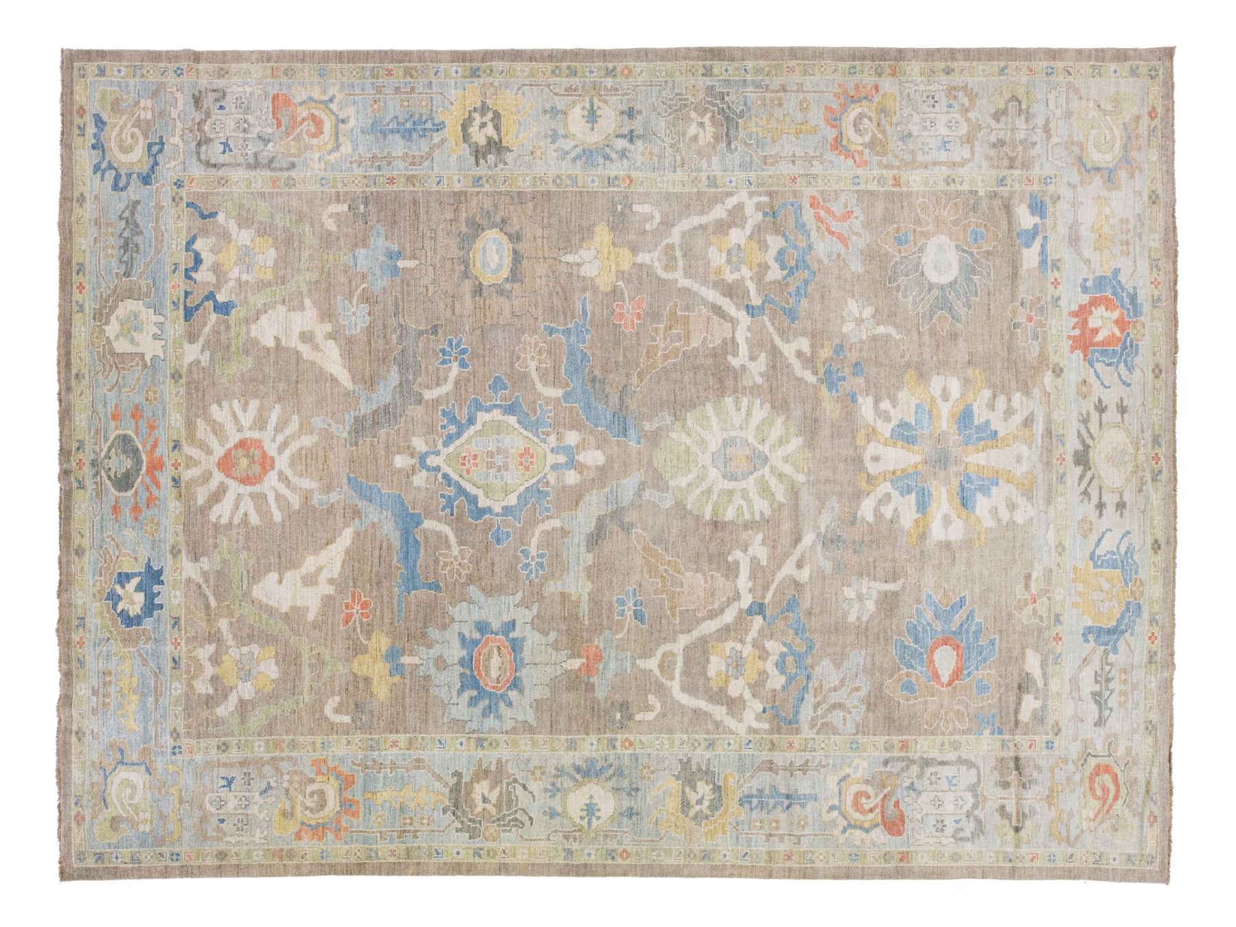 This refined 21st-century modern Sultanabad rug showcases a hand-knotted craftsmanship with delicate light brown and multicolor motifs framed by light blue borders. The rug’s dimensions are 10'06" by 14'03".