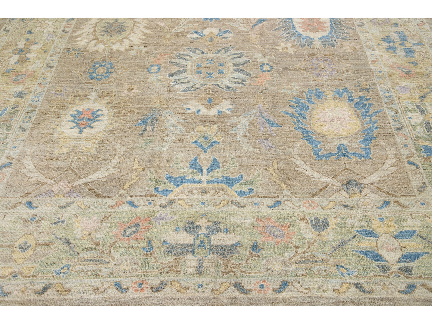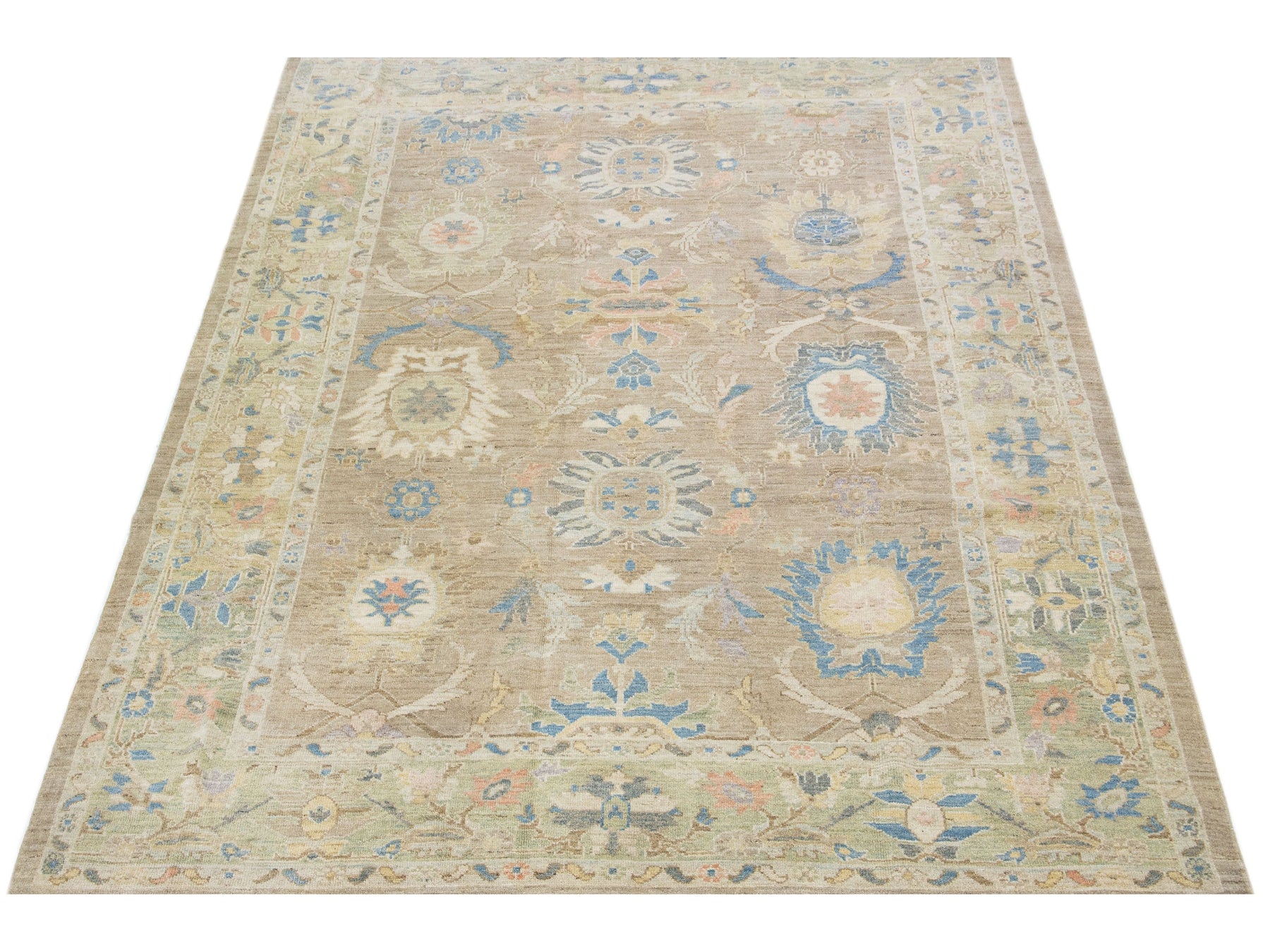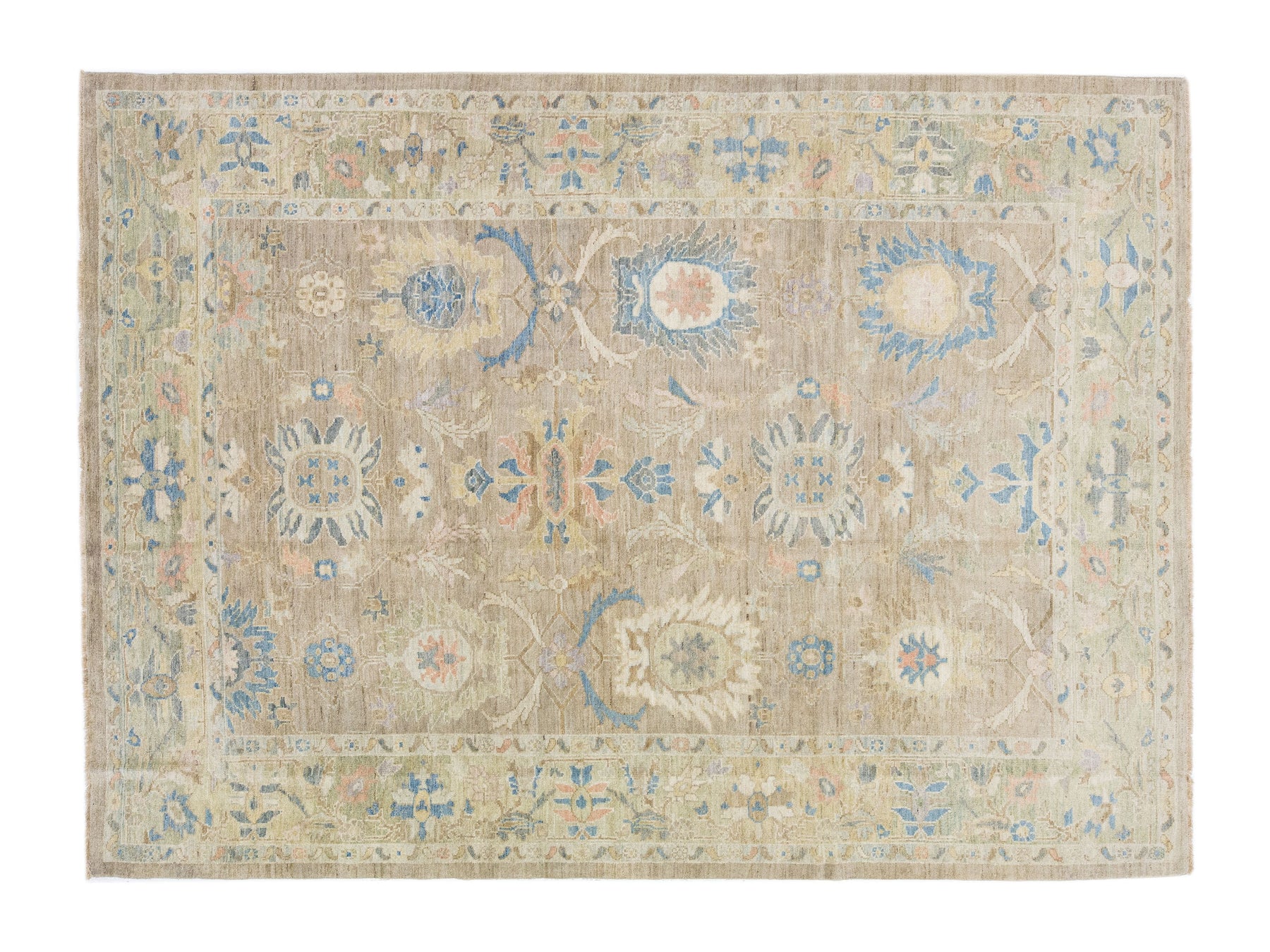 Beautiful modern Sultanabad hand knotted wool rug with a tan color field. This rug has a green-designed frame with multicolor accents in a gorgeous all-over floral design. This rug measures: 8'11" x 12'3".