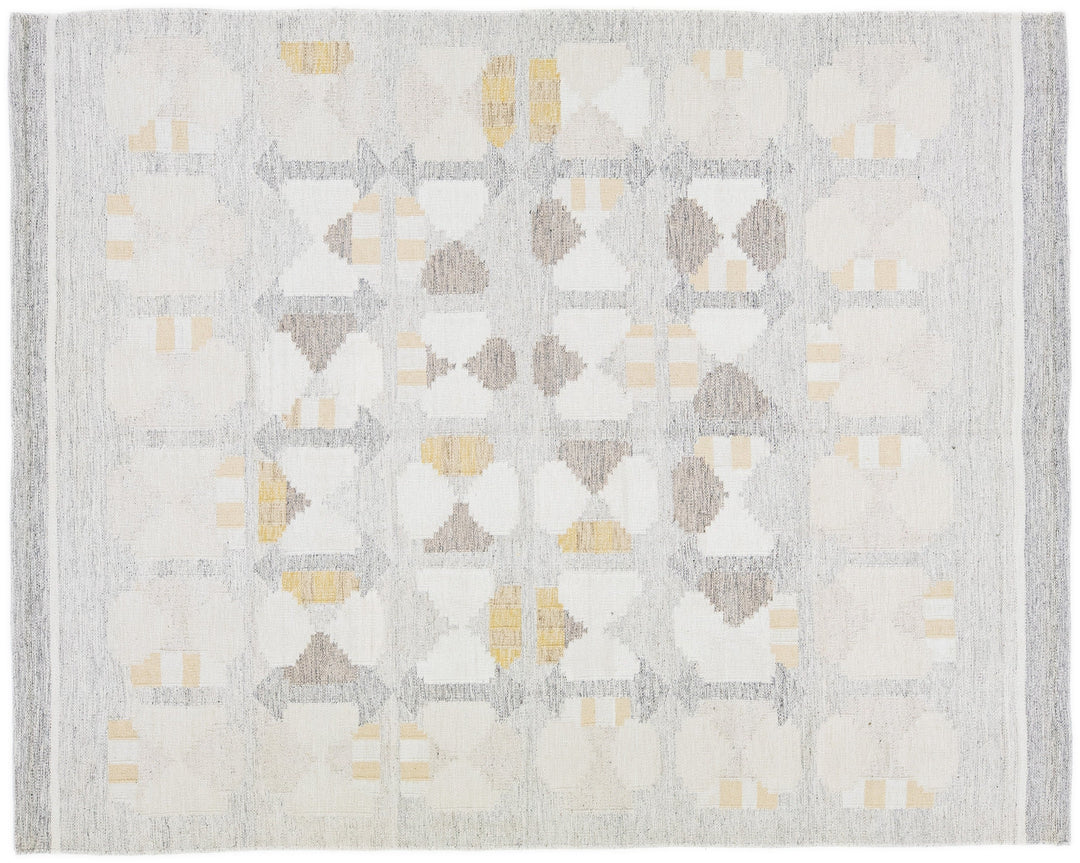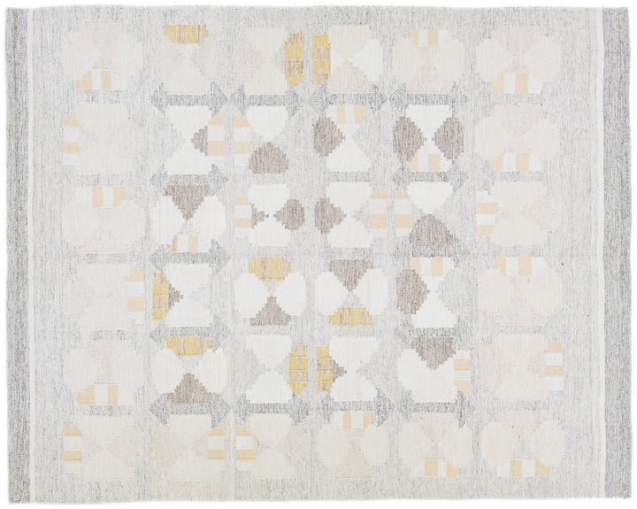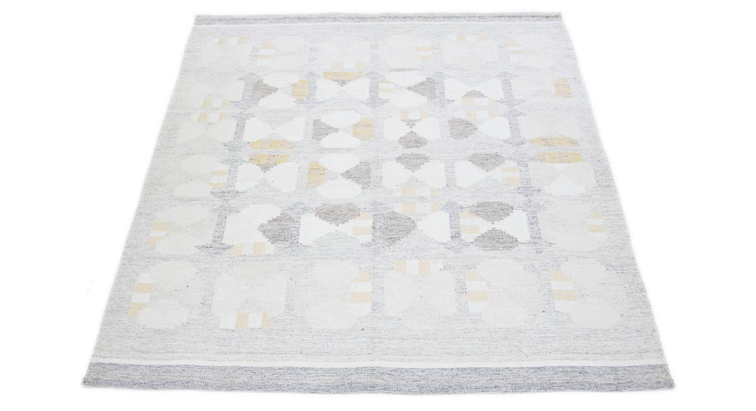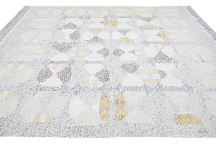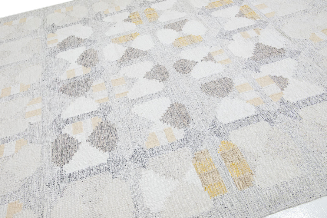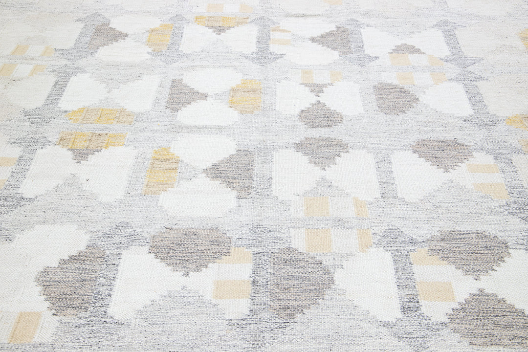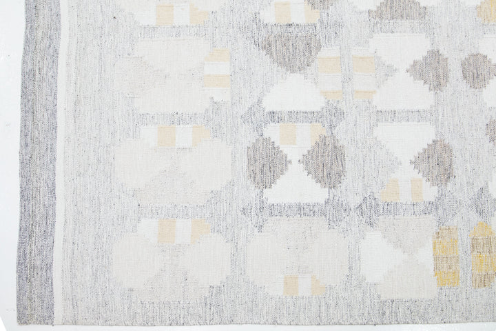 The flatweave rug showcases a contemporary Swedish design with a subtle gray base. It features an elaborate geometric pattern covering the whole surface, enhanced by subdued tones of yellow and ivory.