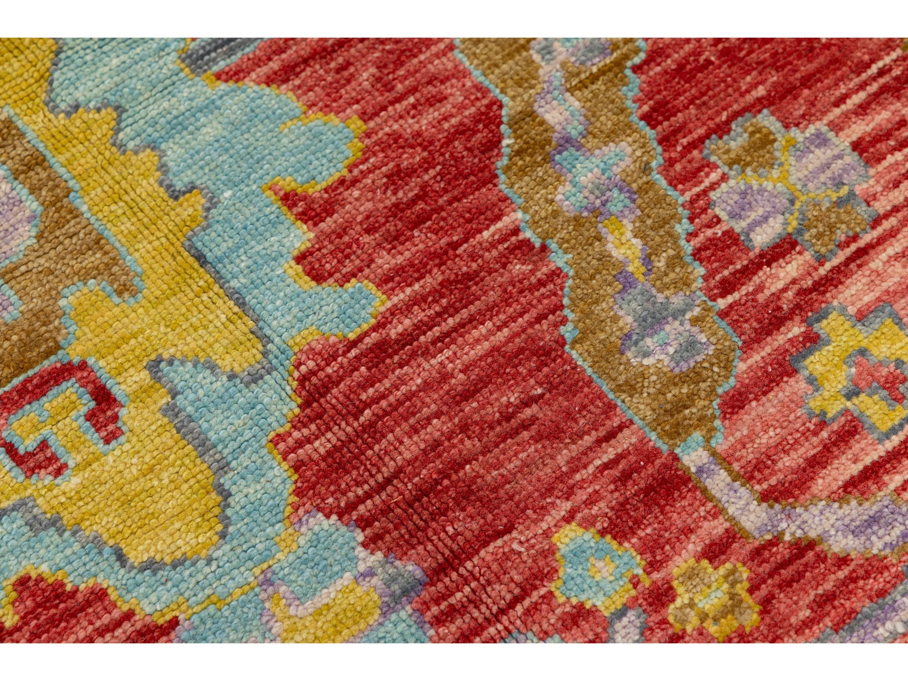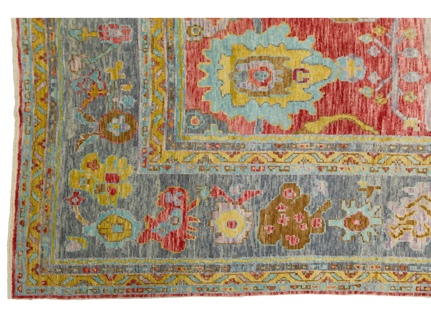 This Modern Oushak Style Wool Rug combines a contemporary flair with traditional Oushak artistry. It showcases a soft beige background adorned with vibrant floral patterns in shades of blue, brown, and gold, gracefully spreading across the rug. This stunning piece adds an elegant touch to any space. This rug measures 12'2" x 18'2".