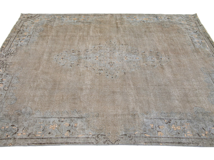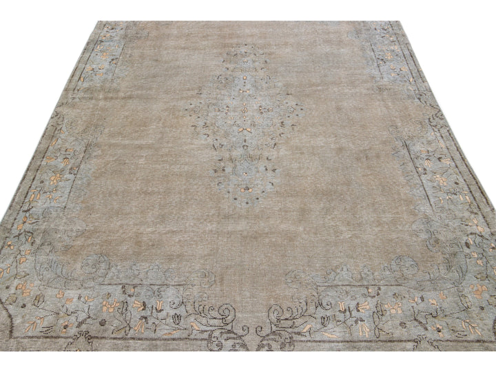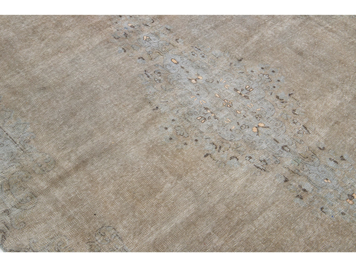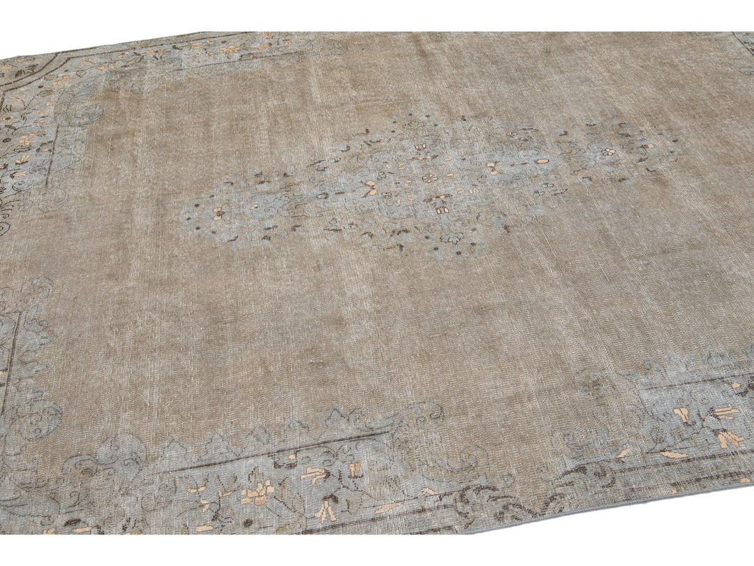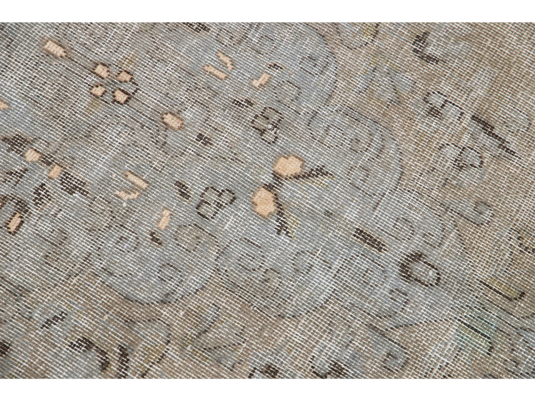 This hand-knotted wool rug is a stunning vintage distressed piece featuring a beige field with exquisite craftsmanship. This Persian rug is adorned with gray accents and showcases an intricate all-over medallion design.