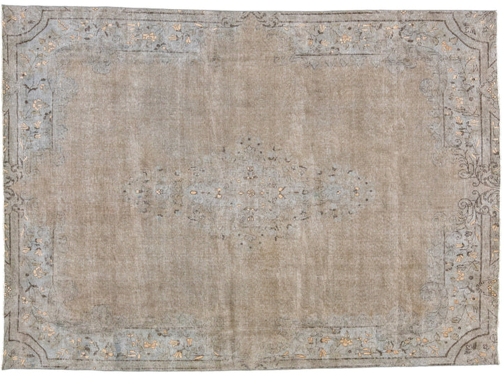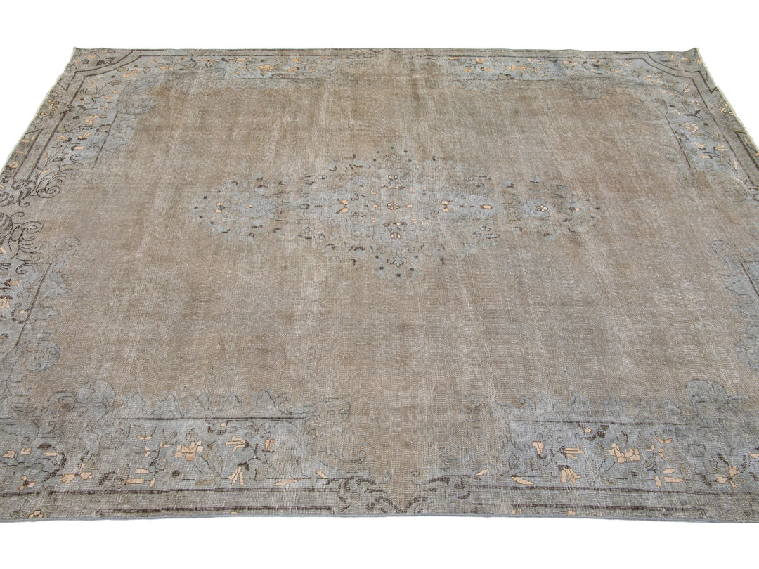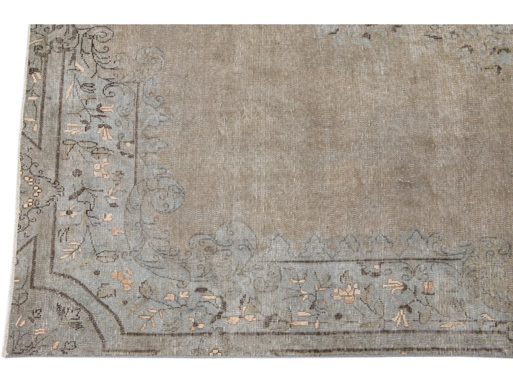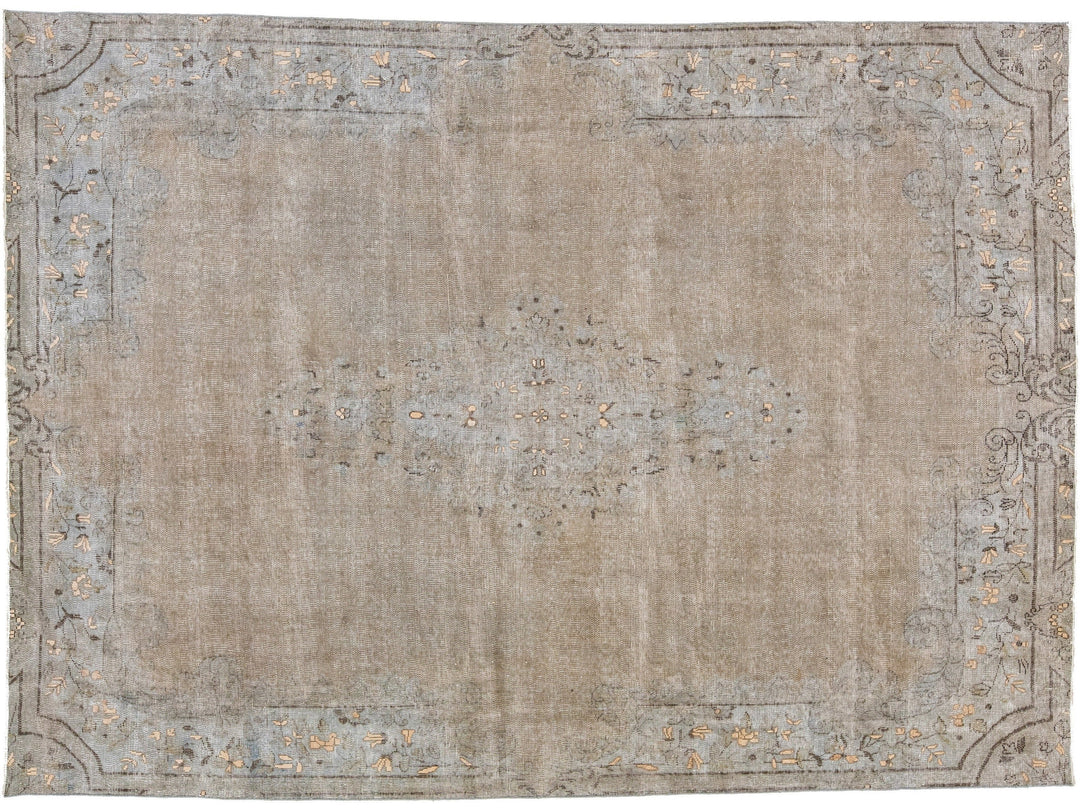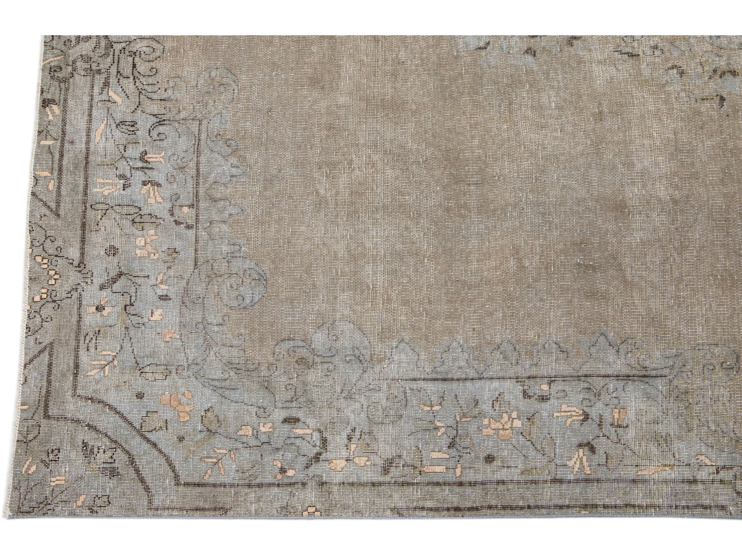 This hand-knotted wool rug is a stunning vintage distressed piece featuring a beige field with exquisite craftsmanship. This Persian rug is adorned with gray accents and showcases an intricate all-over medallion design.