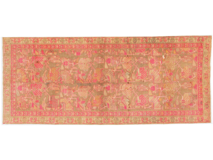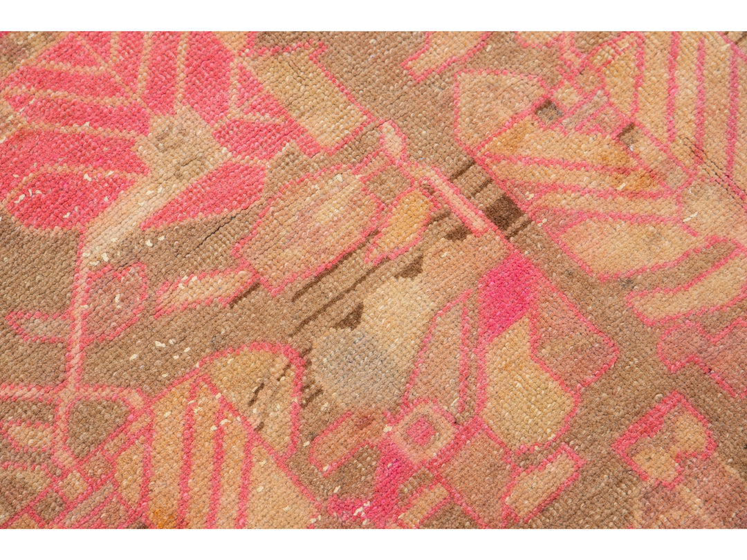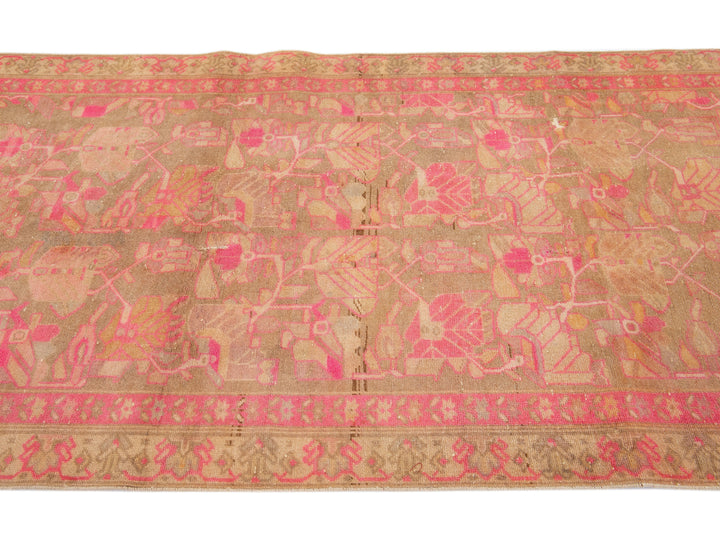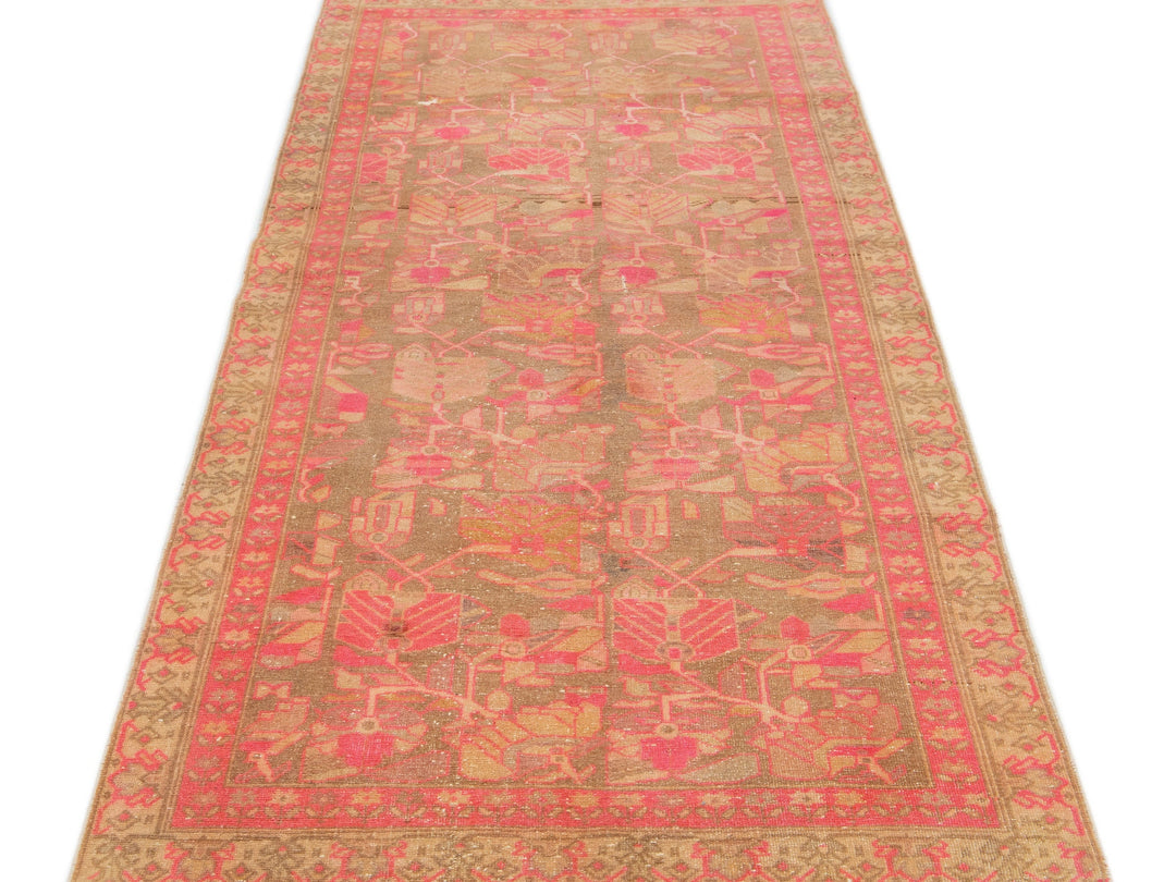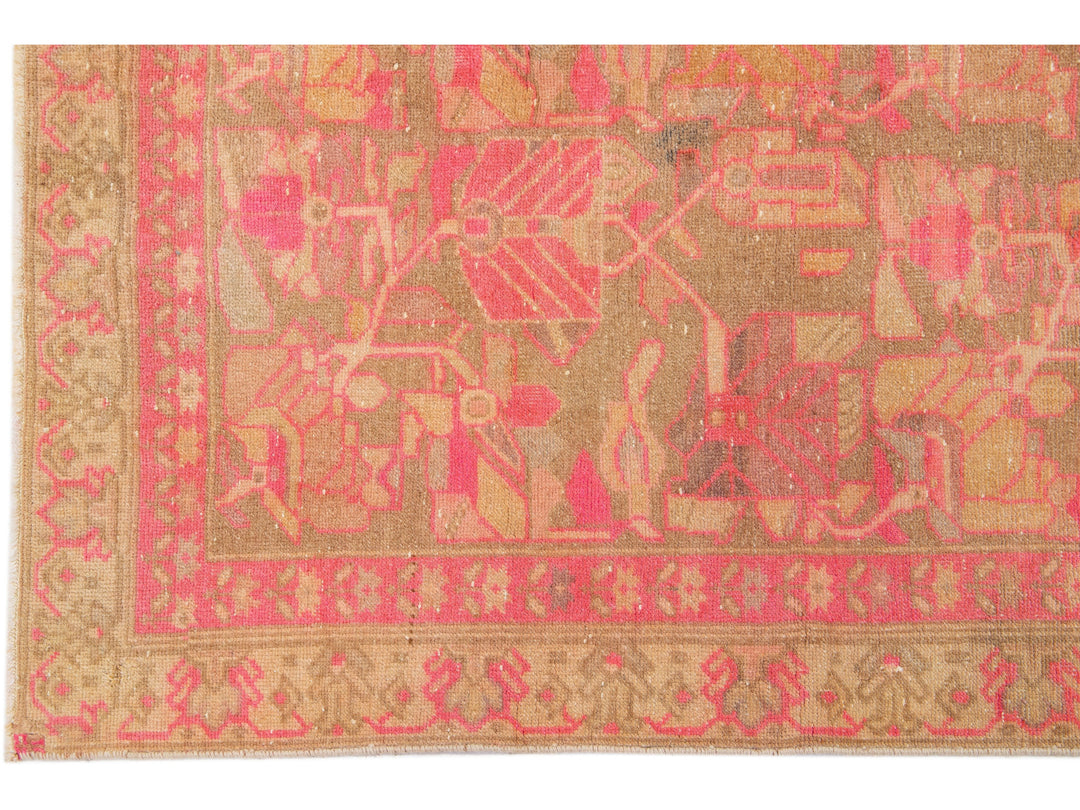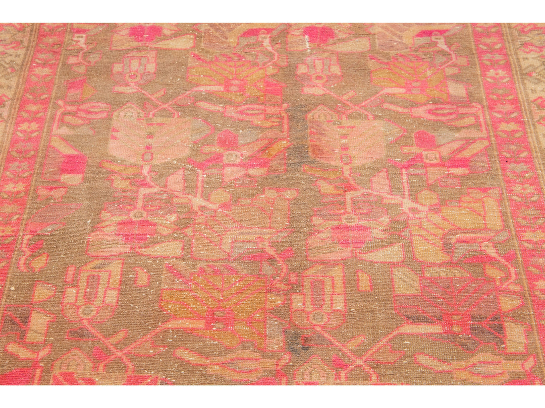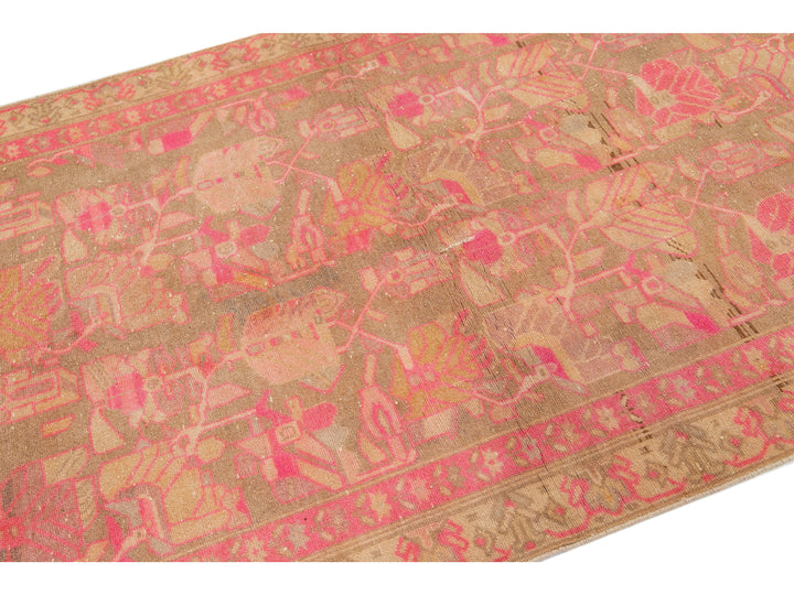 This lovely antique Malayer wool rug is hand-knotted and boasts a charming brown color field. It has a stunning floral pattern design with delightful pink and orange accents.