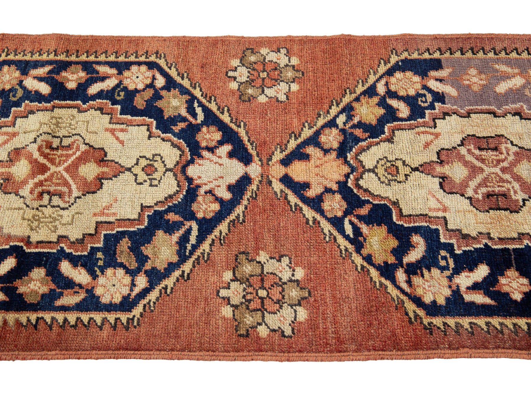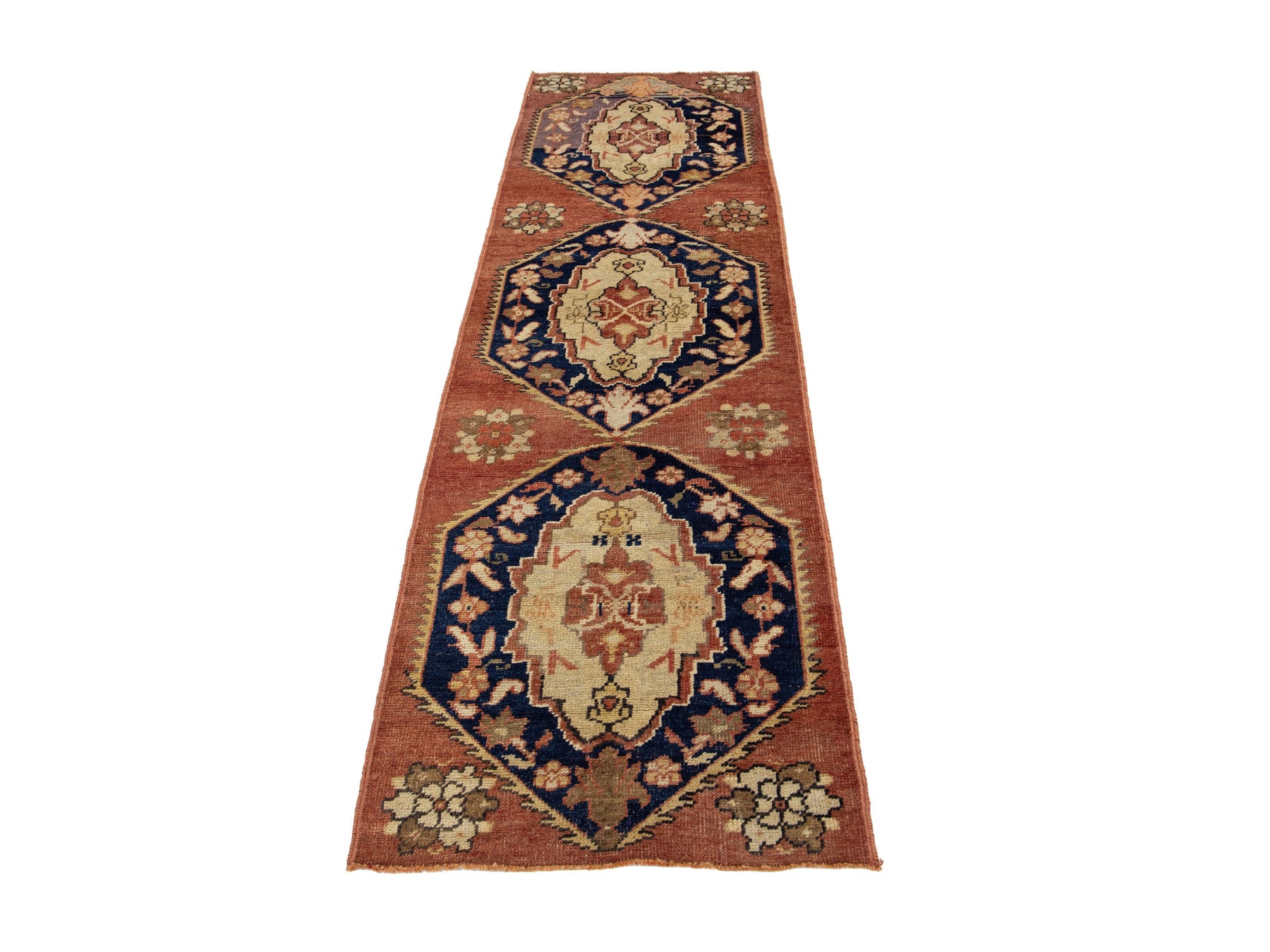 A vintage Turkish Anatolian wool runner rug, hand-knotted, featuring a geometric design displayed on a rust field. This rug measures 2'6" x 8'0".
