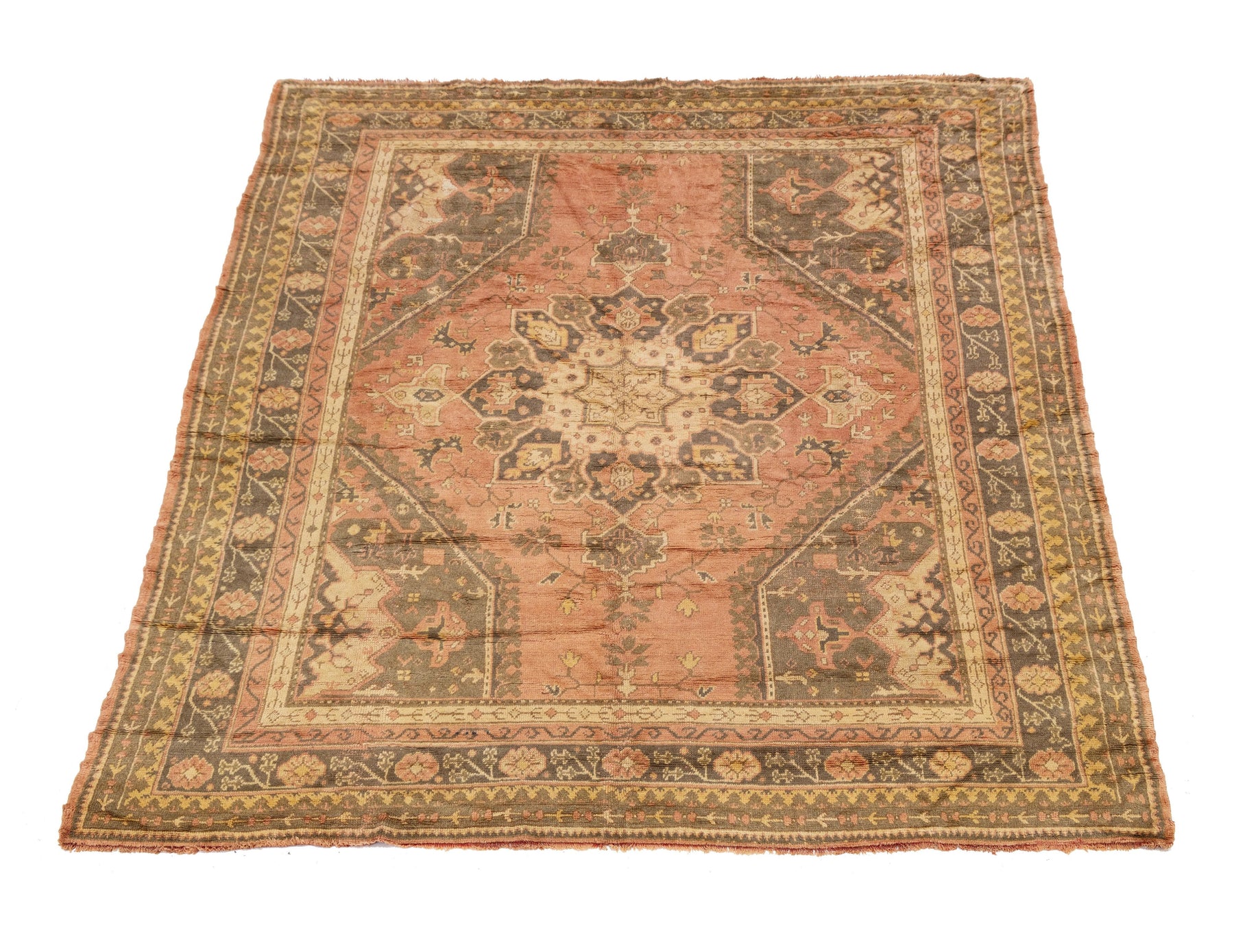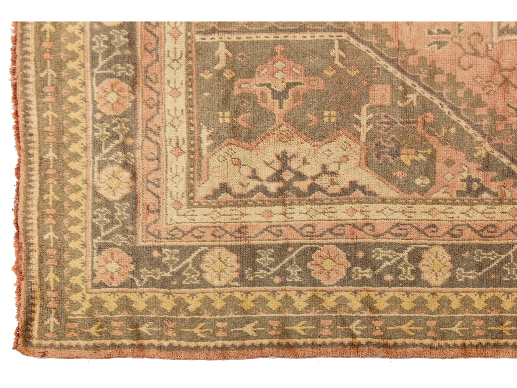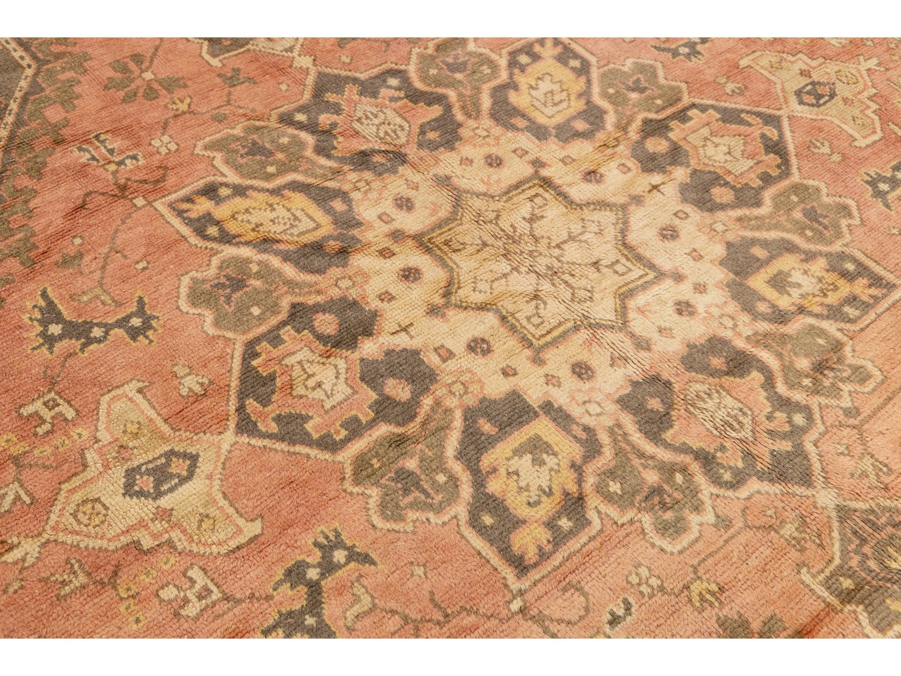 Antique Oushak wool rug featuring a luminous patina and soft, earthy tones. Handwoven with large-scale floral motifs and a spacious medallion design, this piece showcases the elegance of early 20th-century craftsmanship. Ideal for collectors and designers seeking a refined, decorative statement with timeless appeal. This rug measures 9'7" x 11'3".