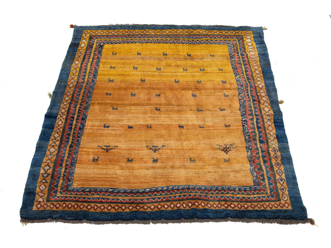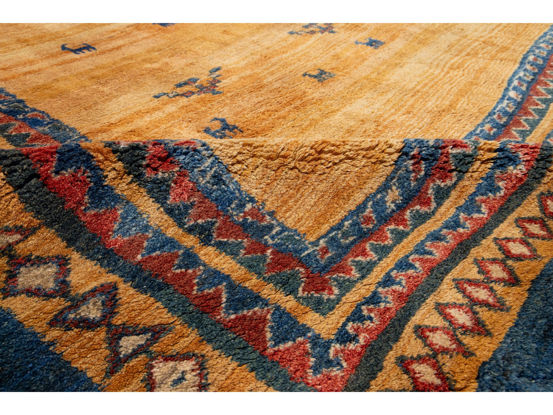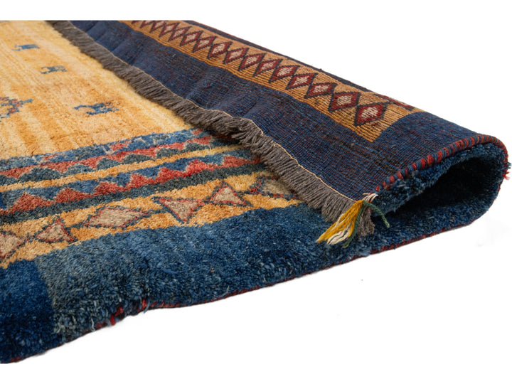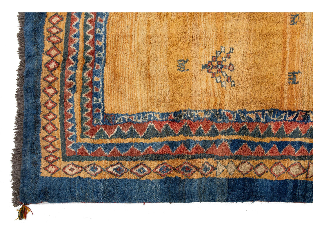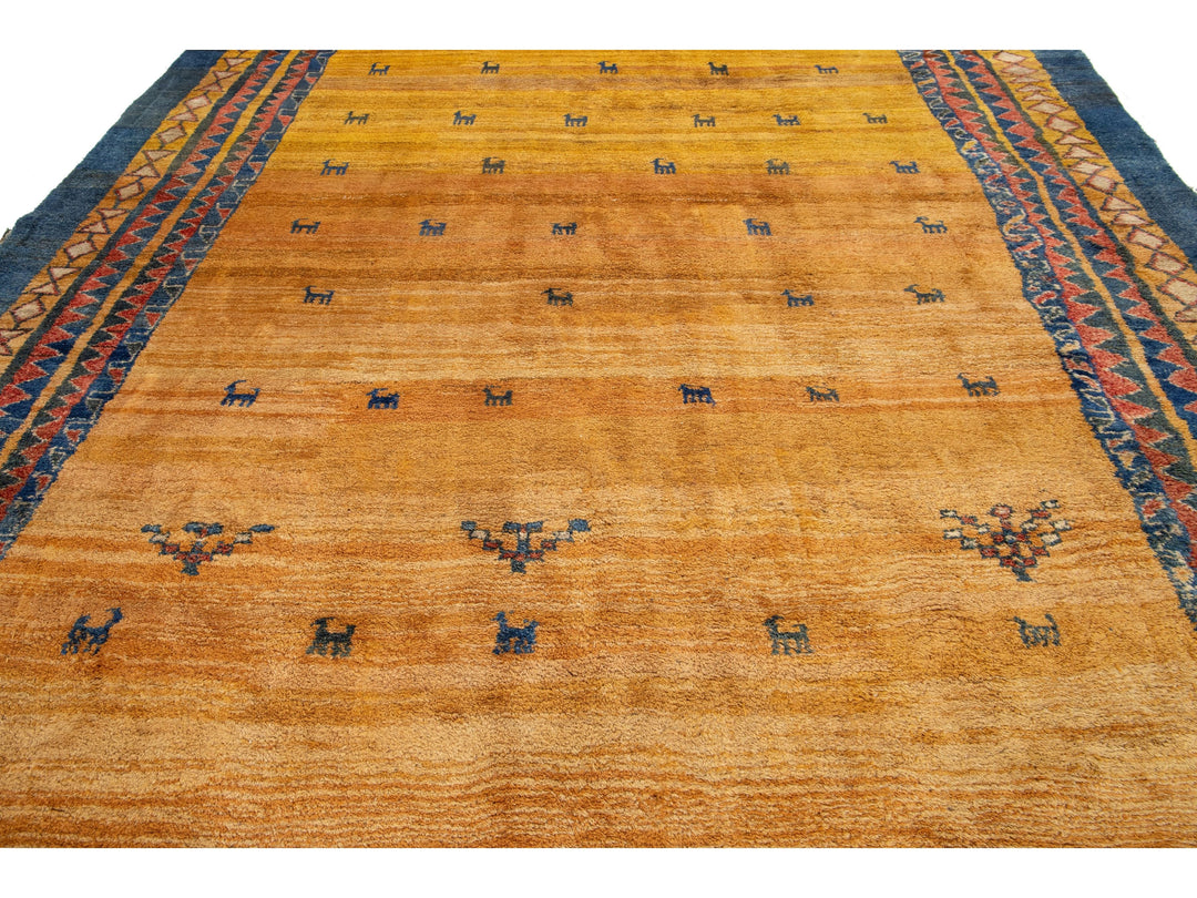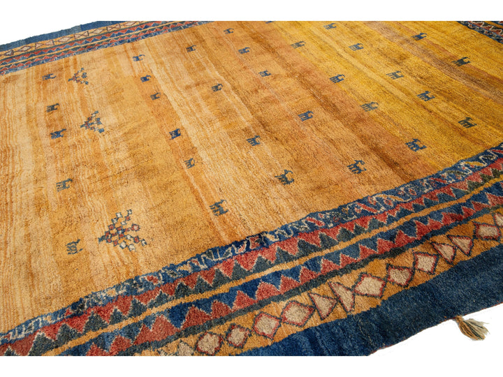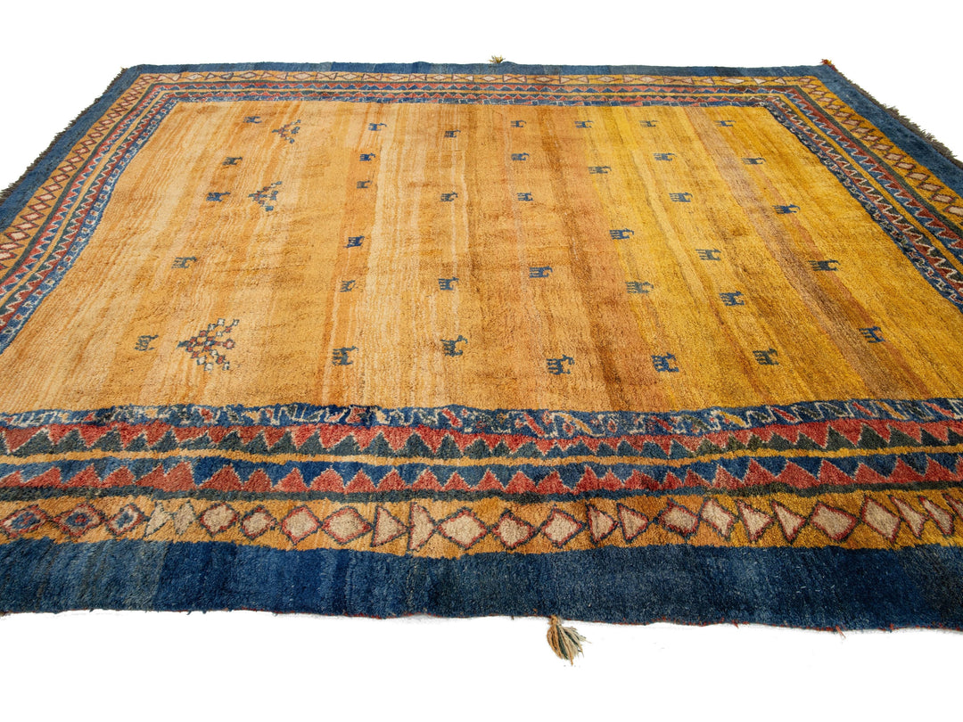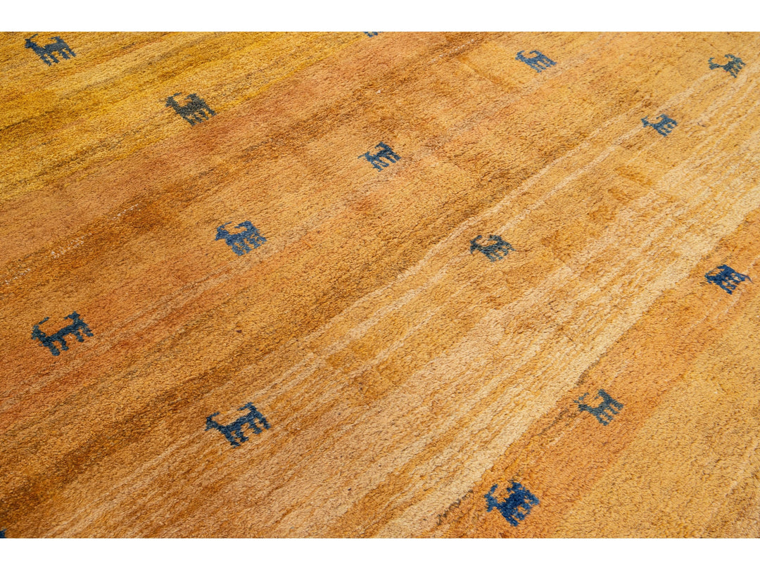 This modern Gabbeh rug is hand-knotted with a contemporary geometric pattern. The goldenrod base is accented with red and blue details. This rug measures 10'5" x 12'8".