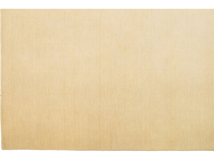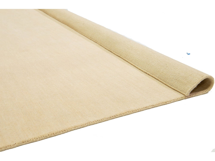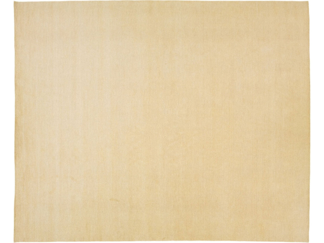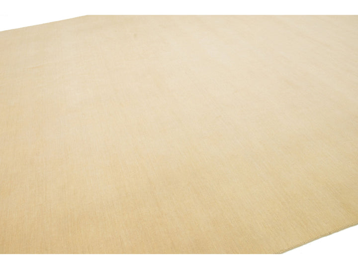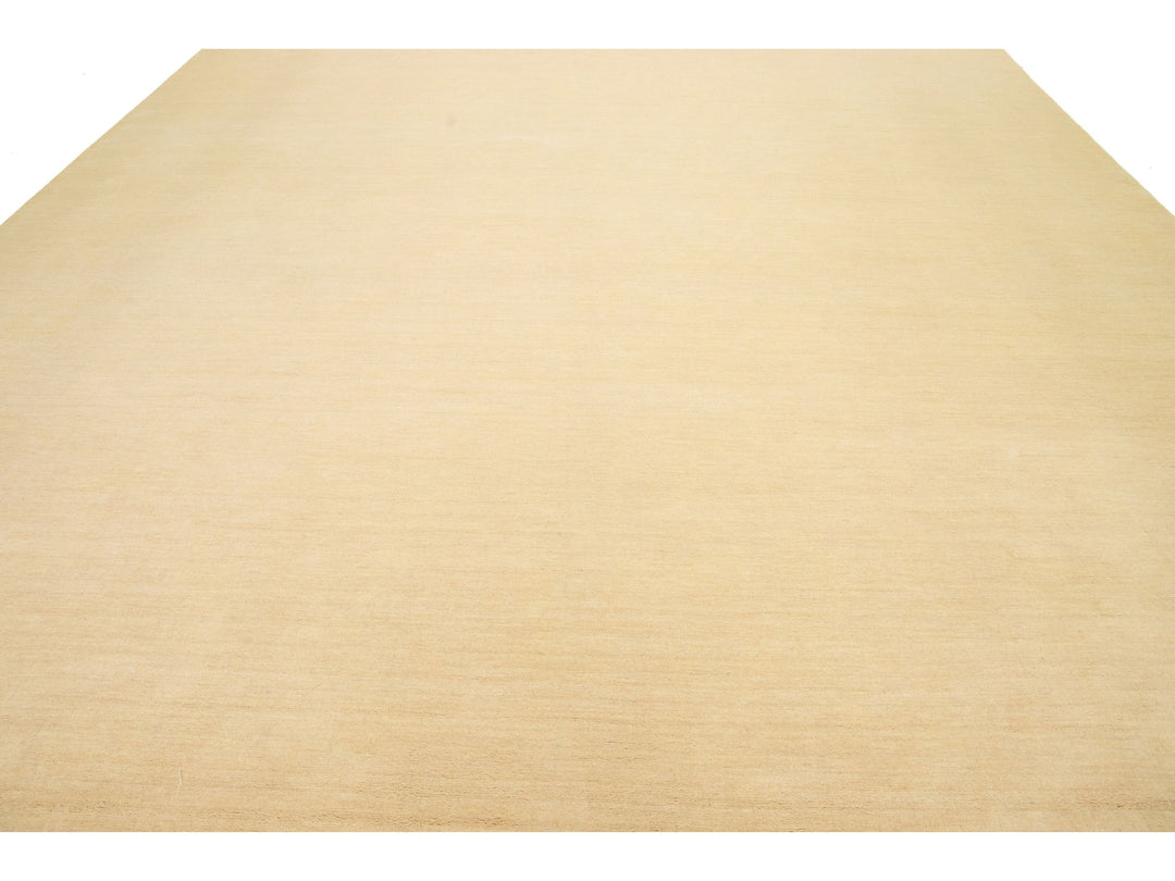 This handcrafted custom wool rug, designed in the Gabbeh style, features a solid beige design. It is part of our Desert Collection and comes in multiple colors. We use hand-loomed techniques for superior quality and longevity. The estimated lead time for customs is 15-20 weeks. This rug measures 12'4" x 15'1".