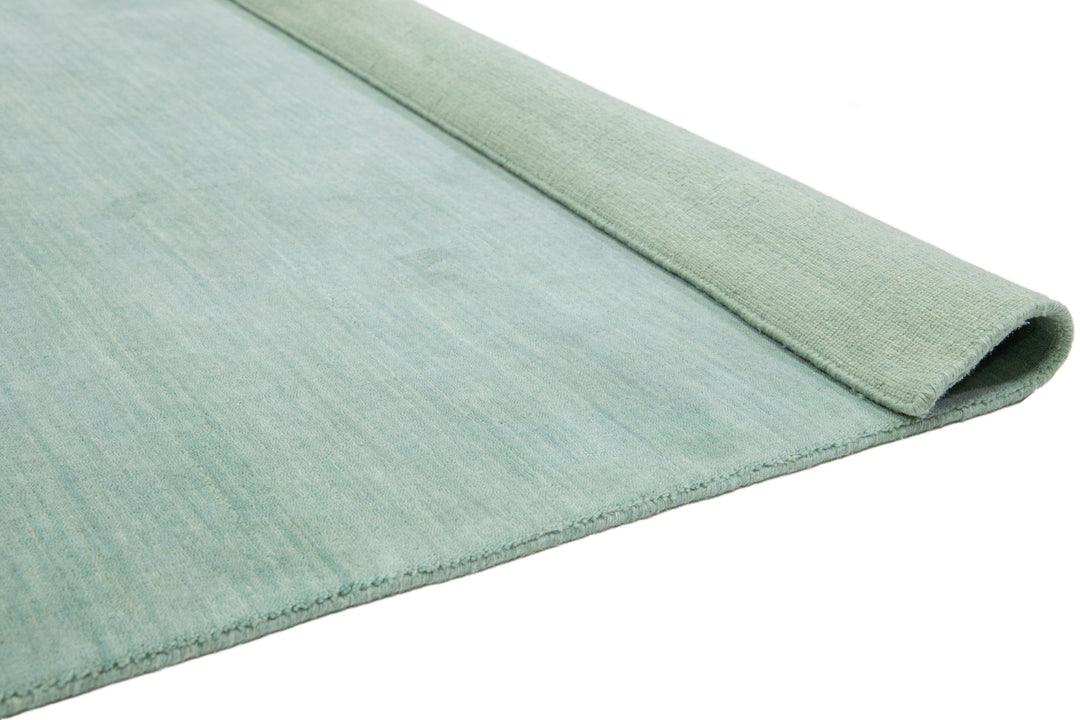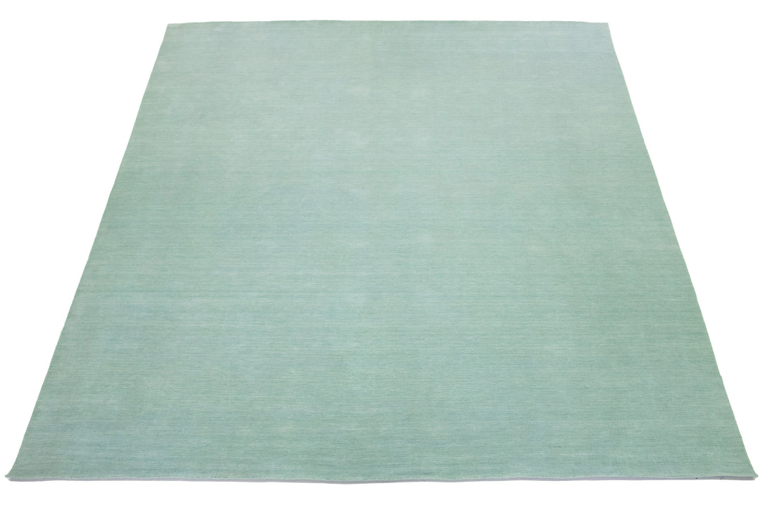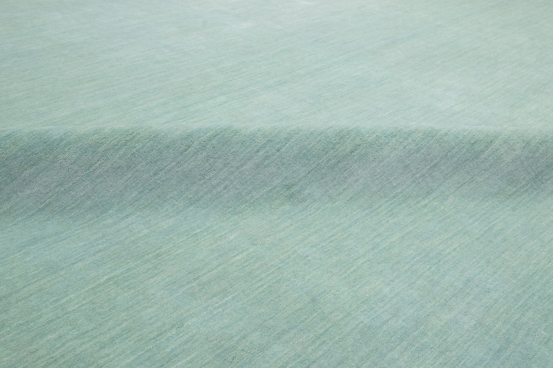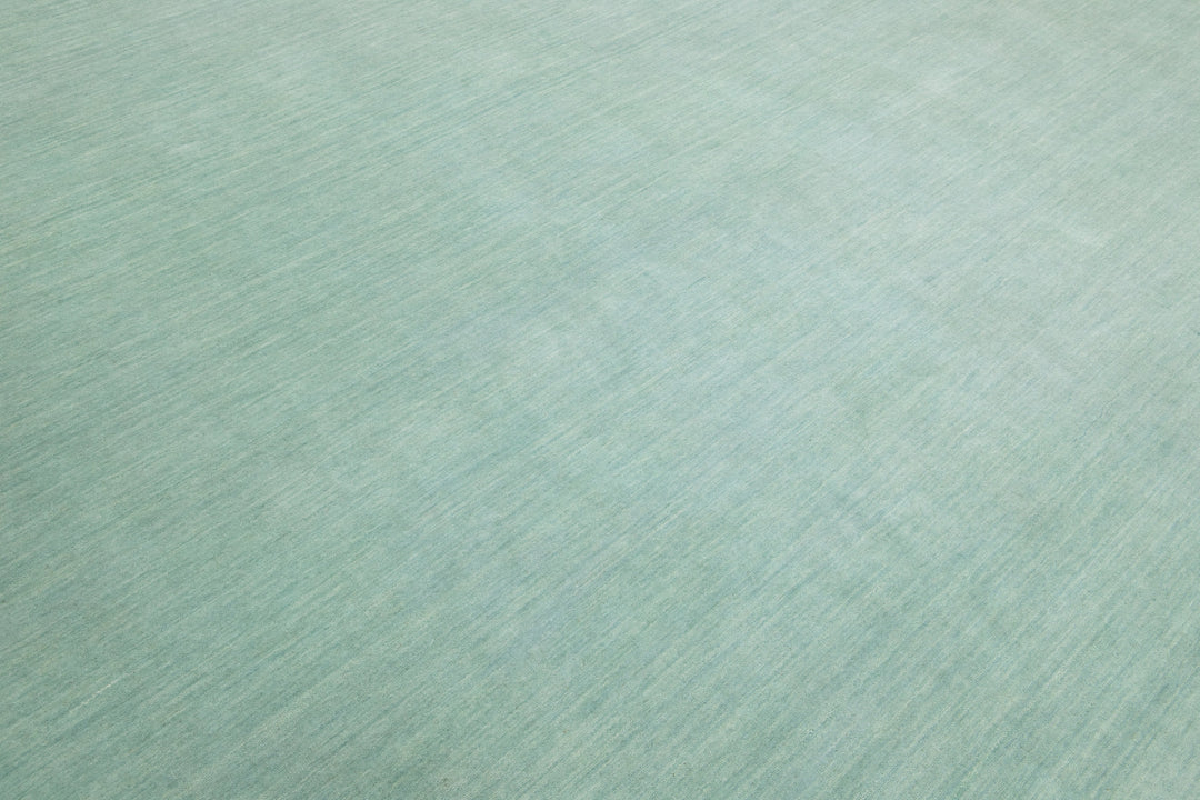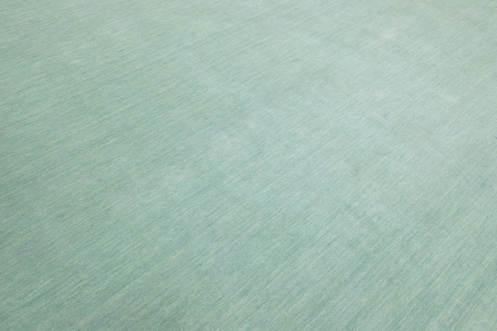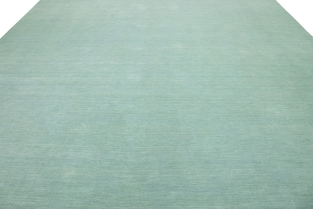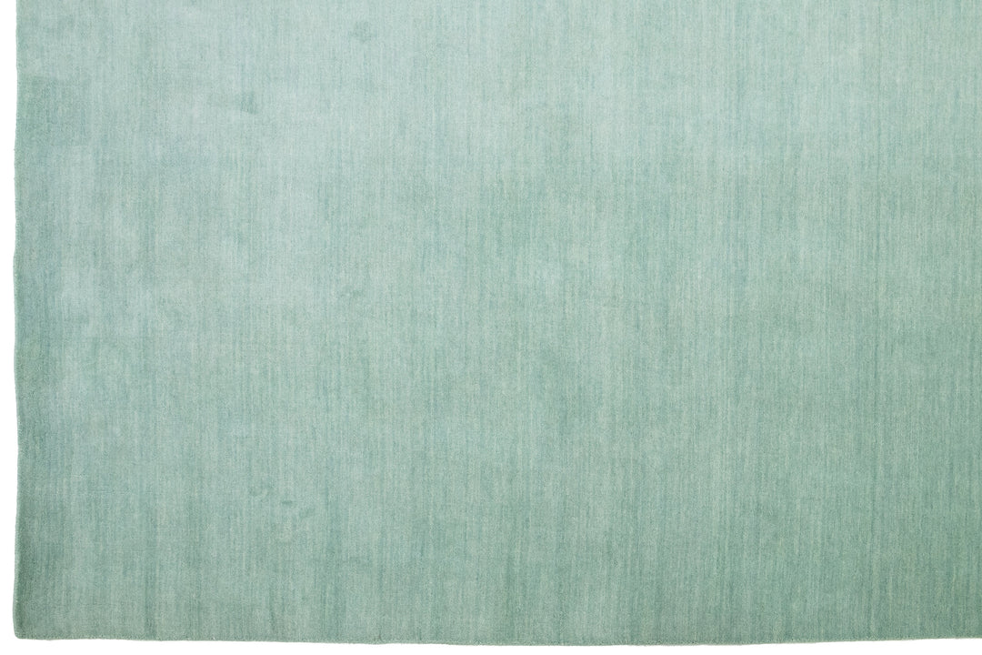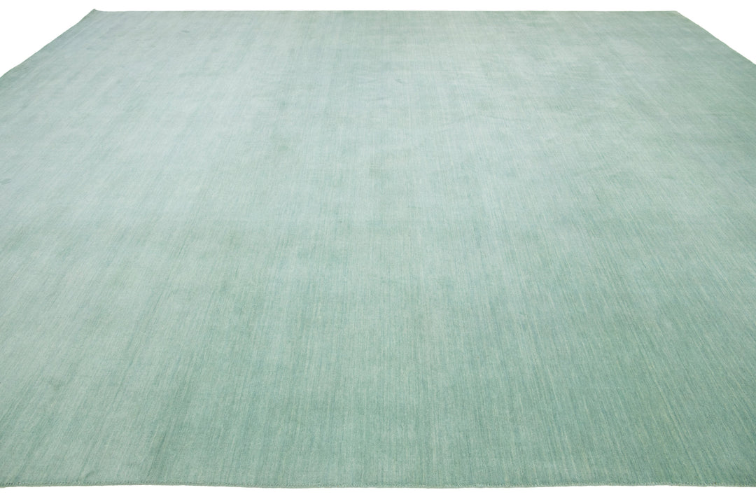 This handcrafted custom wool rug, designed in the Gabbeh style, features a solid light green design. It is part of our Desert Collection and comes in multiple colors. We use hand-loomed techniques for superior quality and longevity. The estimated lead time for customs is 15-20 weeks. This rug measures 12'4" x 15'5".