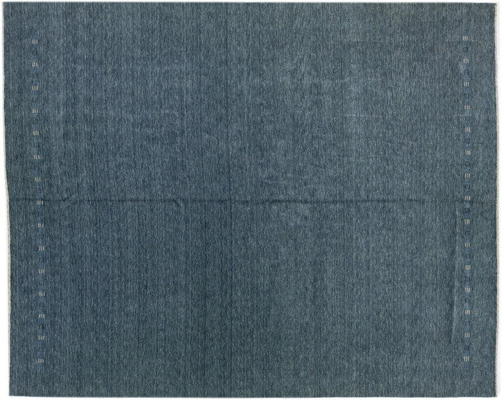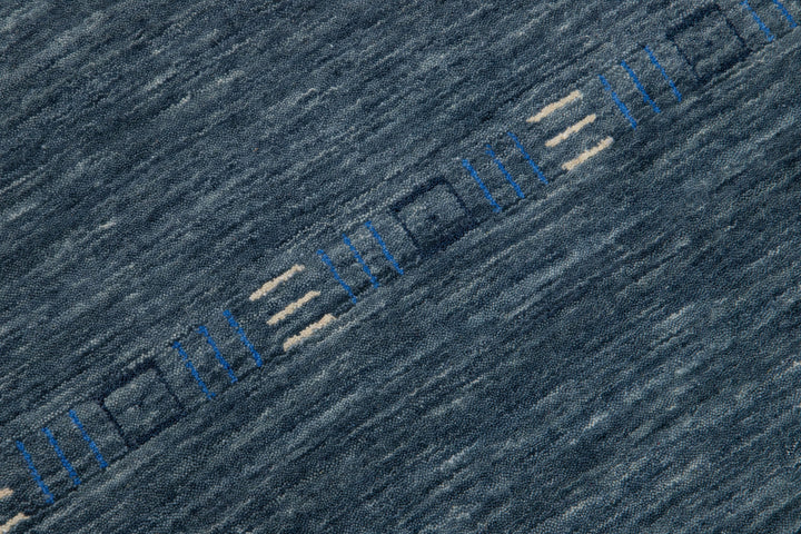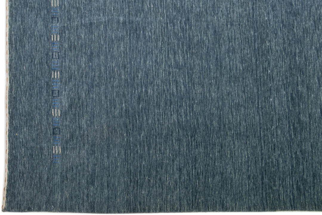 This wool rug is handcrafted in the Gabbeh style and features a sophisticated minimalist design. Its dark blue field provides a stunning backdrop for the subtle blue and white accents.