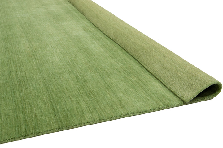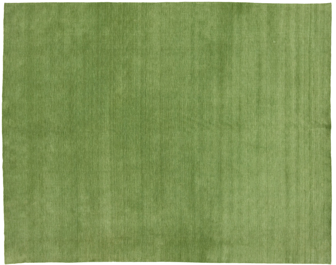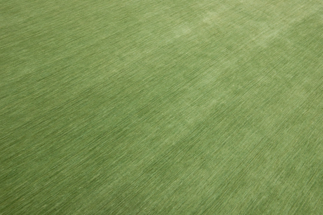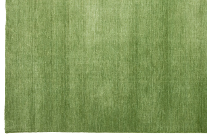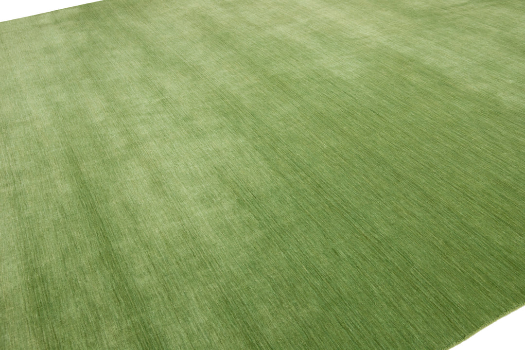 This handcrafted custom wool rug, designed in the Gabbeh style, features a solid light green design. It is part of our Desert Collection and comes in multiple colors. We use hand-loomed techniques for superior quality and longevity. The estimated lead time for customs is 15-20 weeks. This rug measures 12' x 15'2".