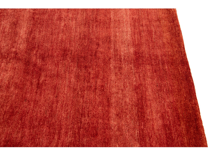 Beautiful modern Gabbeh-style hand-knotted wool rug with a red-rust color field. This piece has a gorgeous all-over solid design.