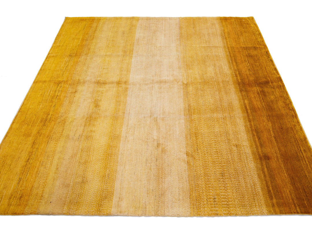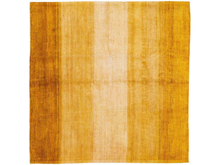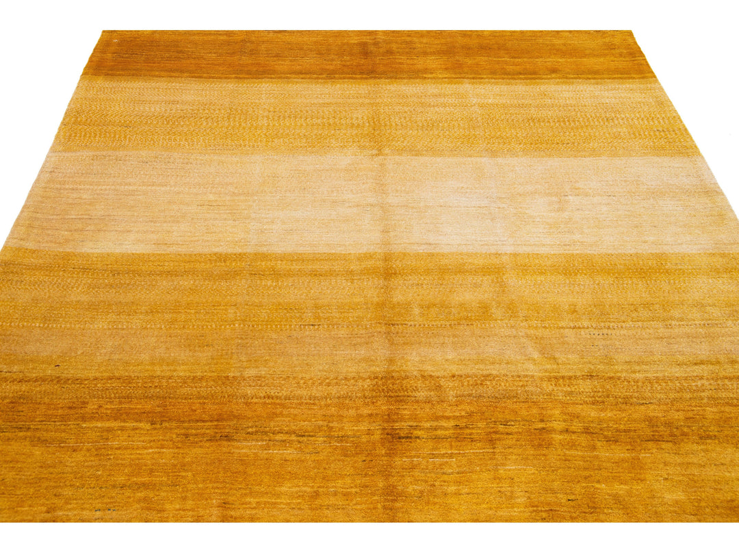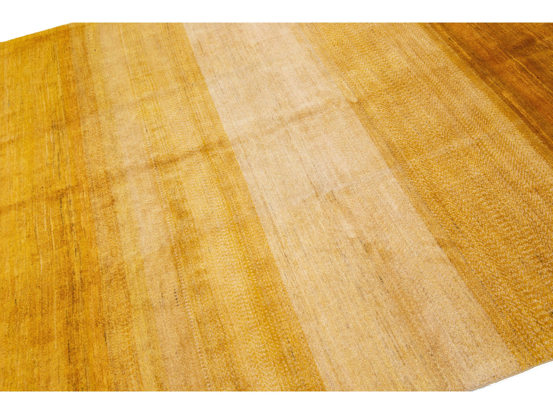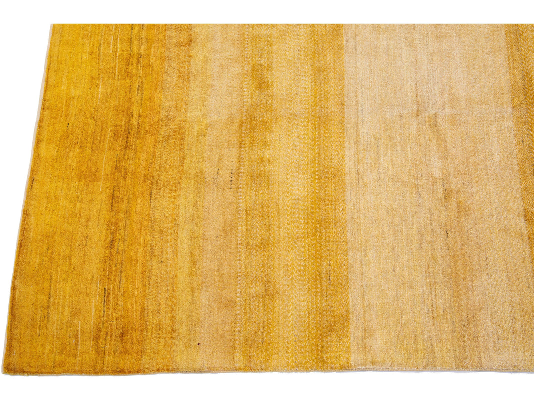 Beautiful modern Gabbeh-style hand-woven wool rug with goldenrod and beige color field and gorgeous geometric design.