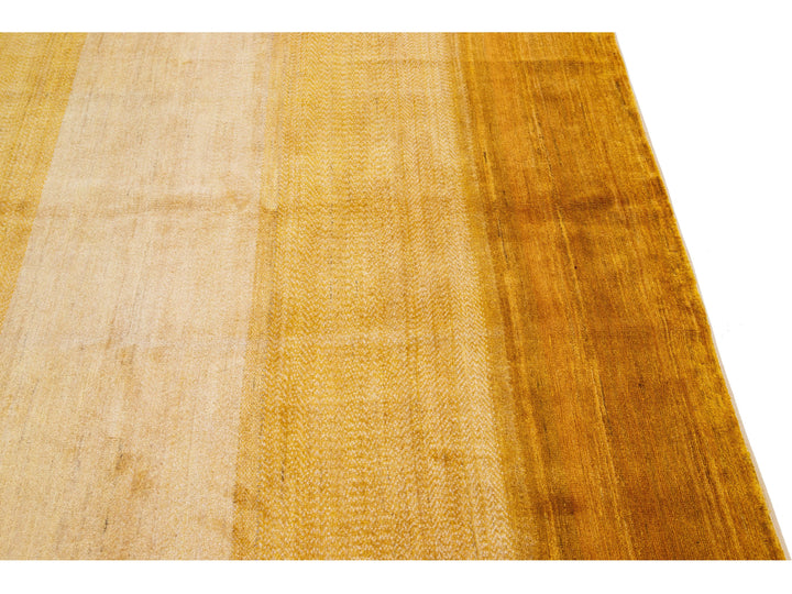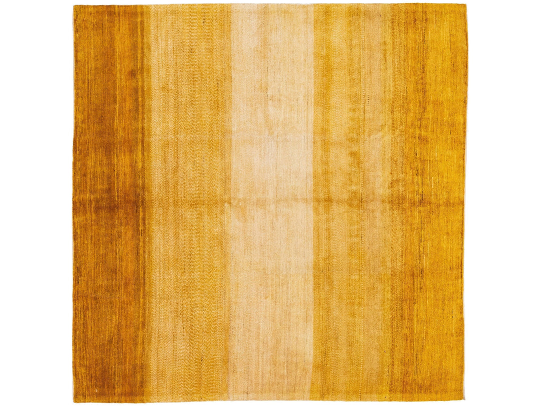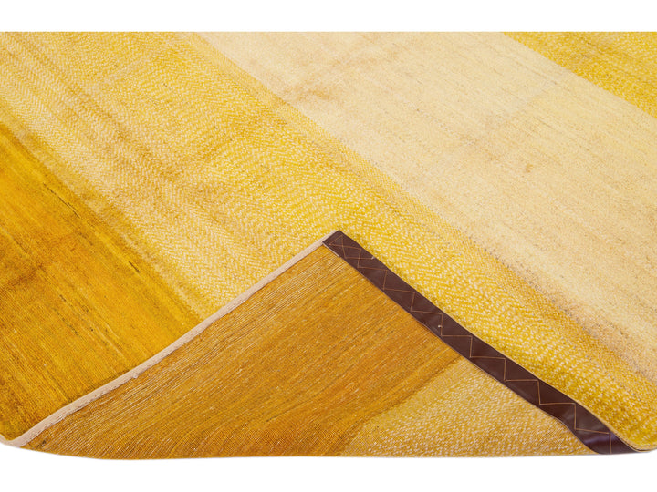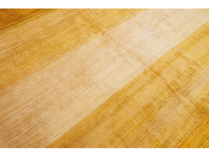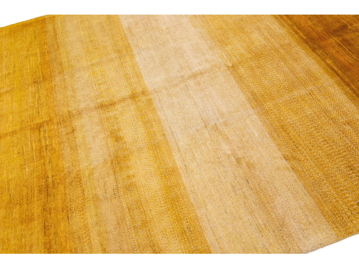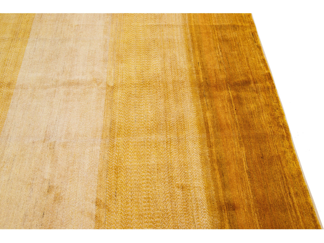Beautiful modern Gabbeh-style hand-woven wool rug with goldenrod and beige color field and gorgeous geometric design.