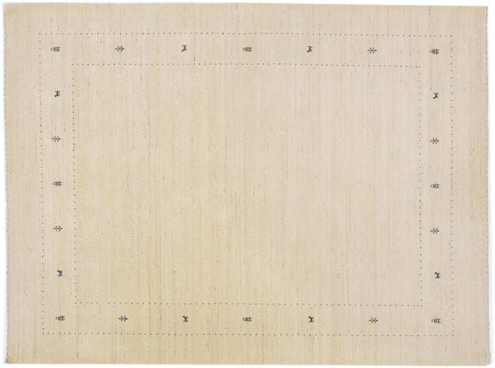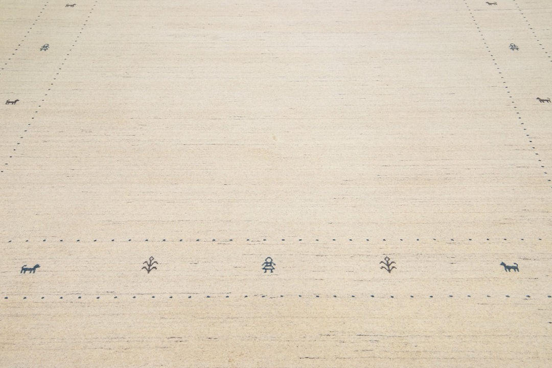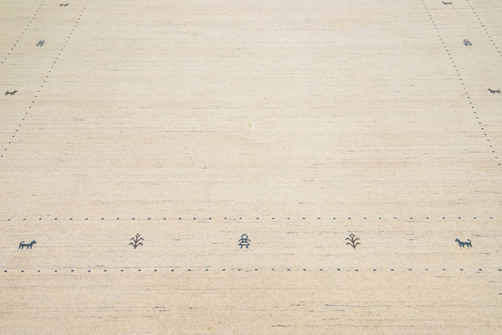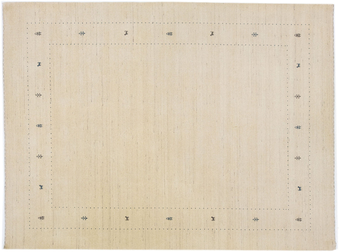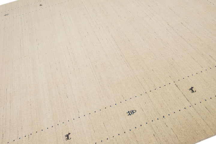 The contemporary appeal of this woolen rug, in the style of Gabbeh, lies in its minimalistic beige pattern and gray color field. The hand-woven piece is sure to catch the eye with its modern design.
