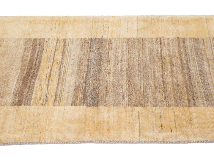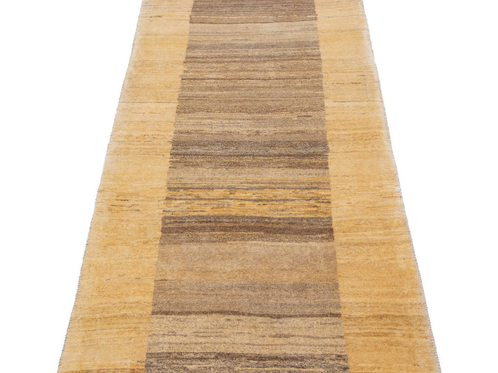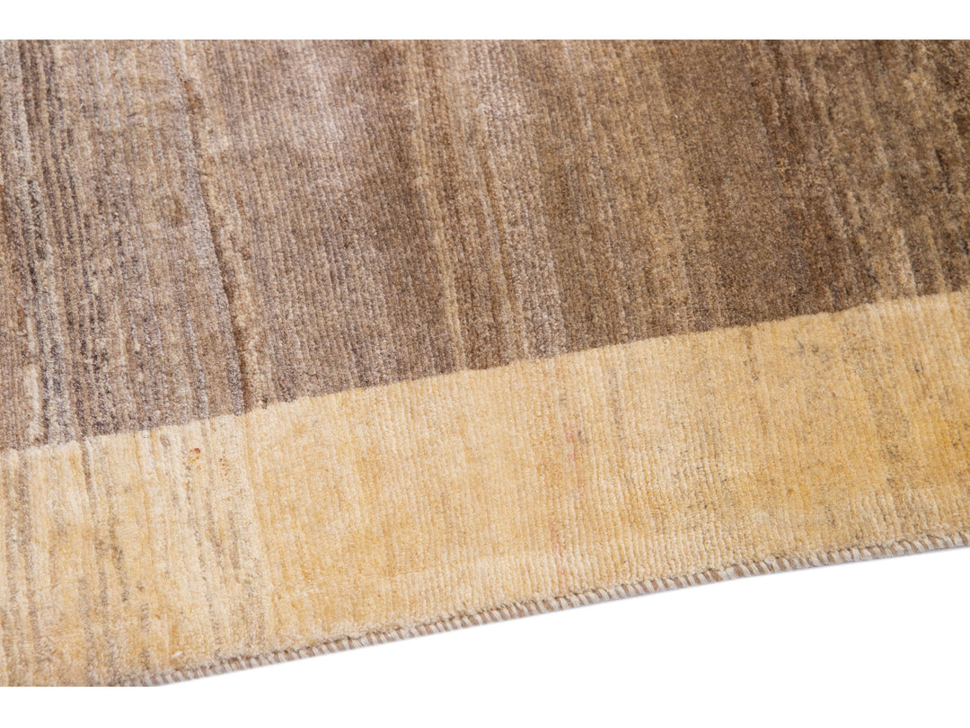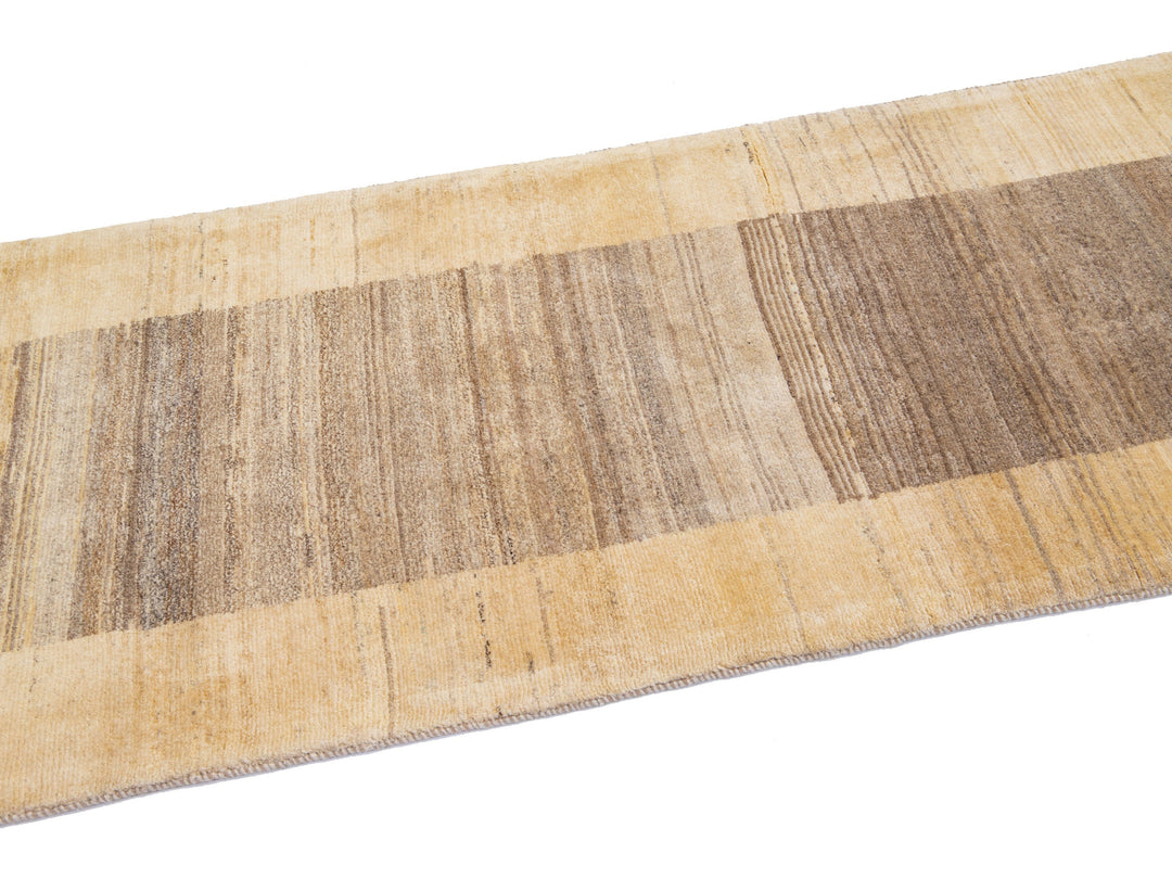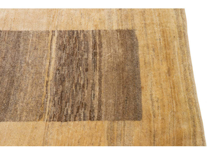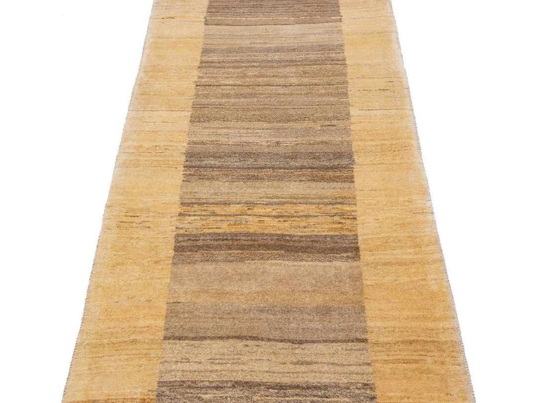Beautiful modern Gabbeh-style hand-woven wool runner with a brown color field. This piece has beige accents in a gorgeous geometric design.