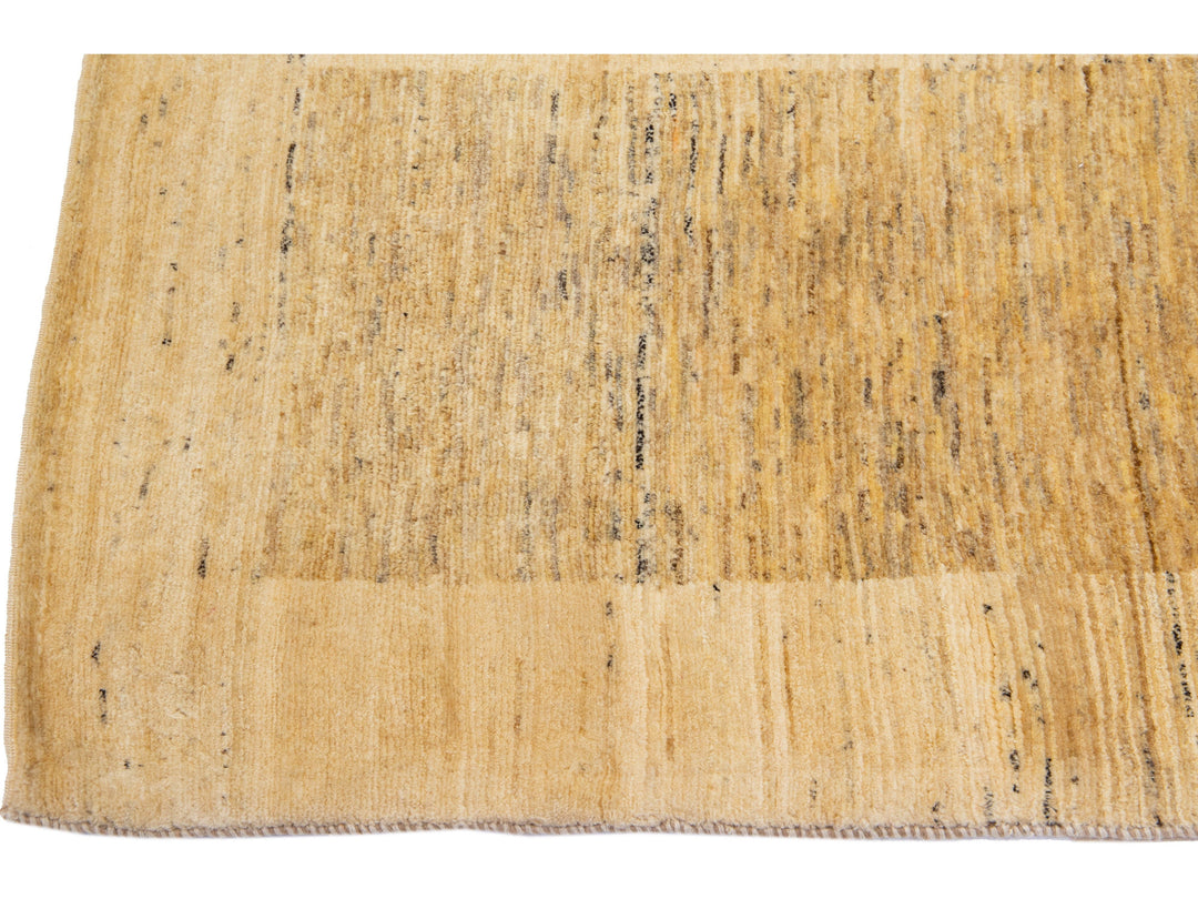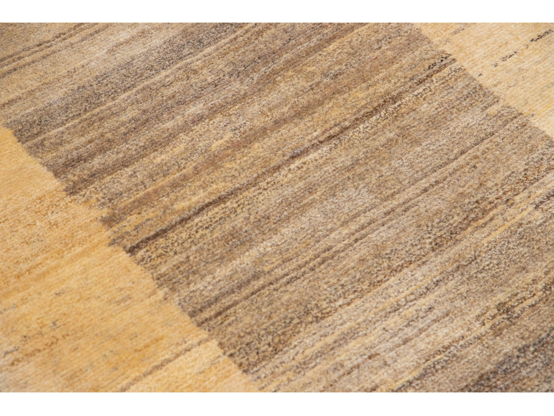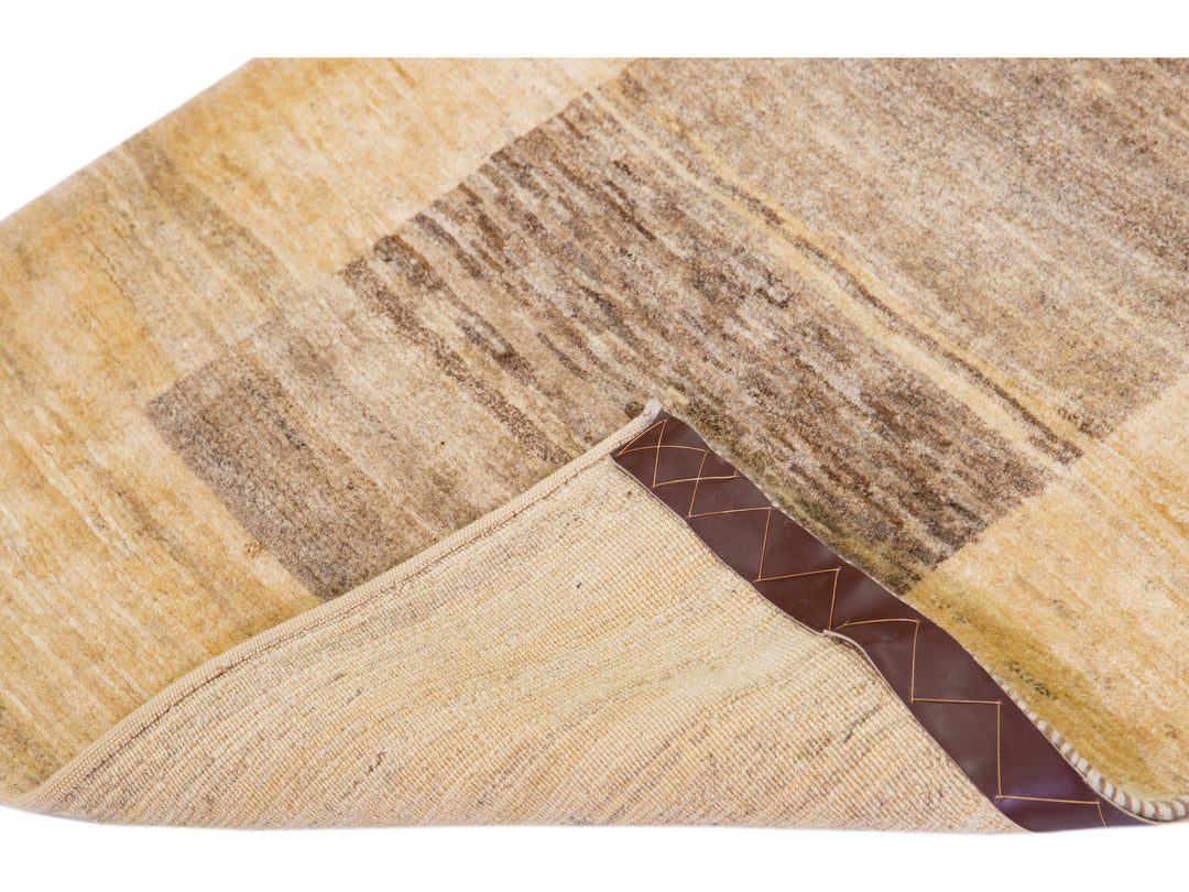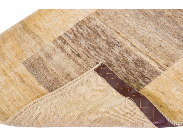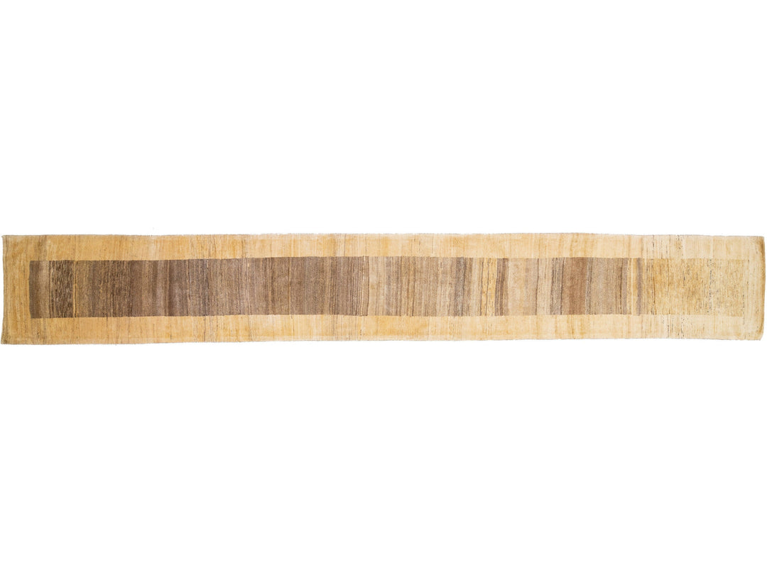 Beautiful modern Gabbeh-style hand-woven wool runner with a brown color field. This piece has beige accents in a gorgeous geometric design.
