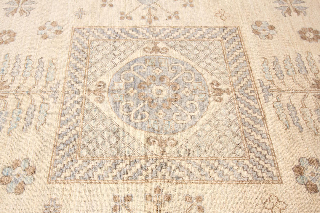 Beautiful Contemporary Oversize Khotan-Style Rug, hand-knotted wool with a tan field, blue accents in a center medallion design.