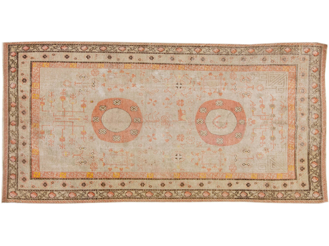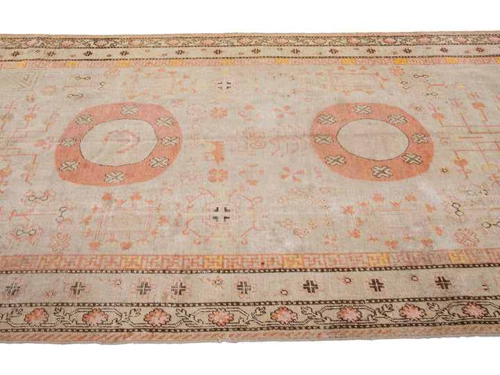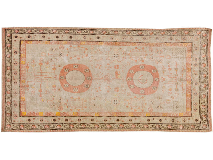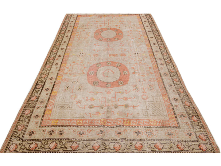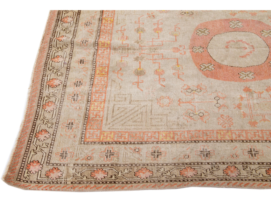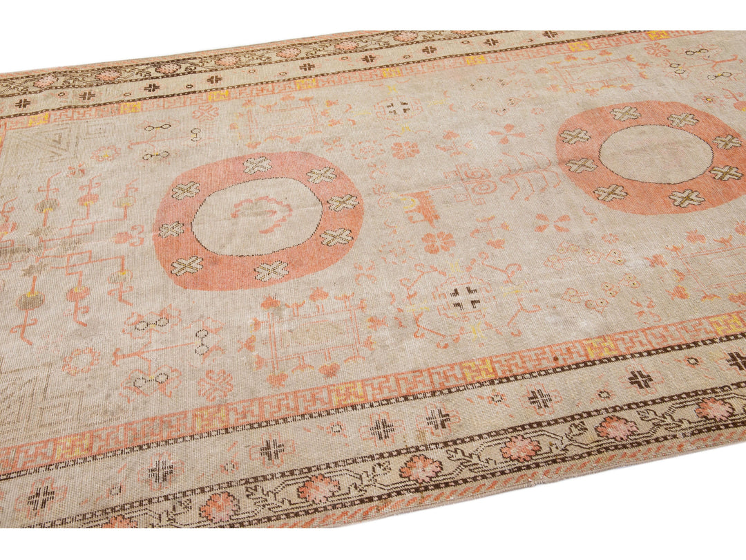 Beautiful antique Khotan hand-knotted wool rug with a beige color field. This Khotan rug has brown, yellow, and peach accents in a geometric multi-medallion design.