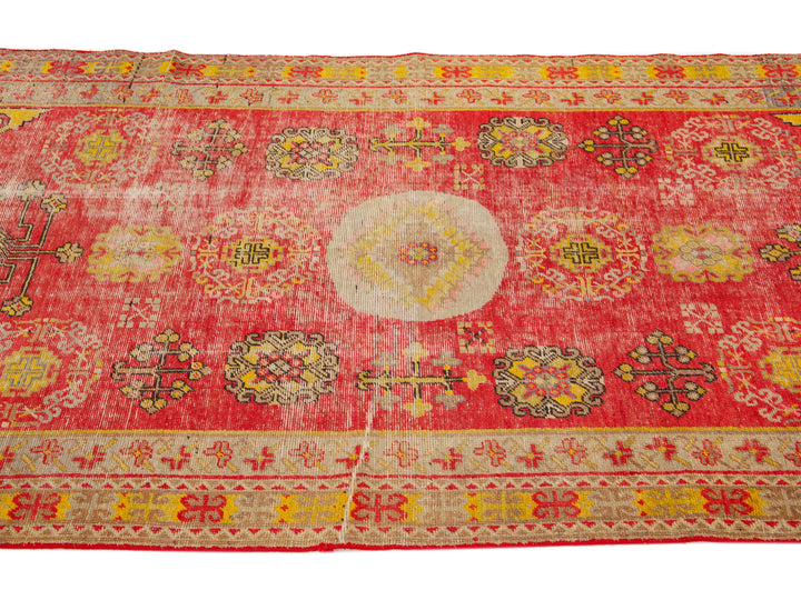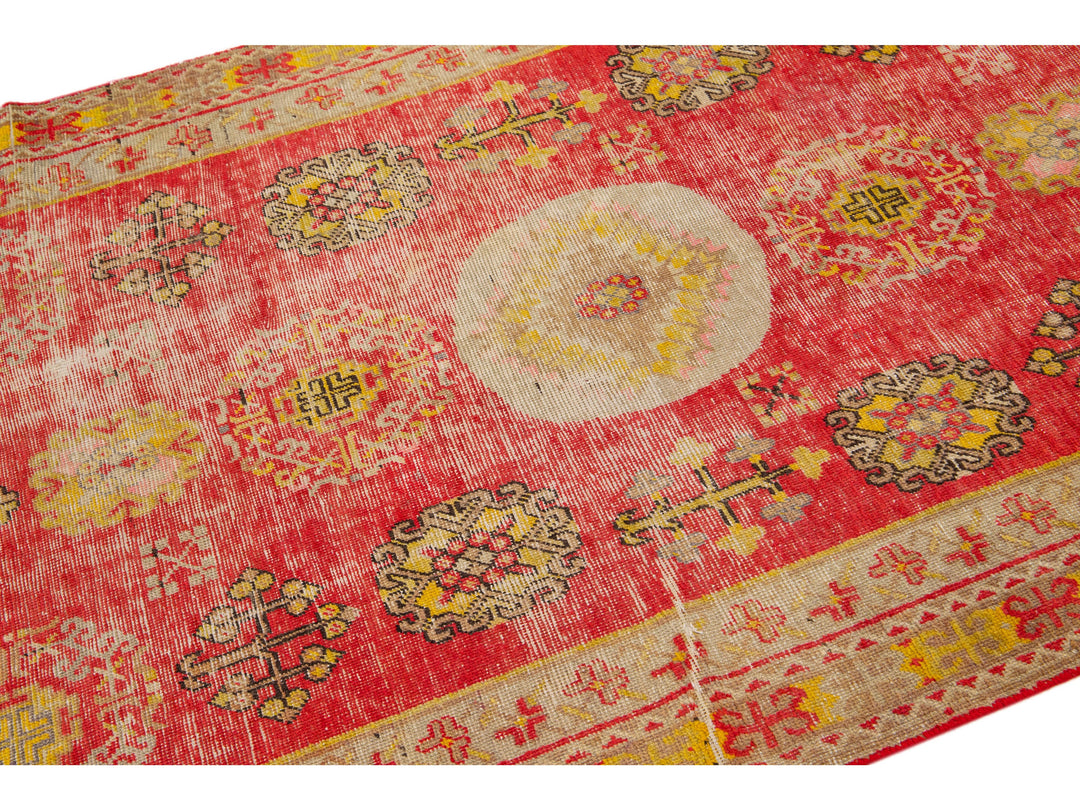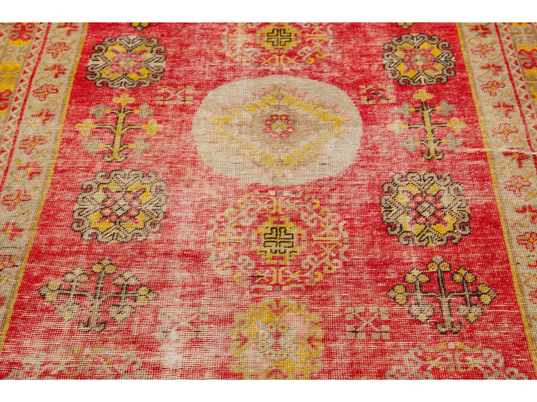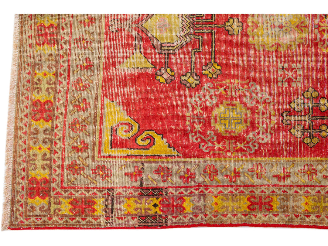 Beautiful Antique Turkish Khotan Hand-knotted wool runner with a red field. This Khotan runner has yellow, peach, and brown accents in a gorgeous all-over medallion floral motif design.