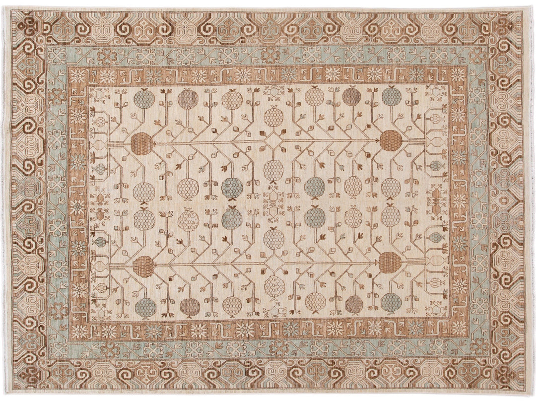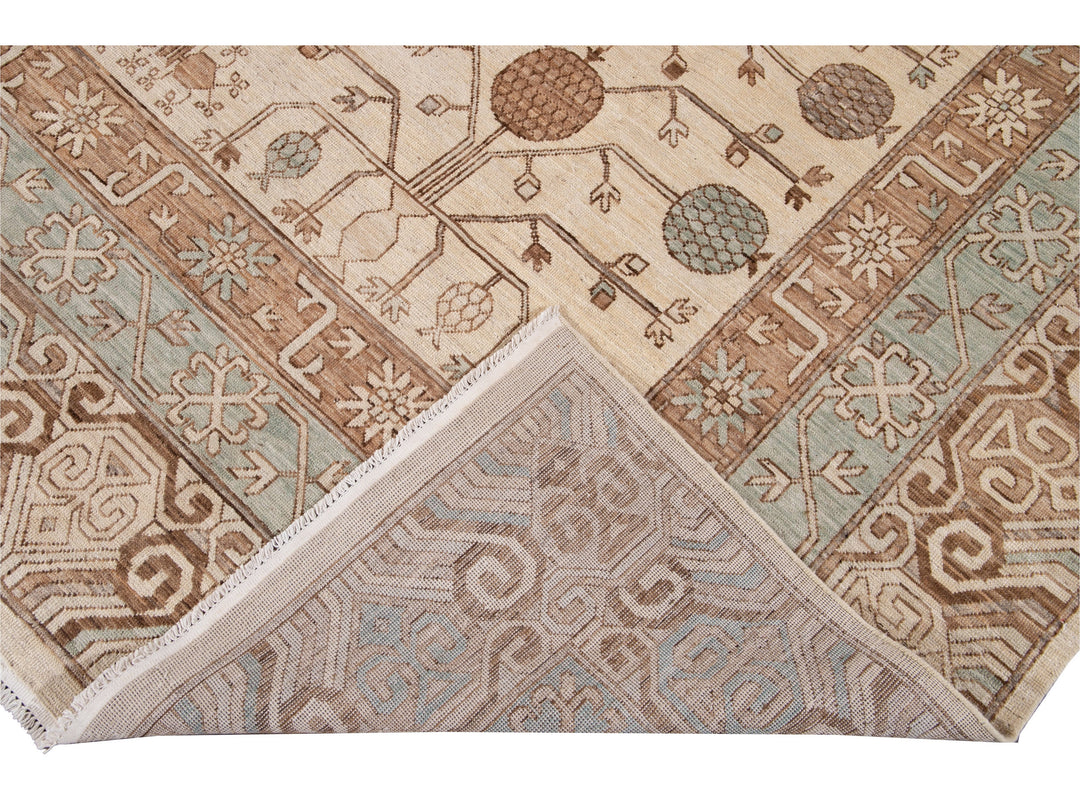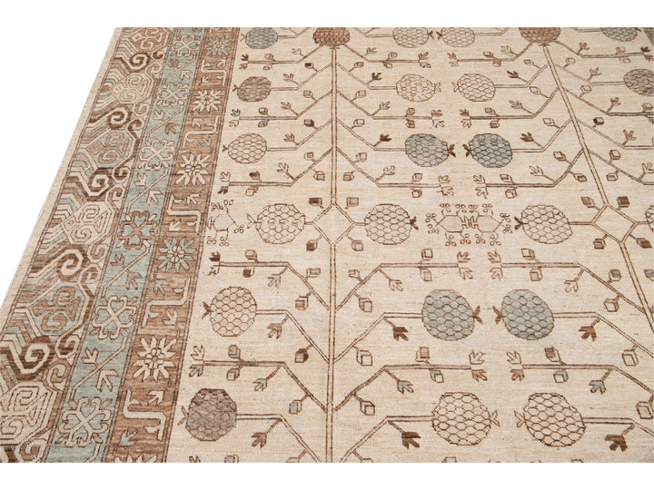 Beautiful Modern Khotan style hand-knotted wool rug beige field. This Khotan-style rug has a beautifully designed frame and accent of blue, beige, and brown in a gorgeous all-over geometric floral design.