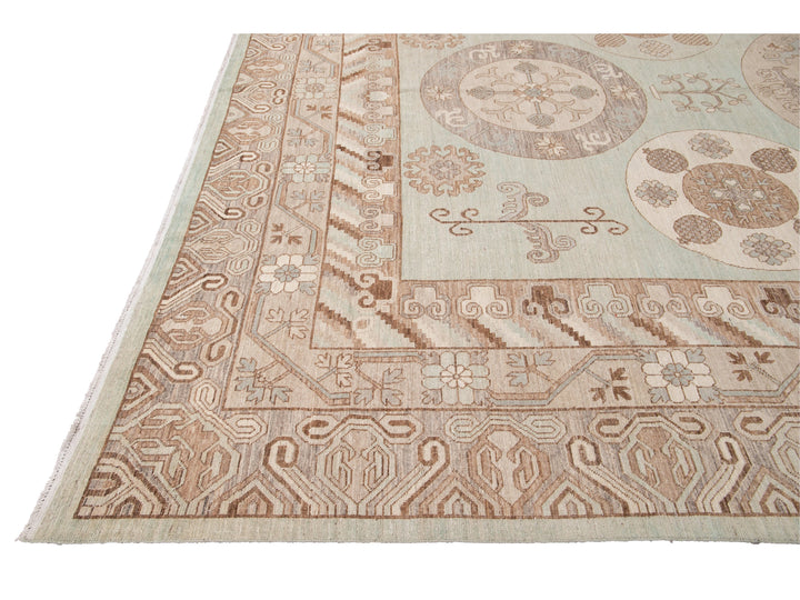 Beautiful Modern Oversize Khotan style hand-knotted wool rug green field. This Khotan-style rug has a beautifully designed frame and accent of blue, beige, and brown in a gorgeous all-over geometric medallion floral design.
